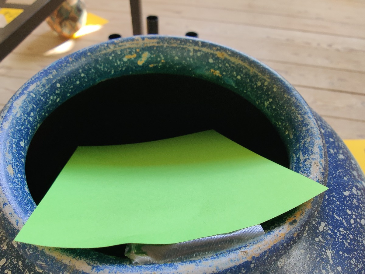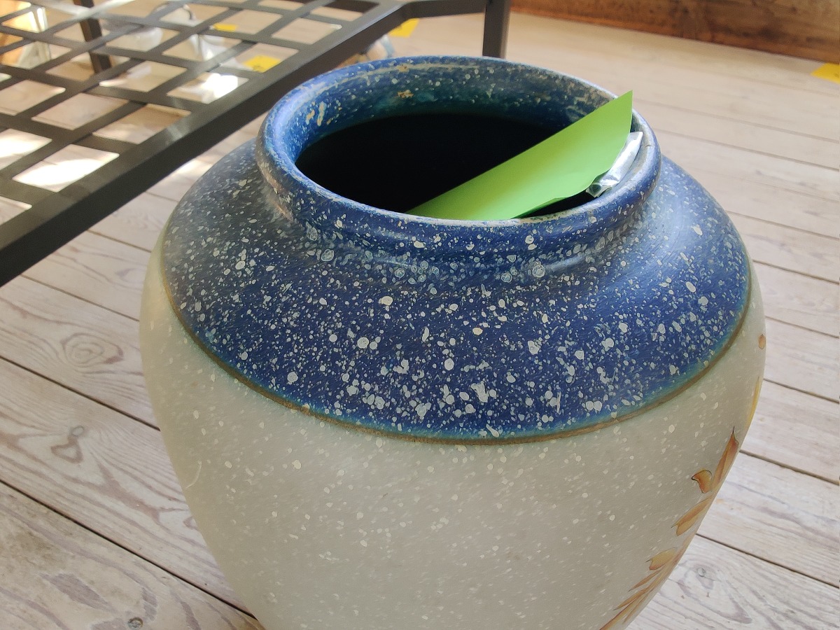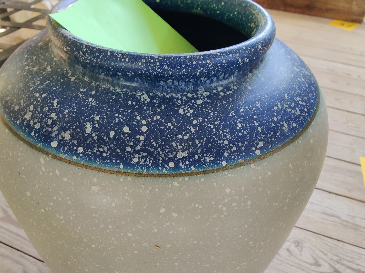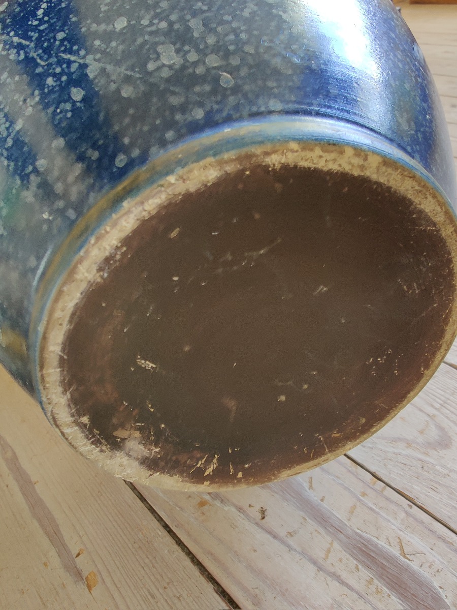 Ældre gulvvase i blå og grå med gylden blomst. Ca. H: 33 cm. Ø: 25 cm. Med alm. bruggspor.