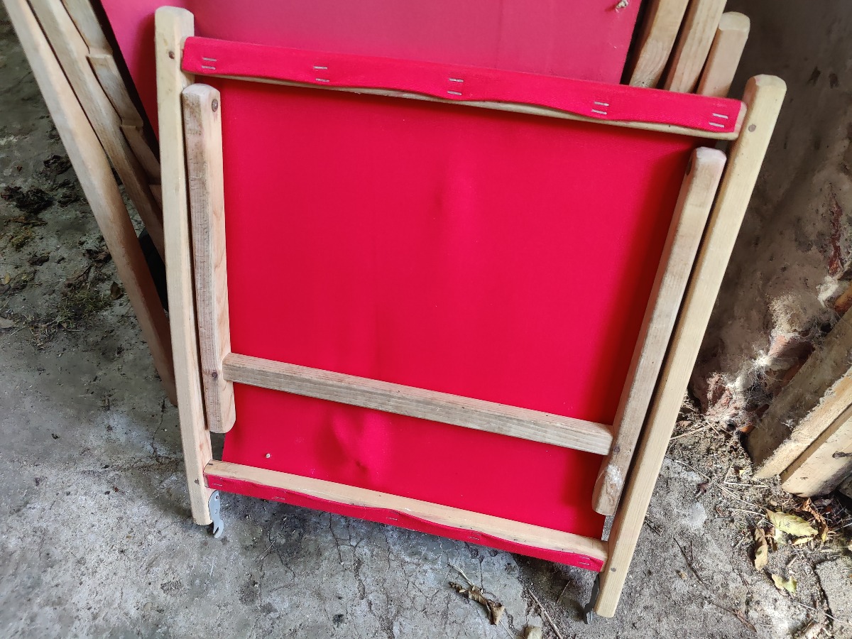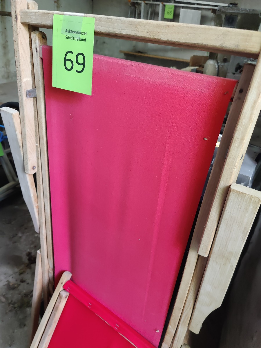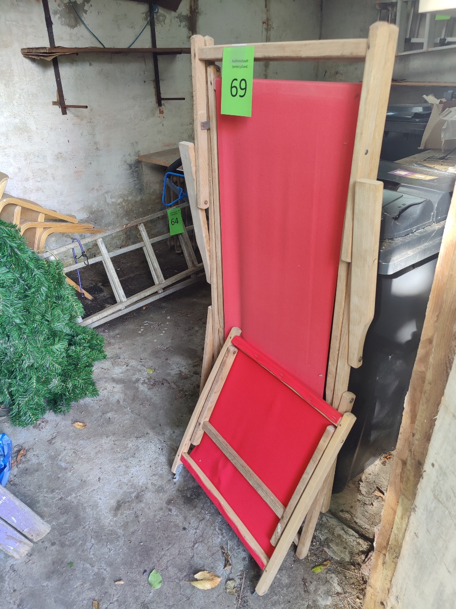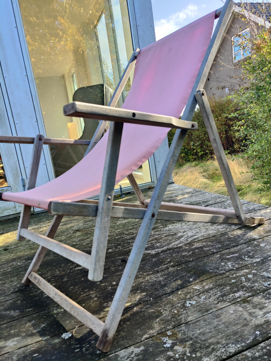 Gammeldags solstole med løs benstøtte.Fremstår med delvis solfalmet stof.