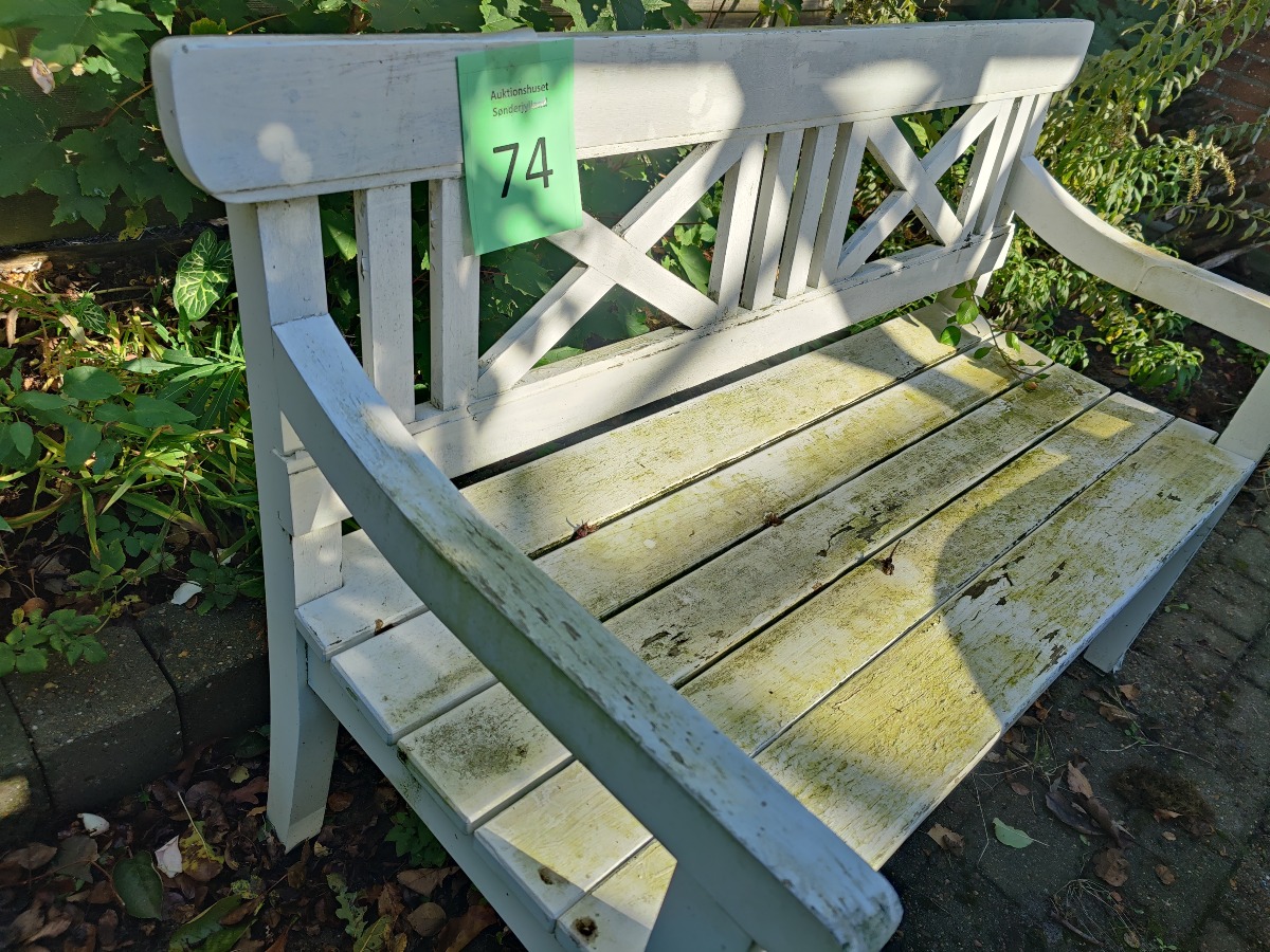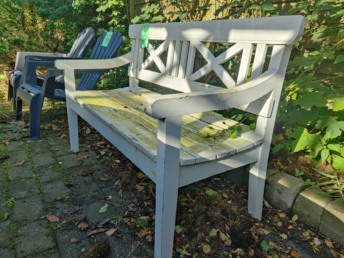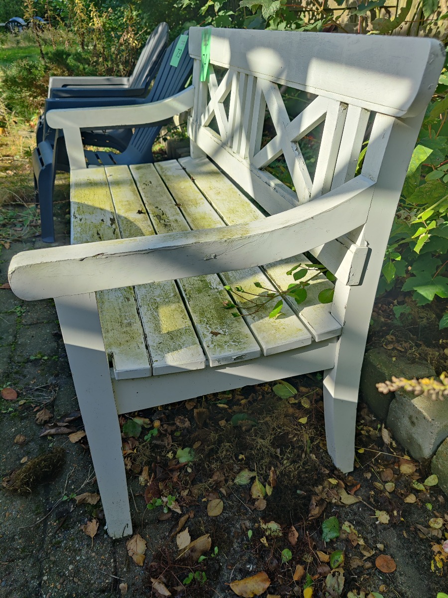 Havebænk af hvidmalet træ. Fremstår patineret.