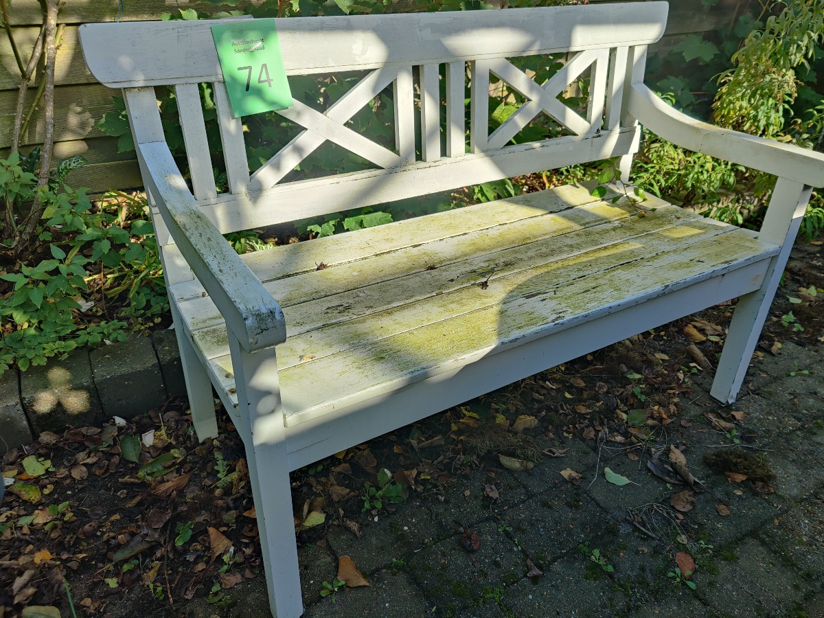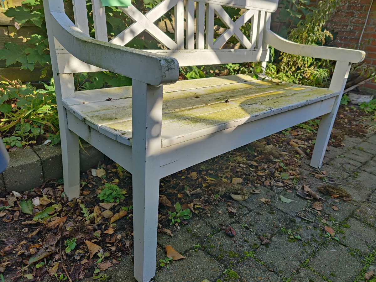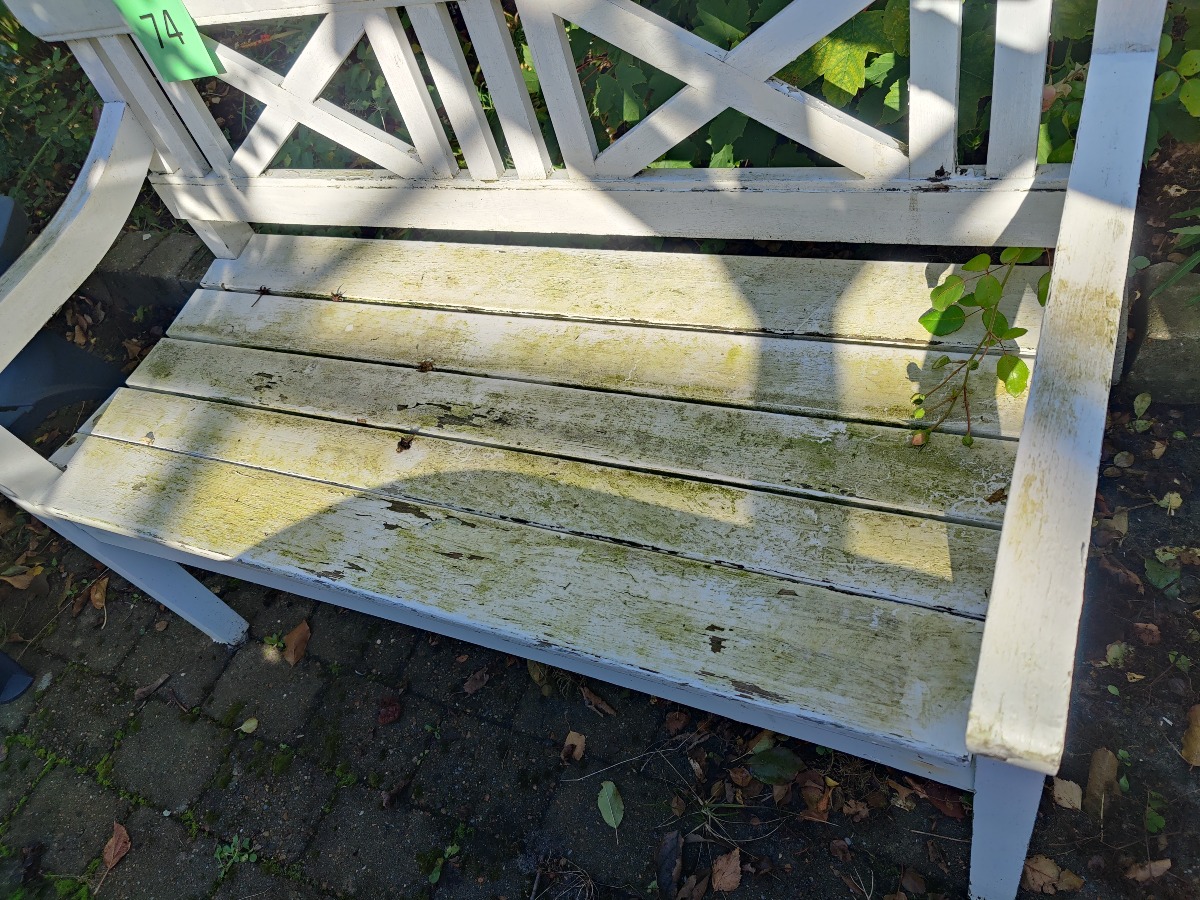 Havebænk af hvidmalet træ. Fremstår patineret.