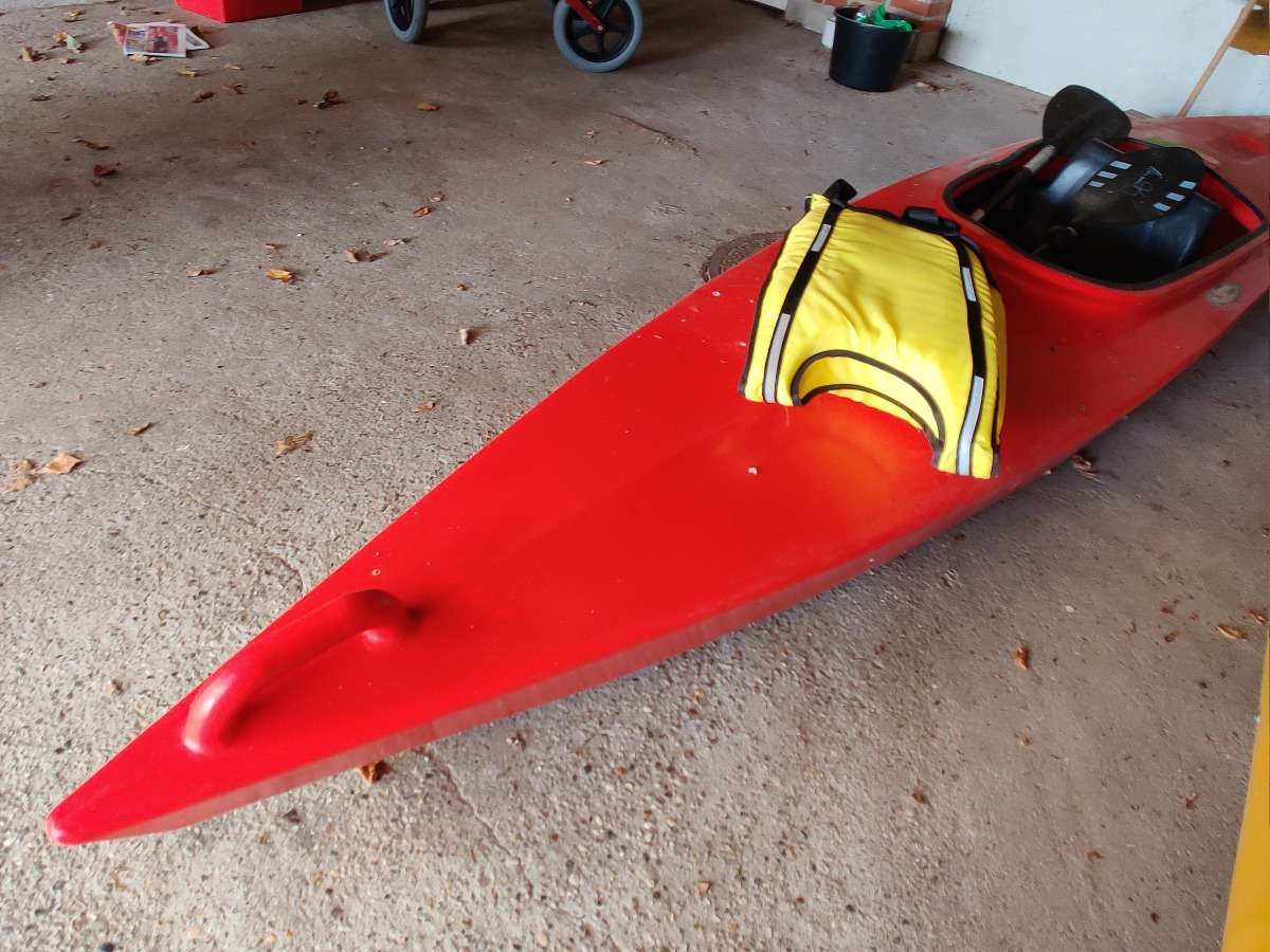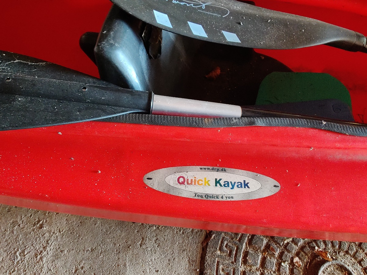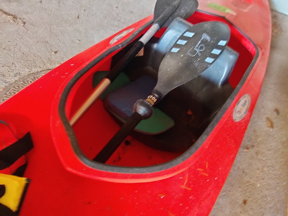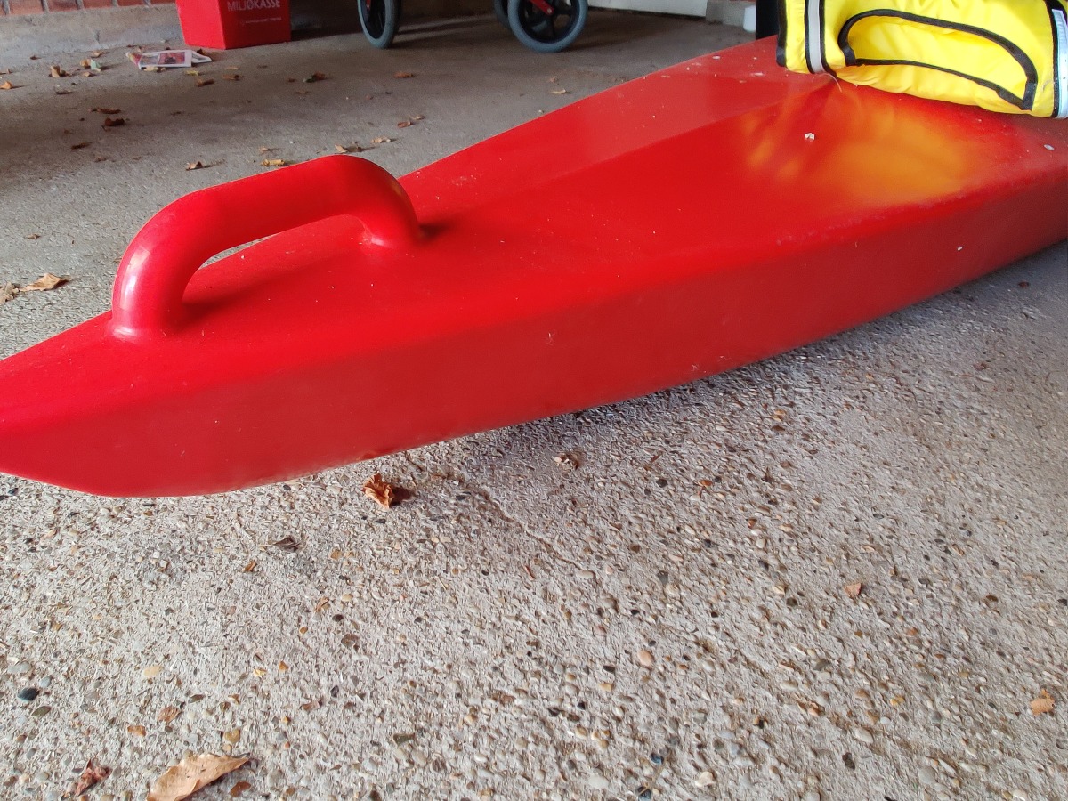 Kajak af rød plast. Med pagajer samt redningsvest. pæn stand.