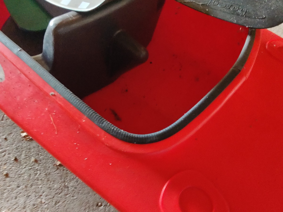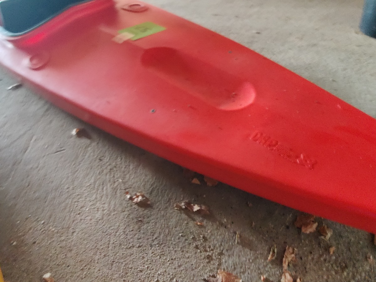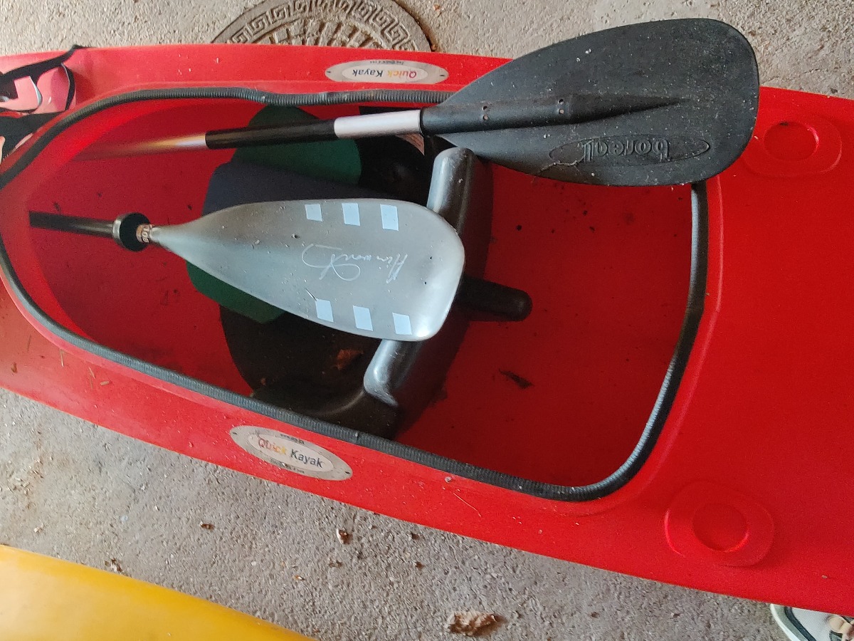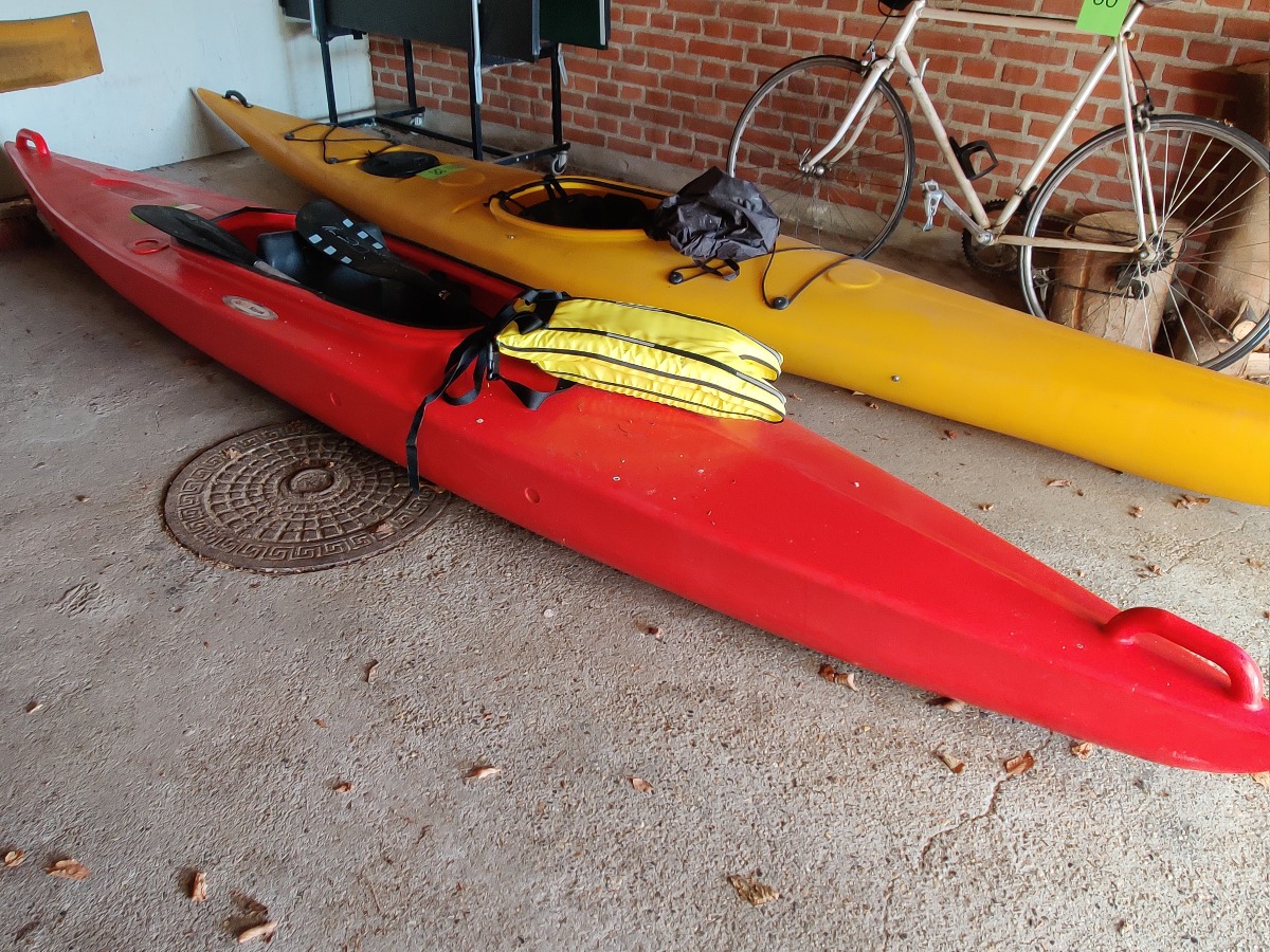 Kajak af rød plast. Med pagajer samt redningsvest. pæn stand.
