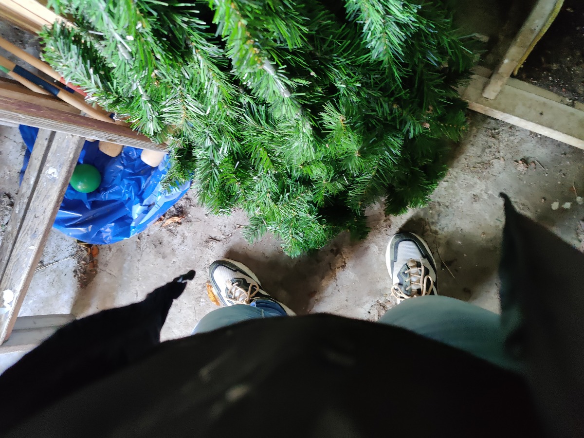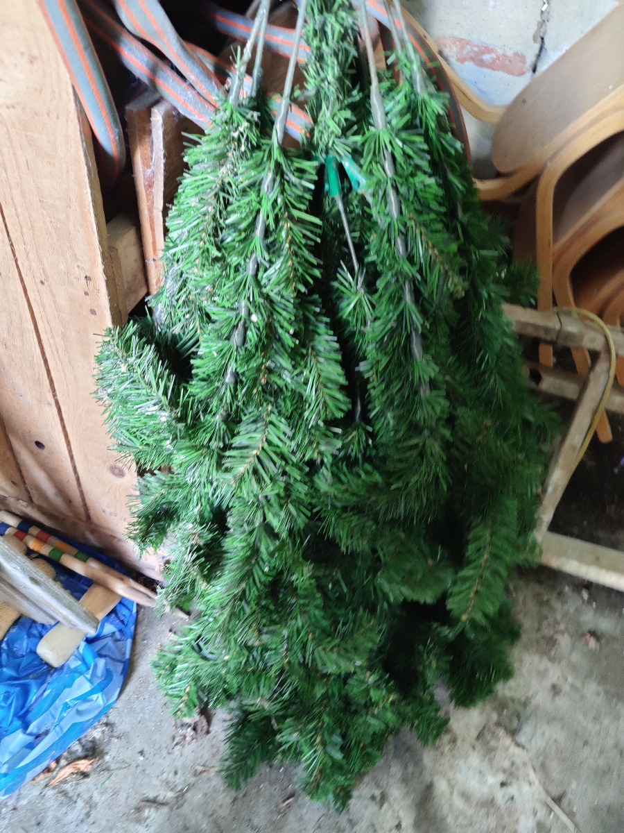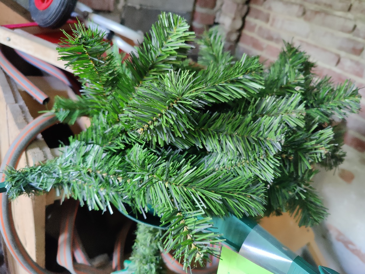 Plastjuletræ med defekt fod. H. ca. 150 cm.