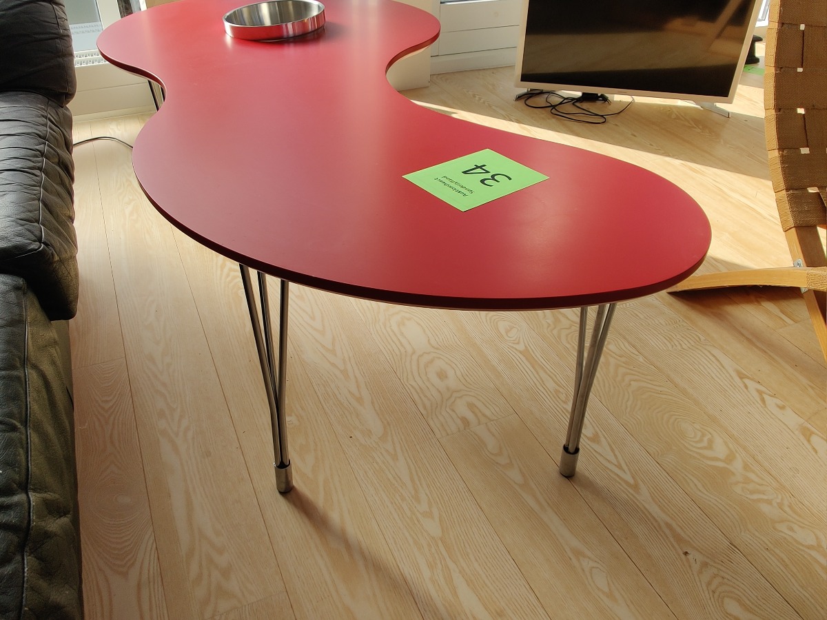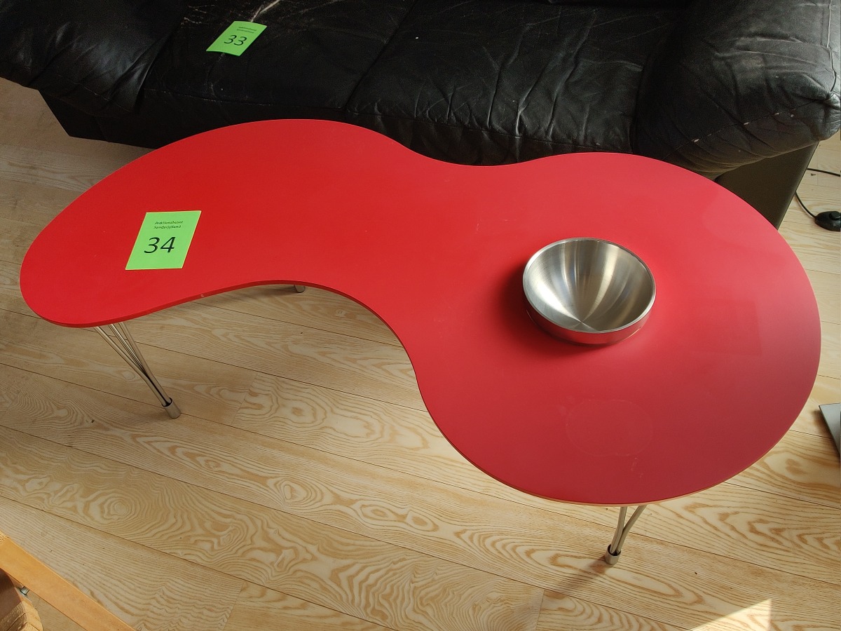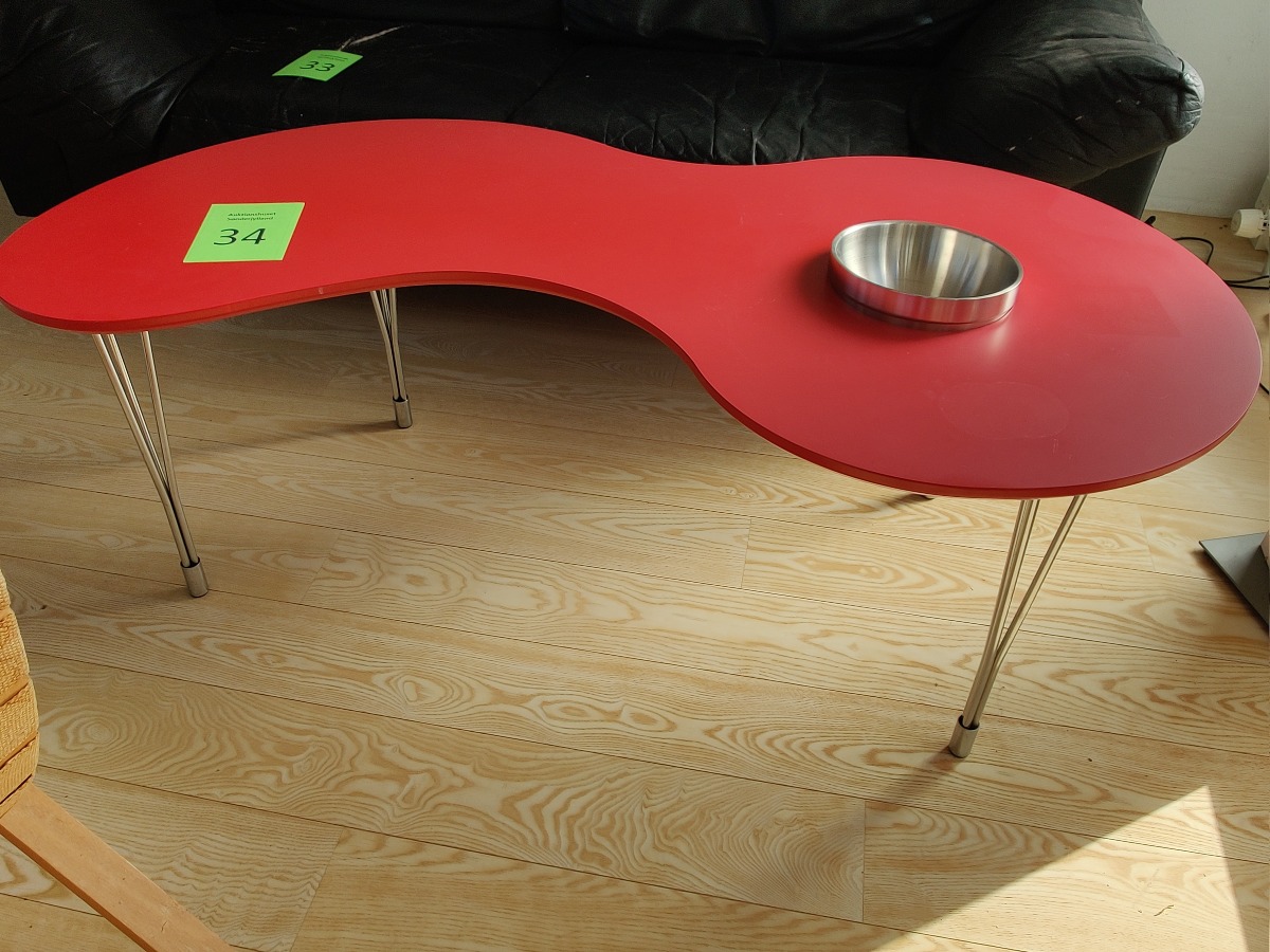 Sofabord i organisk form. Bordplade med rød melamin på stålben. Hul i bordplade med tilhørende skål i rustfrit stål. Antageligt fra Ilva. H. 45, L. 105, B. 55 cm.
