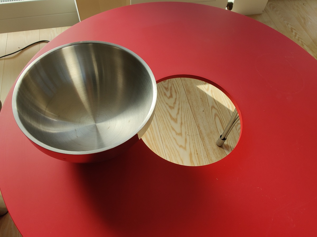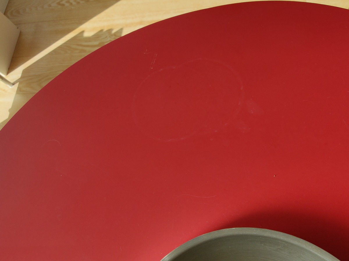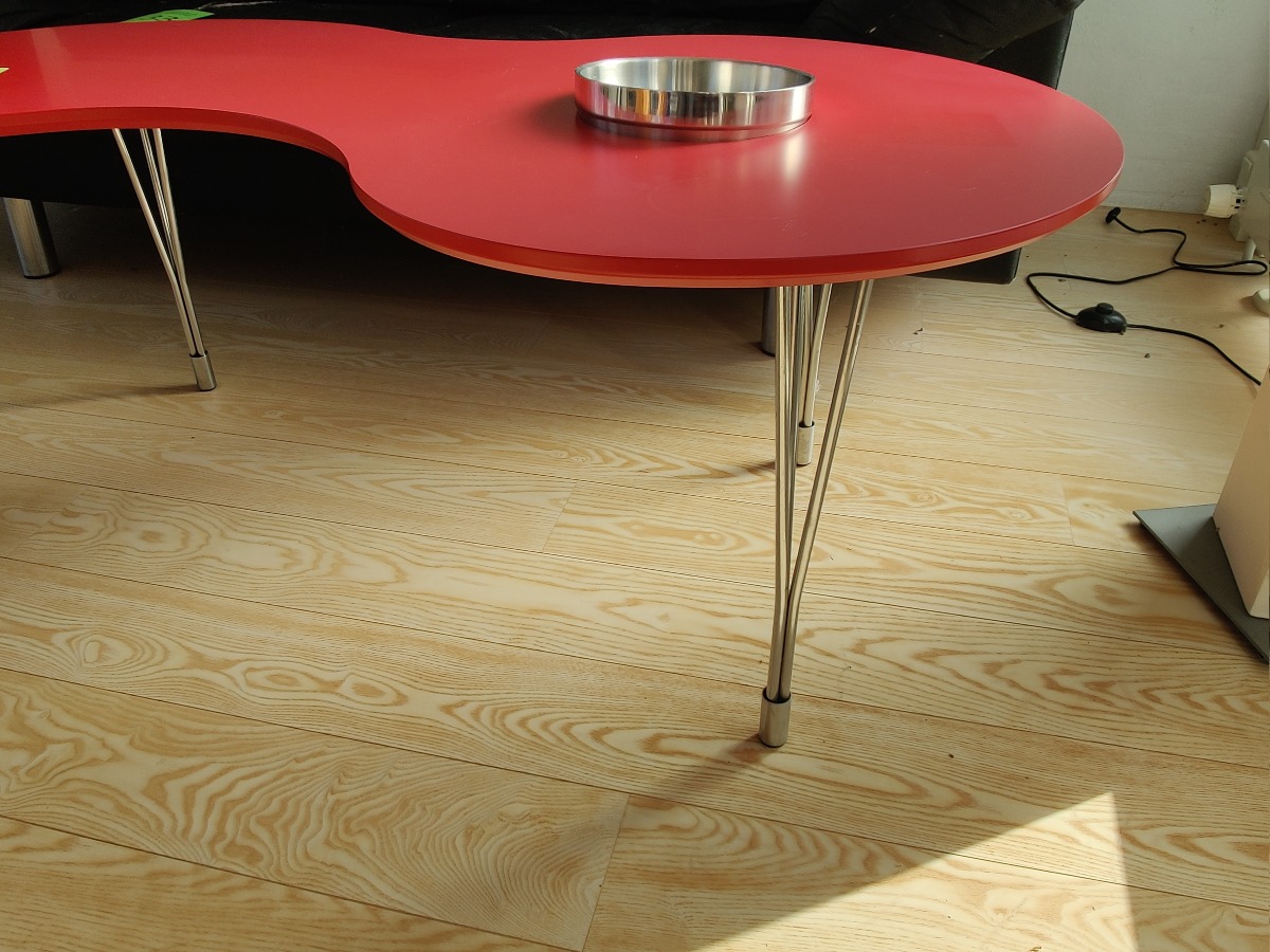 Sofabord i organisk form. Bordplade med rød melamin på stålben. Hul i bordplade med tilhørende skål i rustfrit stål. Antageligt fra Ilva. H. 45, L. 105, B. 55 cm.