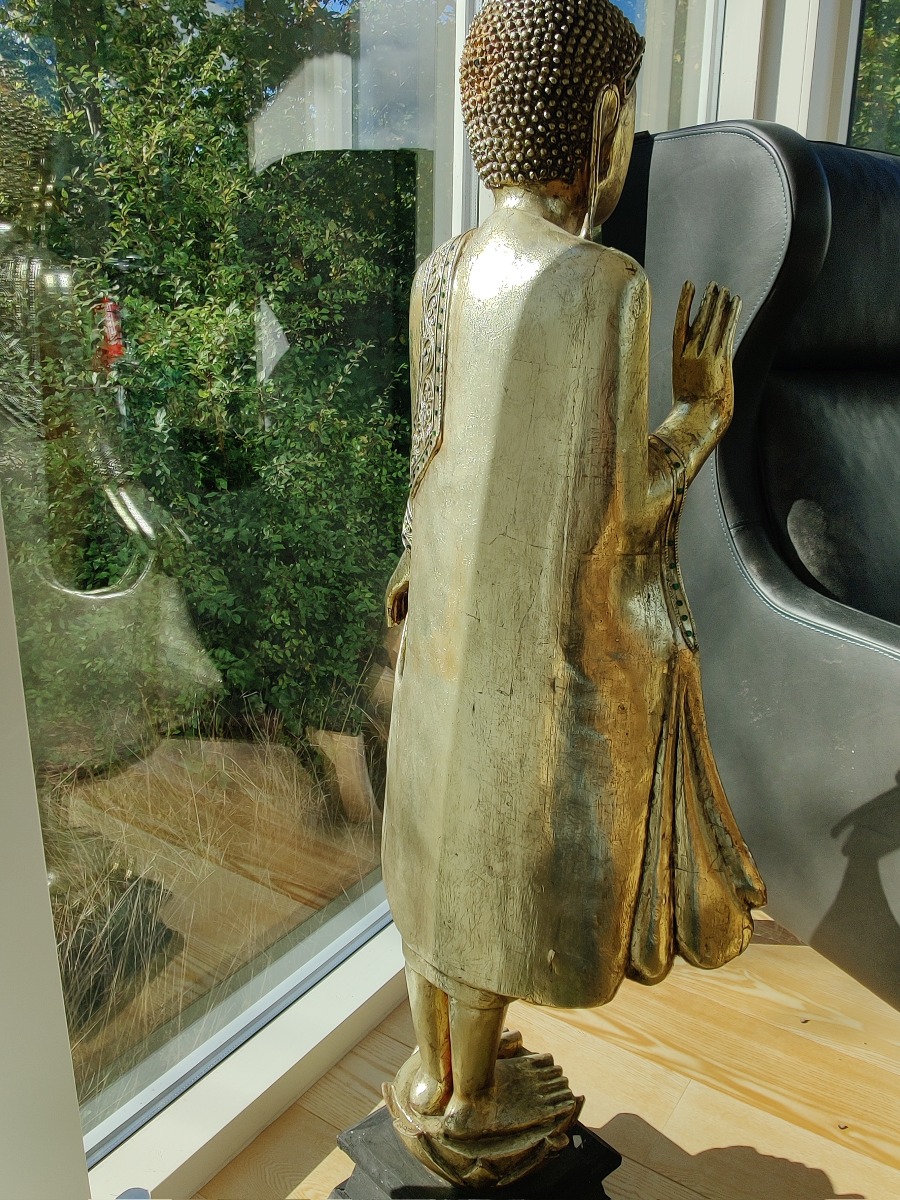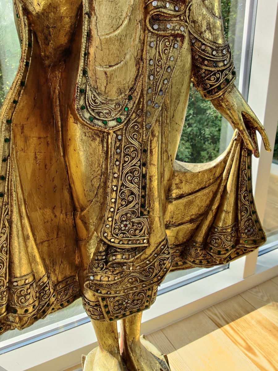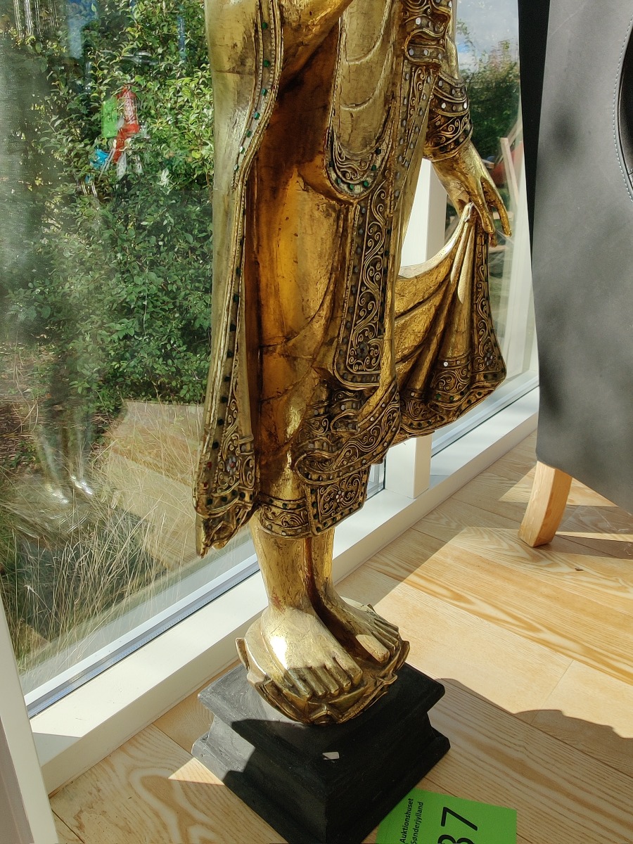 Stående Thailandsk Buddha af forgyldt træ med glasdekorationer. H: 92 cm. Fod 18 x 18 cm.