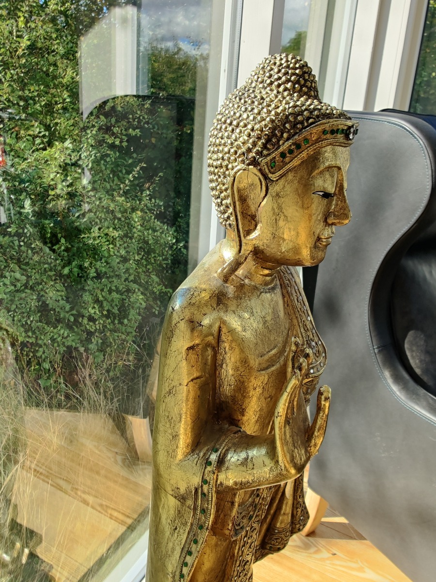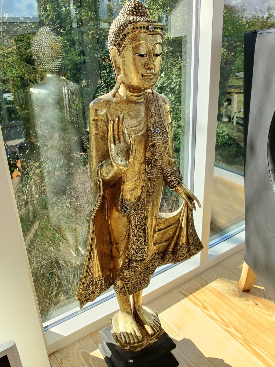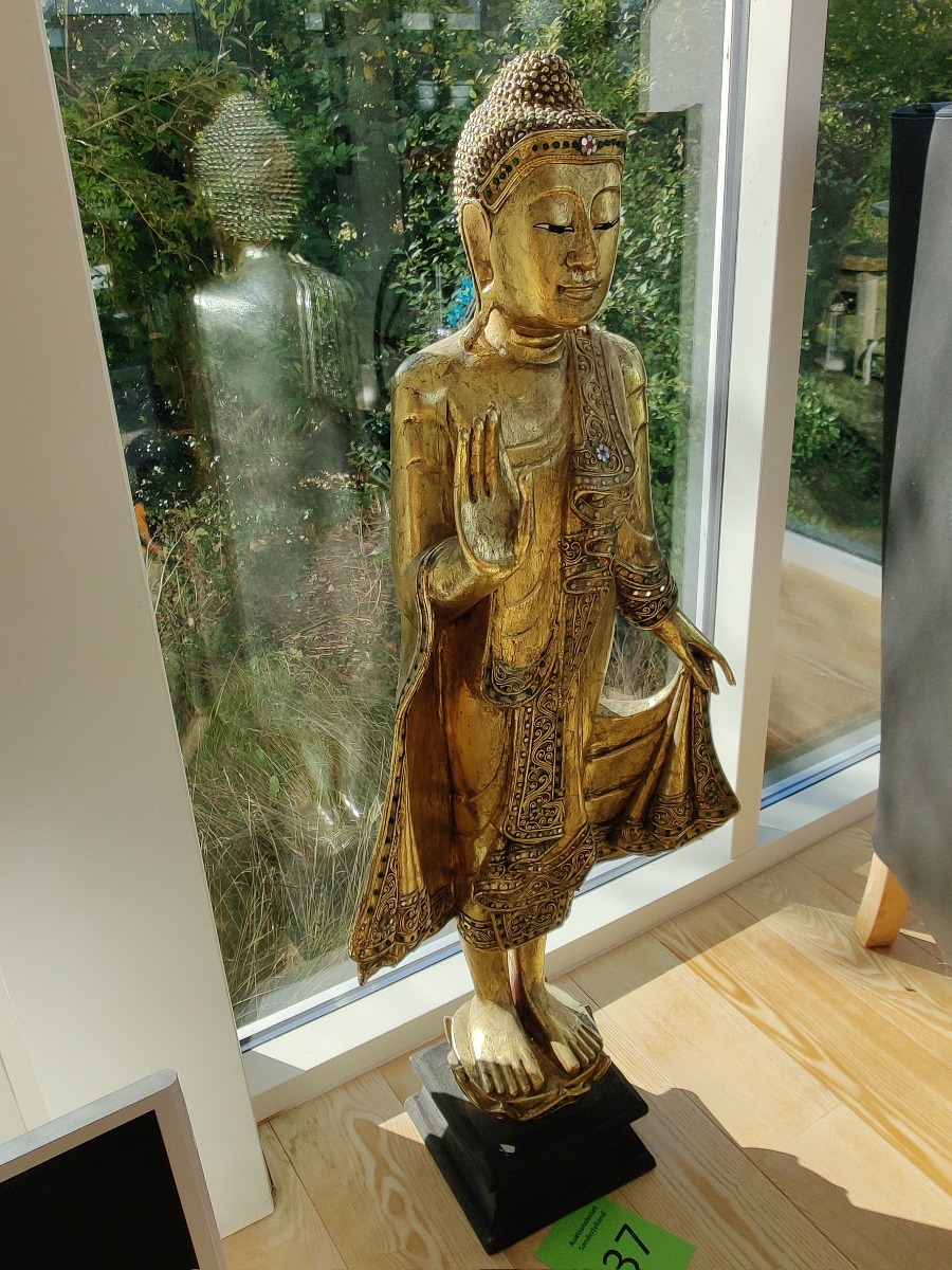 Stående Thailandsk Buddha af forgyldt træ med glasdekorationer. H: 92 cm. Fod 18 x 18 cm.