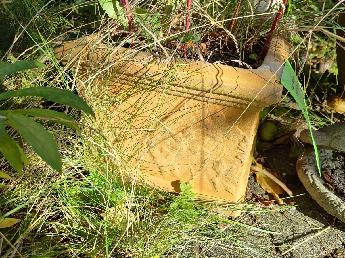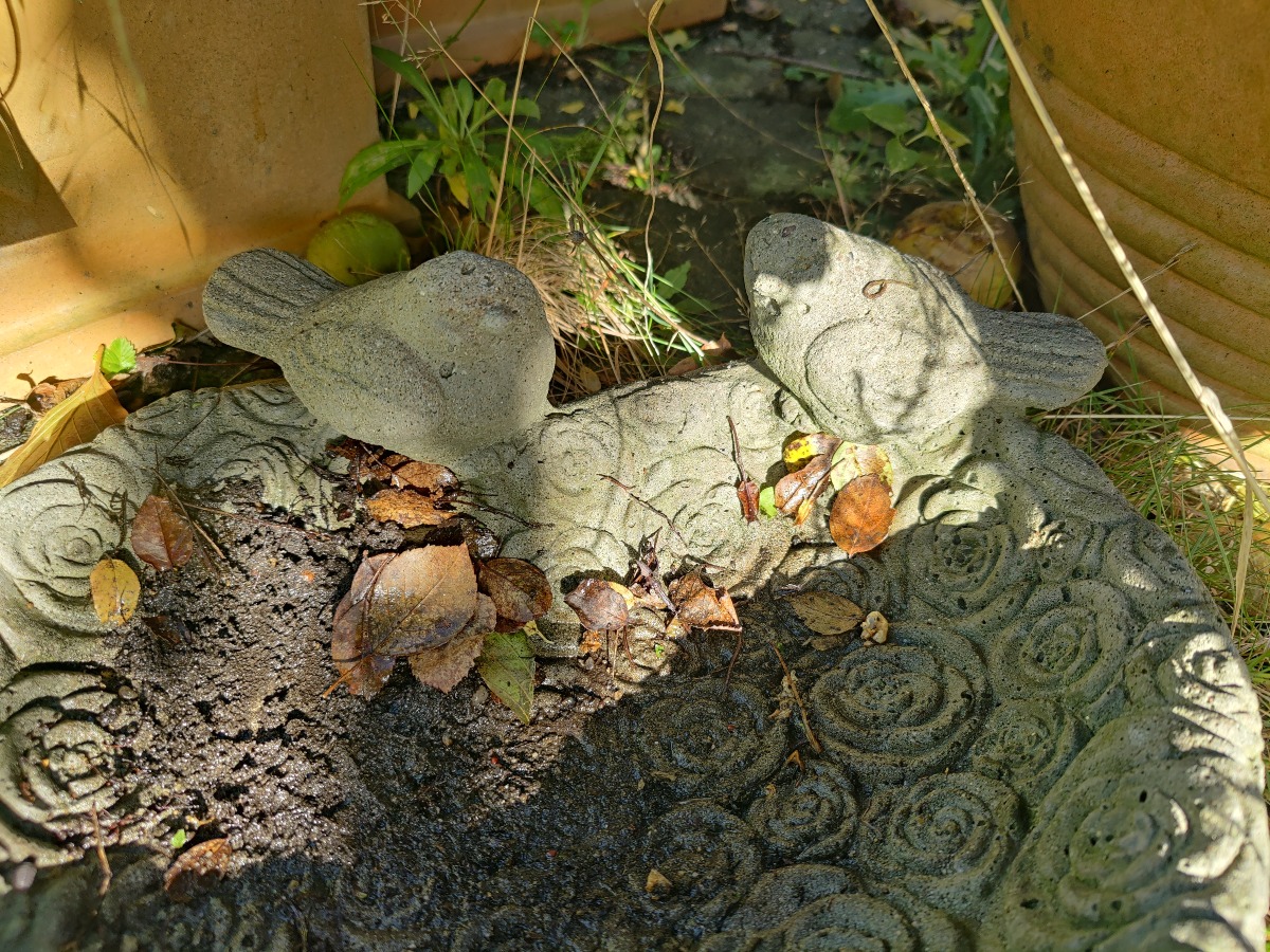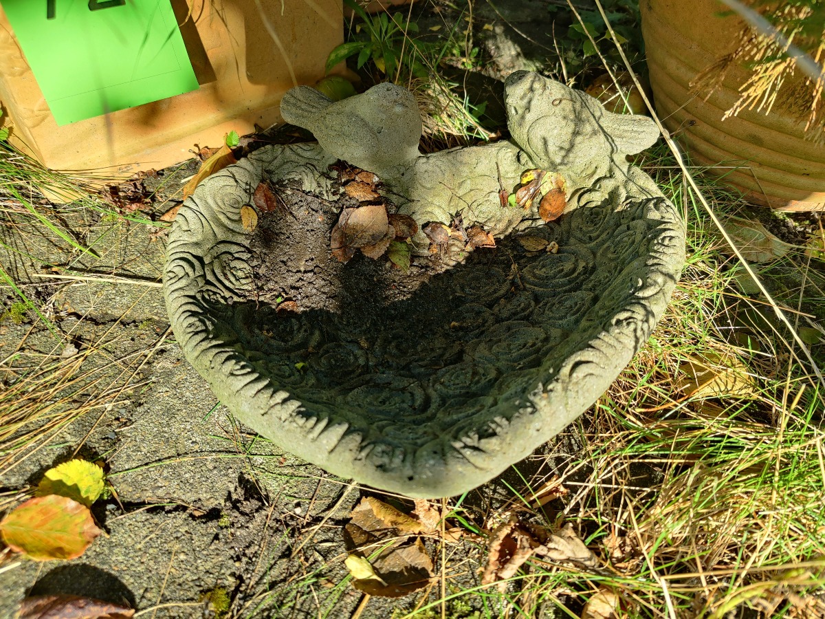 Terracotta havekrukker samt fuglebad af fiberbeton. Firkantede 35 x 35 cm. Ø. for de runde 35 cm. Hjerteformet fuglebad af fiberbeton.