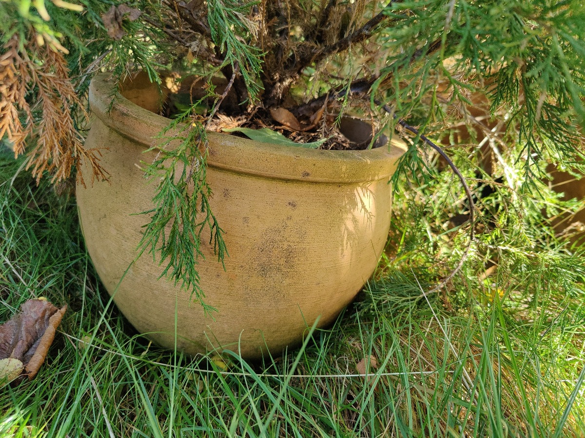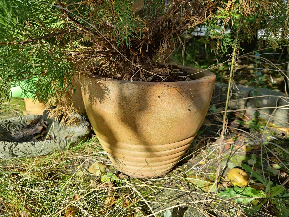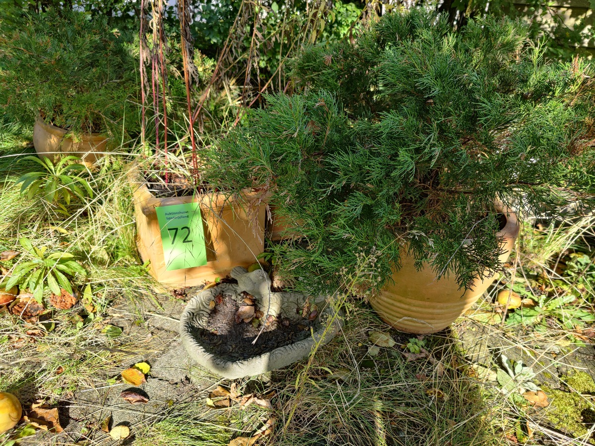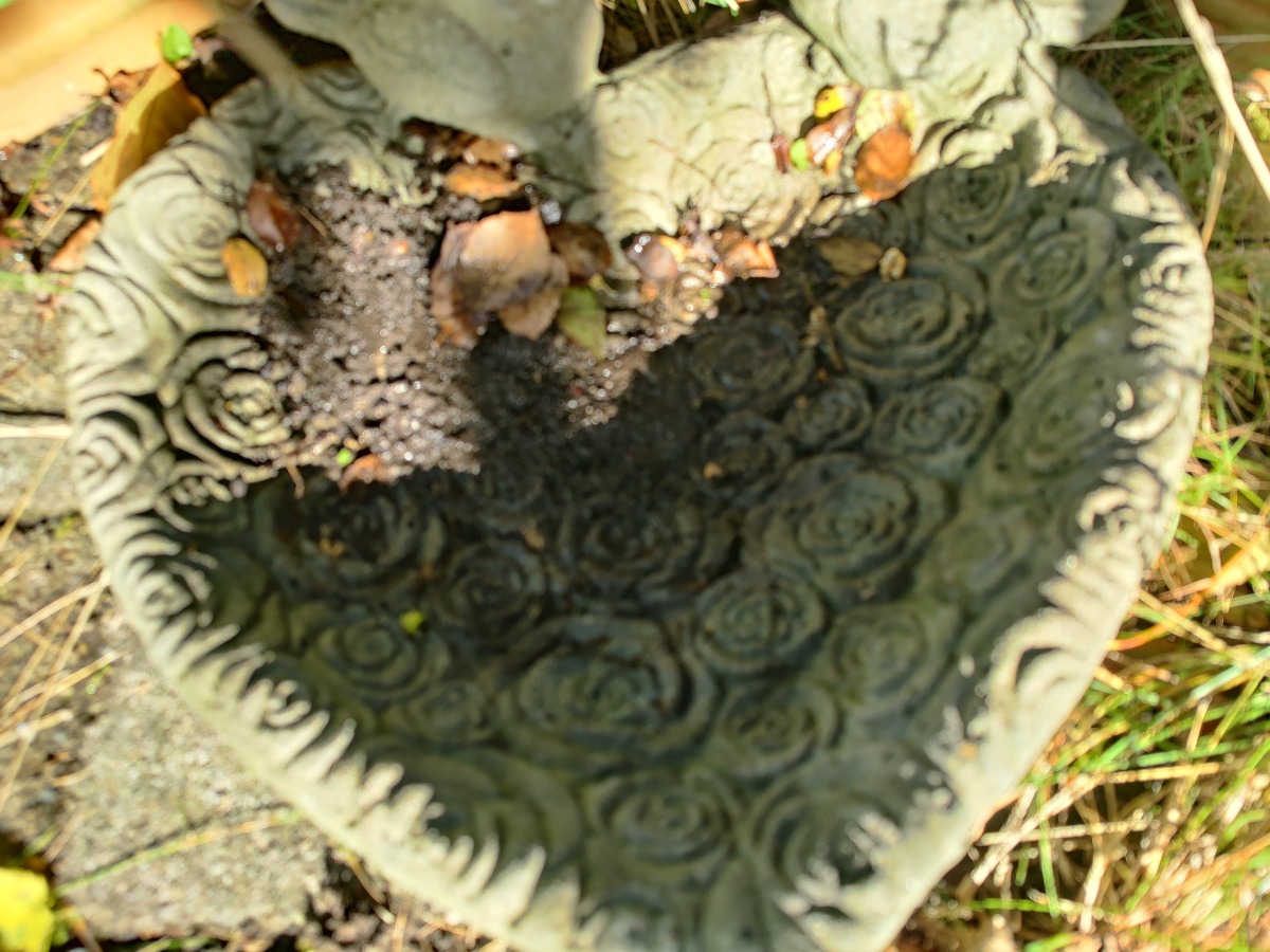 Terracotta havekrukker samt fuglebad af fiberbeton. Firkantede 35 x 35 cm. Ø. for de runde 35 cm. Hjerteformet fuglebad af fiberbeton.