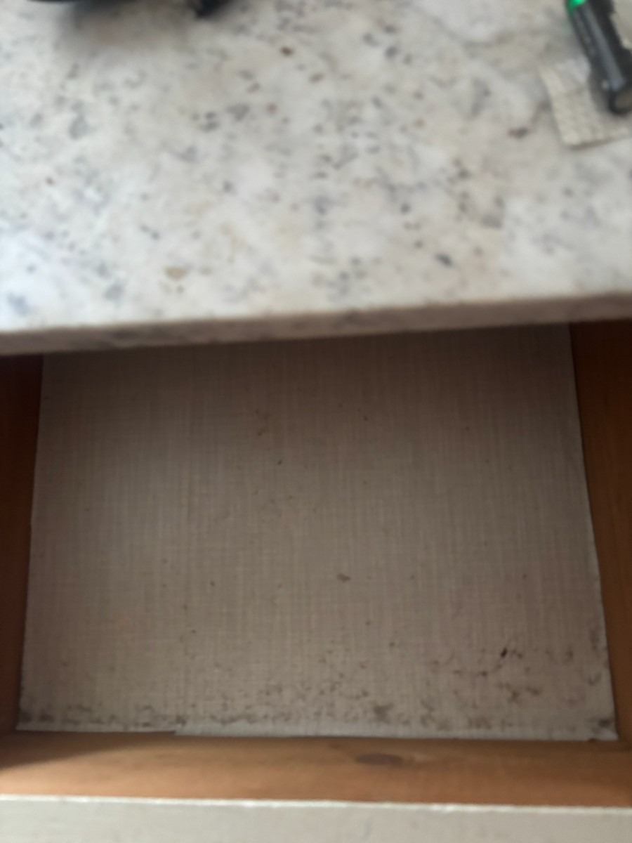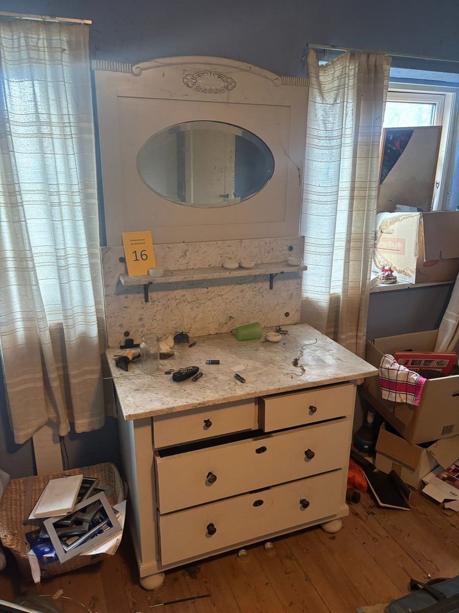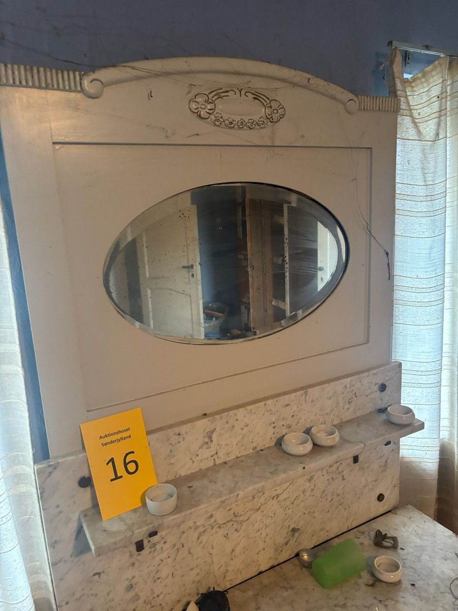 Servante af hvidmalet træ med faceteret spejl og marmorplade. H: 185, B. 90, D. 55 cm.