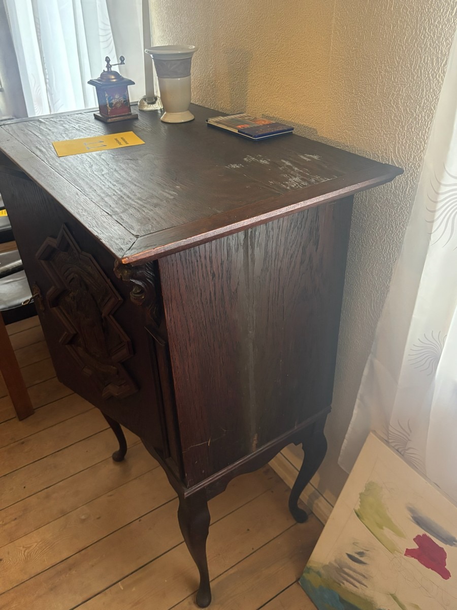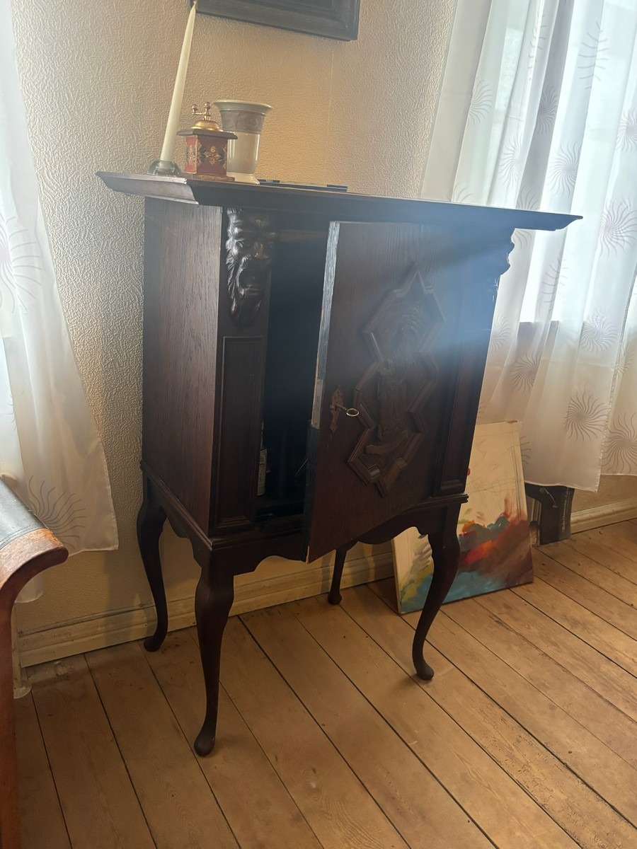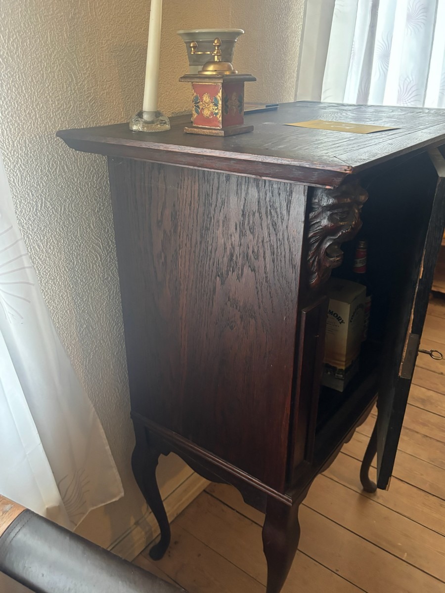 Tobaksskab af mørkbejdset eg. Udskæringer i front og på cabriole ben.