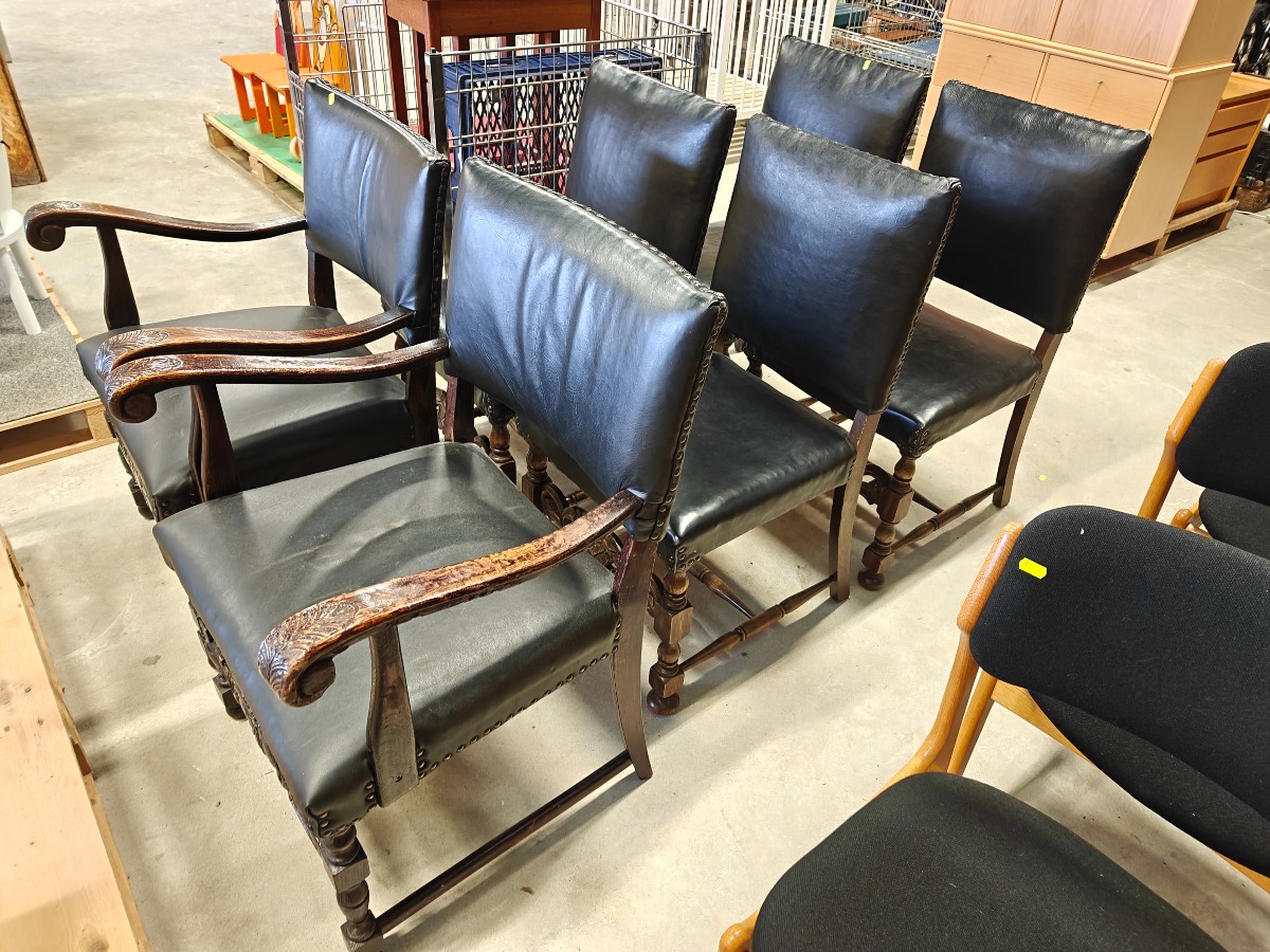 Barokform stolesæt af mørklakeret bøg. Sættet består af 2 armstole og 4 almindelioge stole. Sæde og ryg monteret med sort sømbeslået læder.