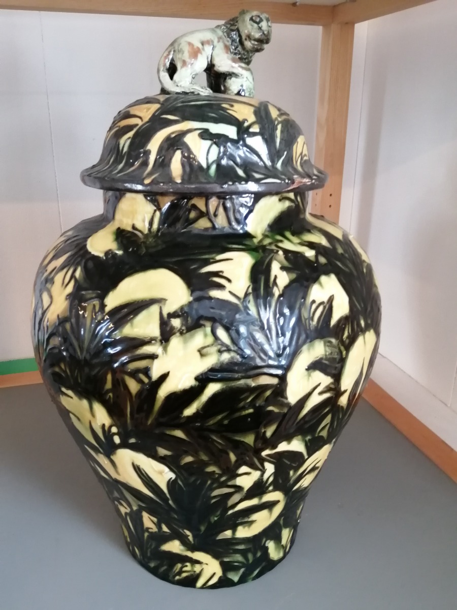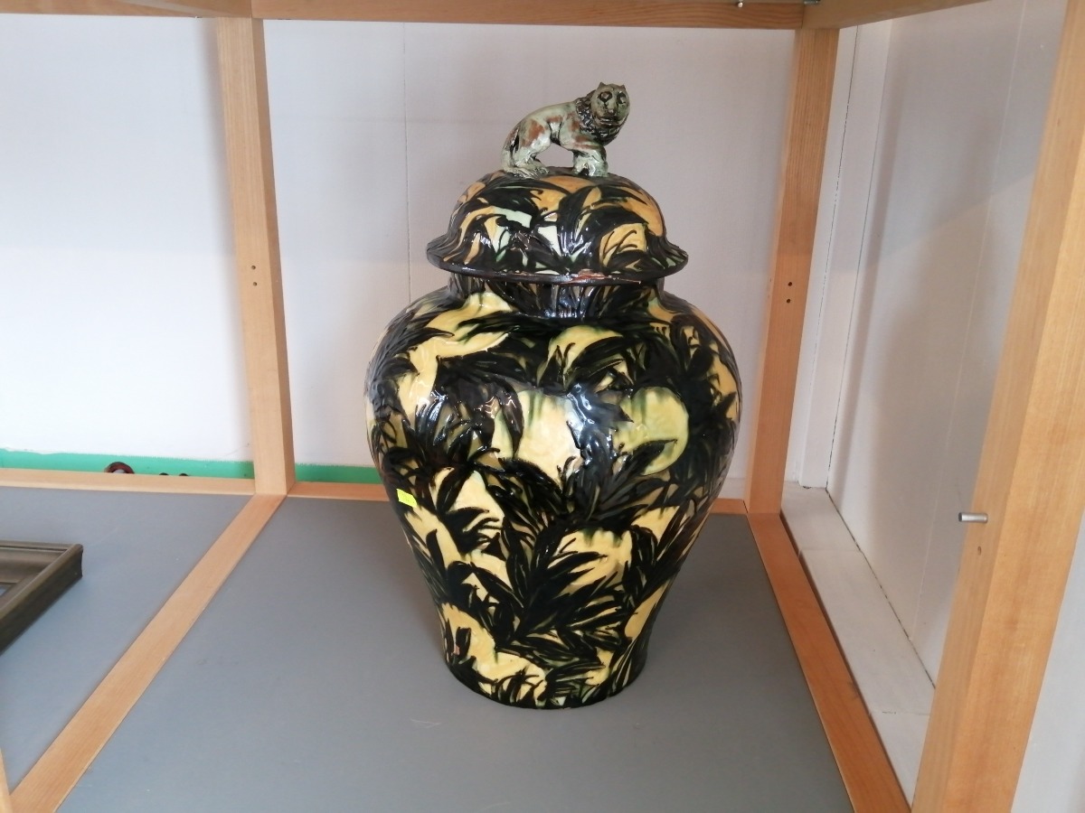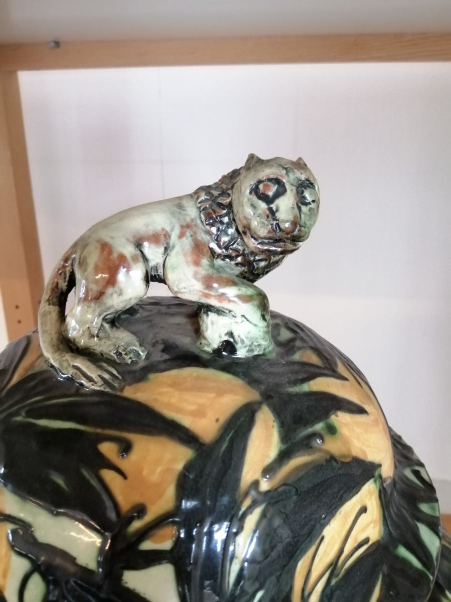 Max Laeuger krukke med låg m. løve på låget. Begge dele med skår H. 64cm B. 30cm. Brugt med brugsspor. Fra dødsbo.