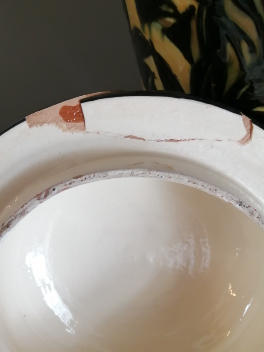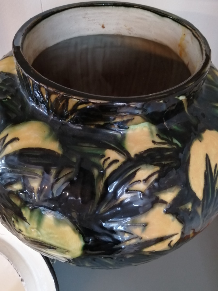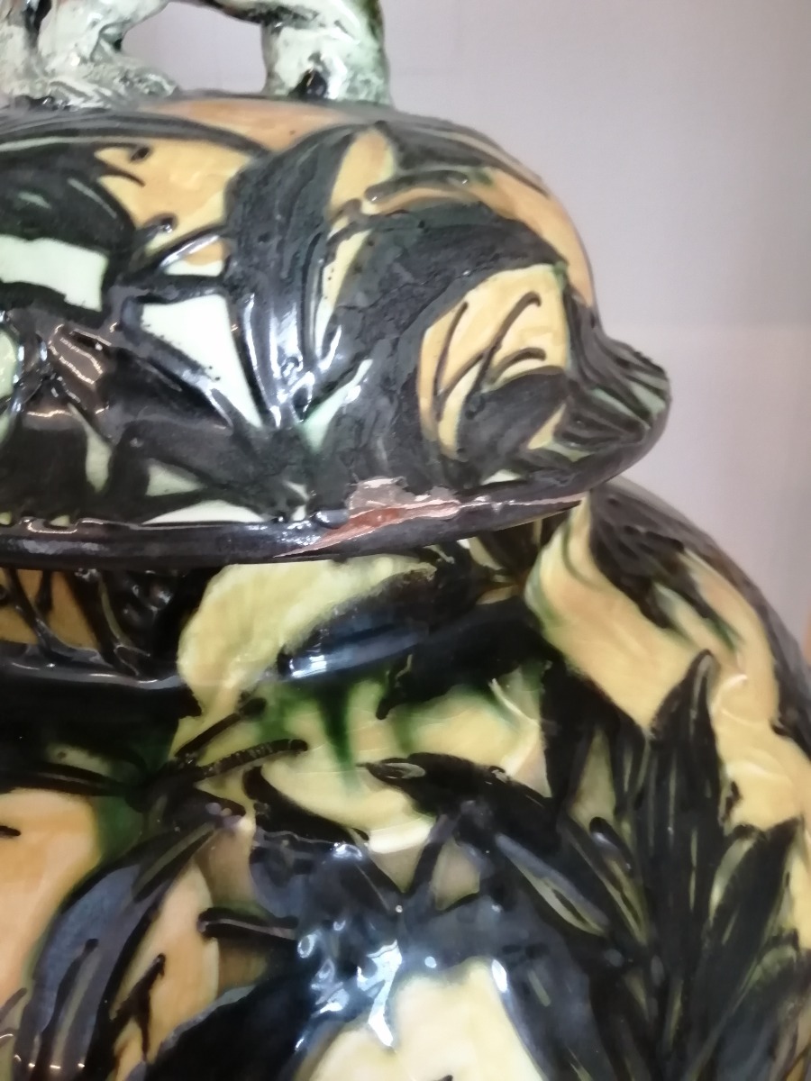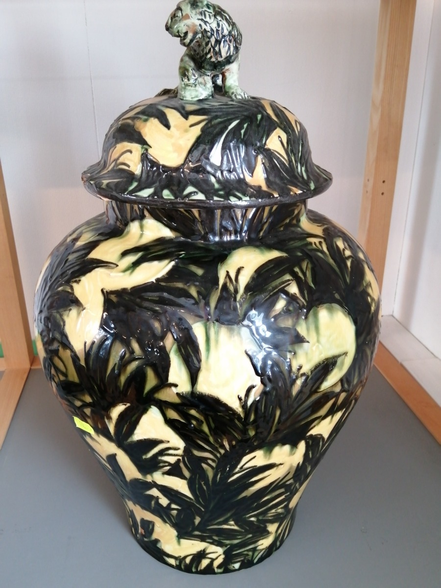Max Laeuger krukke med låg m. løve på låget. Begge dele med skår H. 64cm B. 30cm. Brugt med brugsspor. Fra dødsbo.
