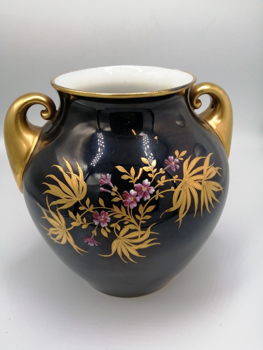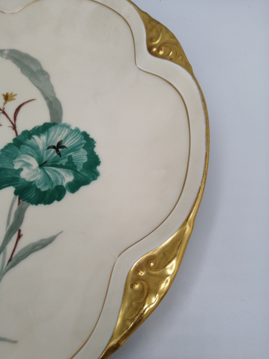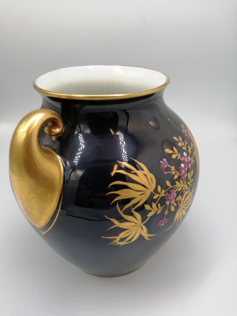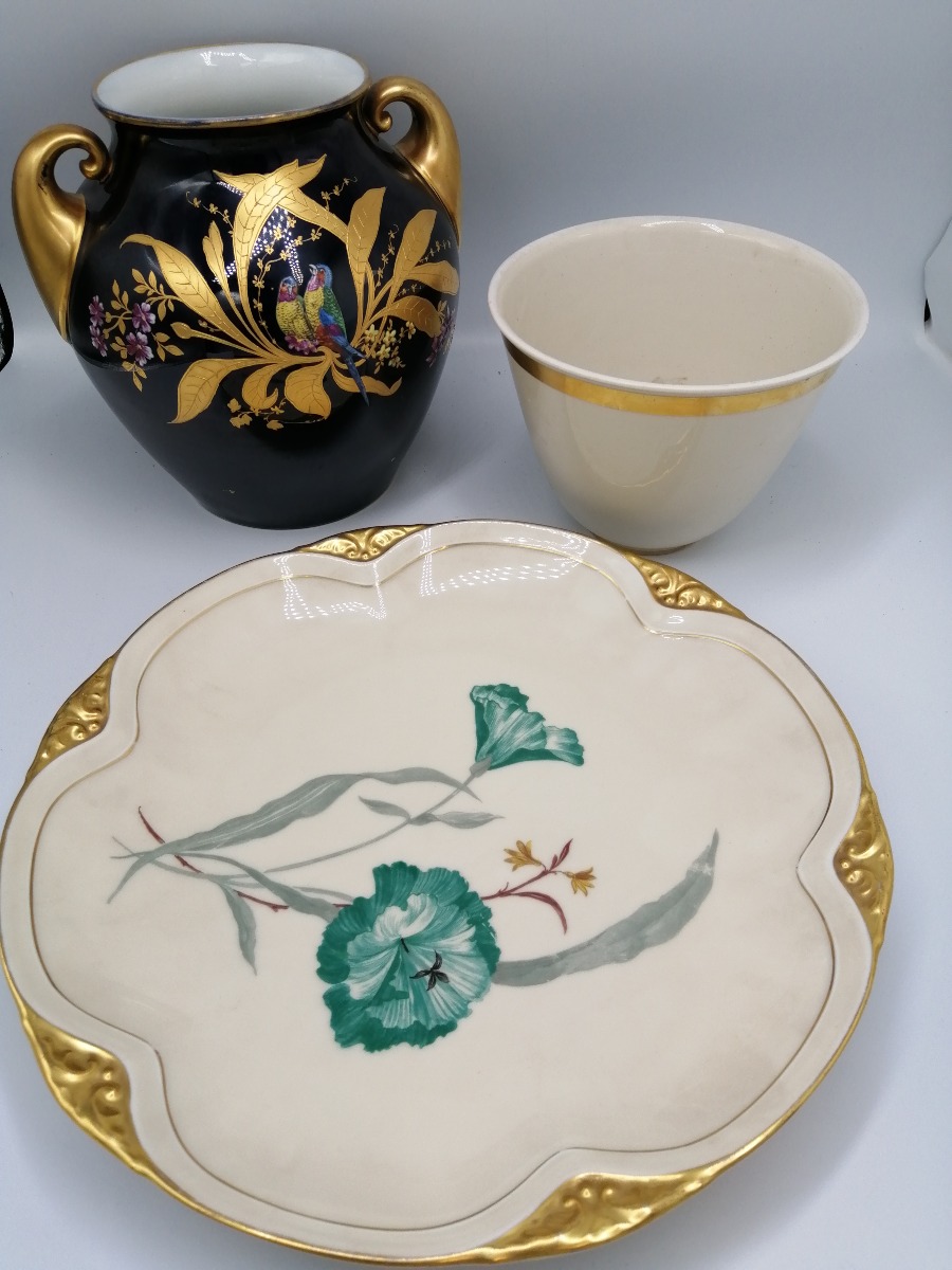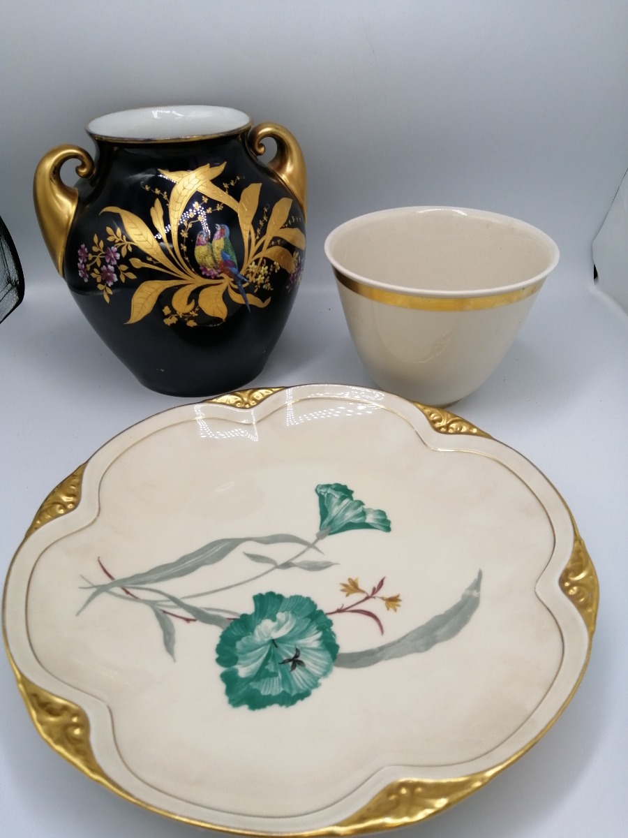 Porcelænsvase med forgyldte hanke, kant og blomstermotiv fra Dresden 19erne. H.20cm Tallerken med motiv blomst 30Cm Lille krukke/potte med guld kant 15 cm. Brugt med brugsspor. Fra dødsbo