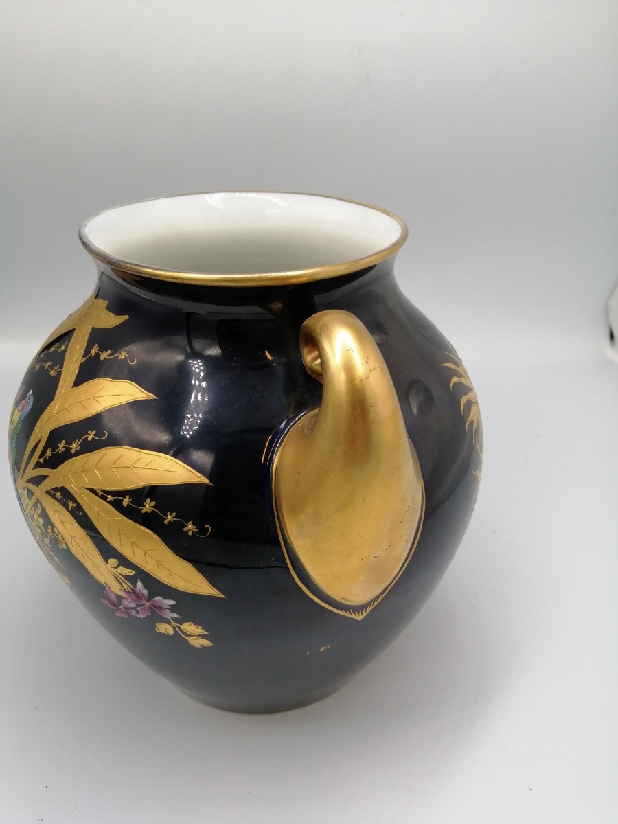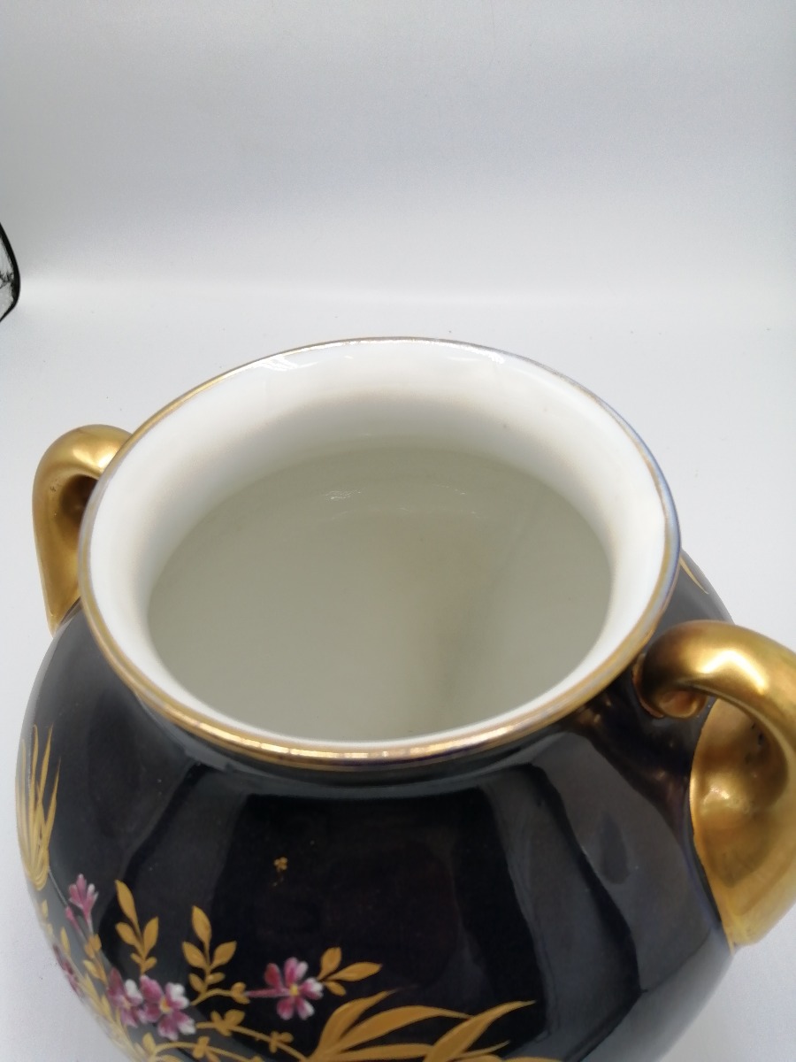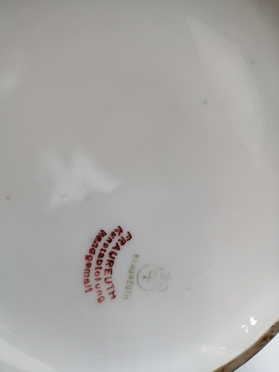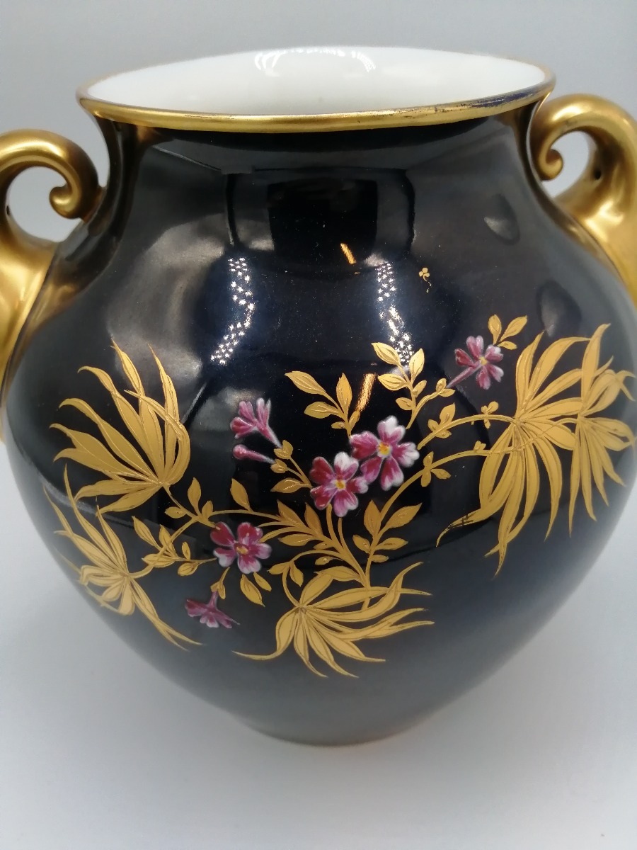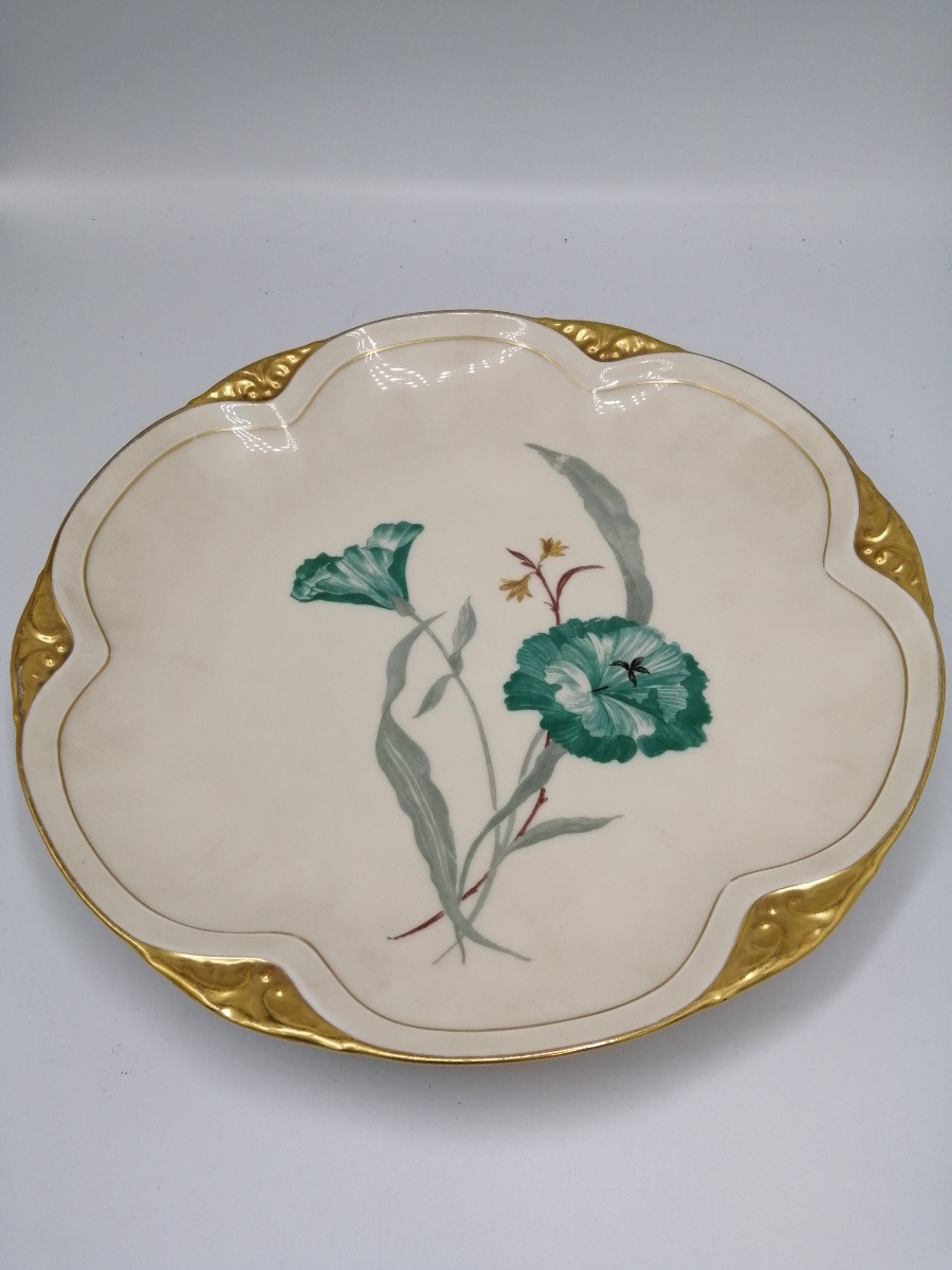 Porcelænsvase med forgyldte hanke, kant og blomstermotiv fra Dresden 19erne. H.20cm Tallerken med motiv blomst 30Cm Lille krukke/potte med guld kant 15 cm. Brugt med brugsspor. Fra dødsbo