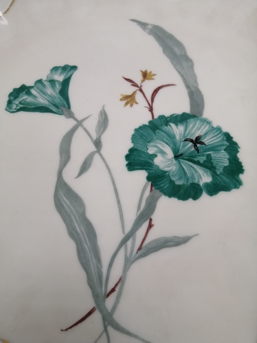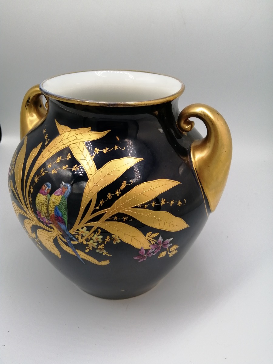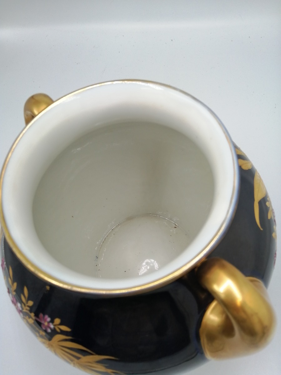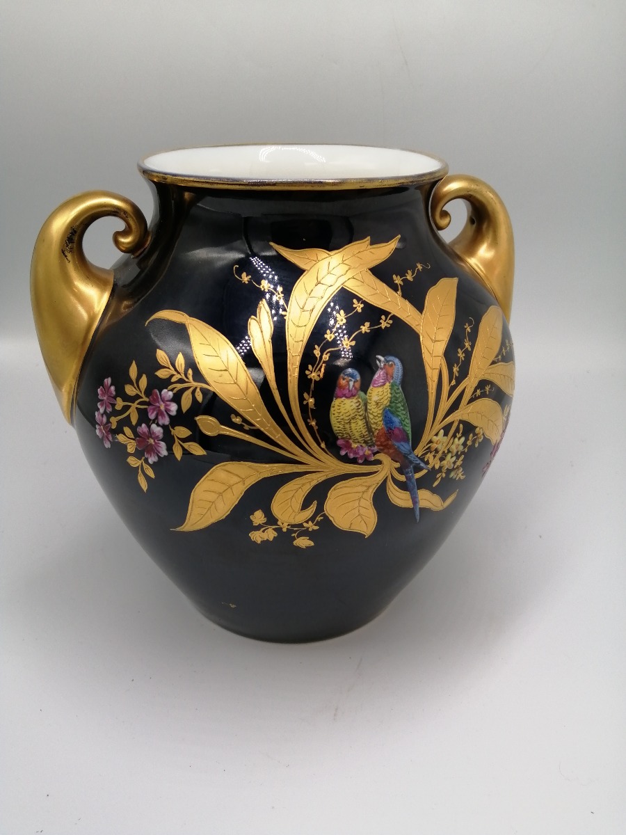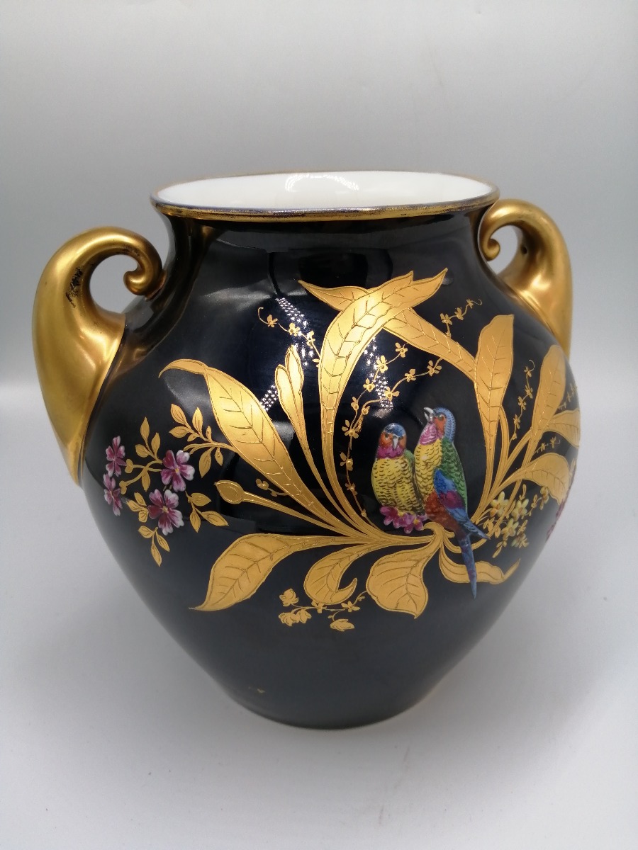 Porcelænsvase med forgyldte hanke, kant og blomstermotiv fra Dresden 19erne. H.20cm Tallerken med motiv blomst 30Cm Lille krukke/potte med guld kant 15 cm. Brugt med brugsspor. Fra dødsbo