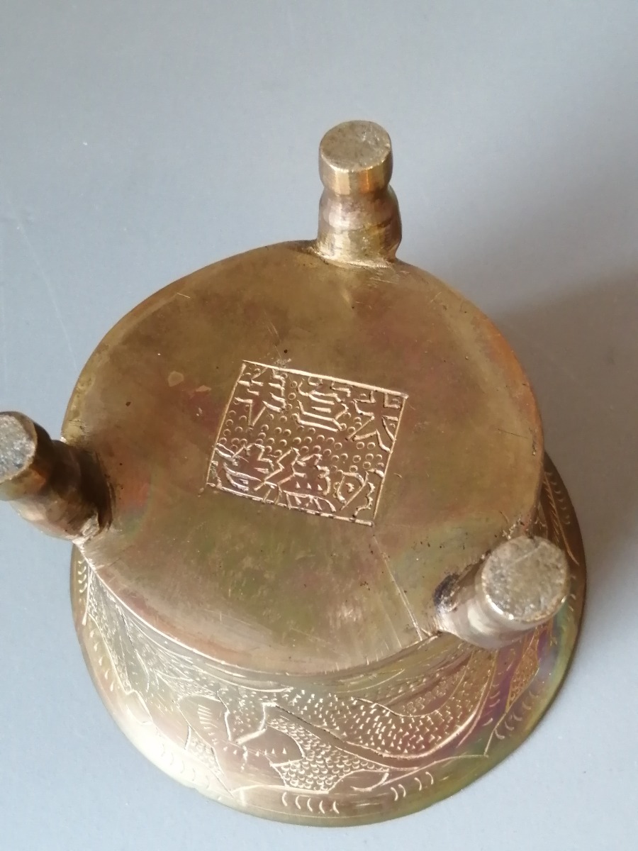 Bronze trefodet skål. Dekorerret med drager på siderne. H. 9cm.
