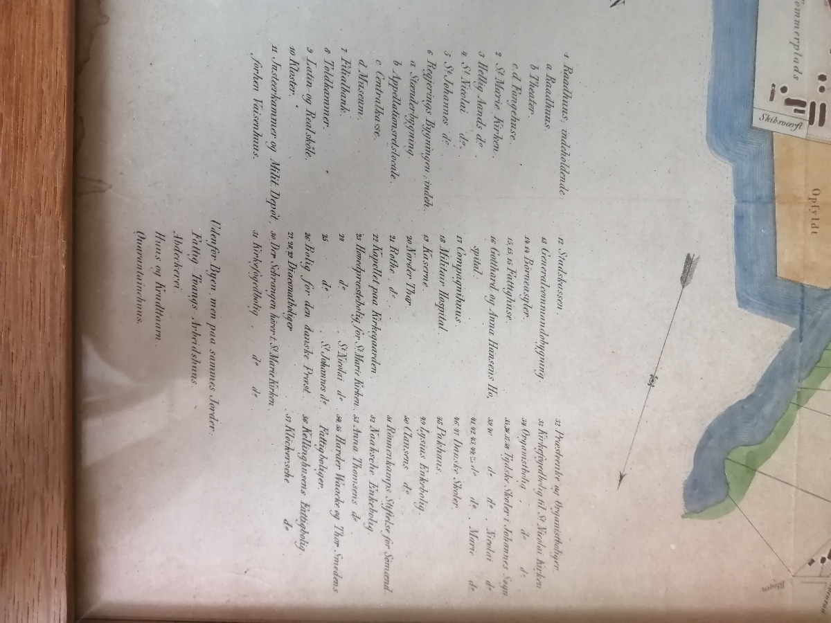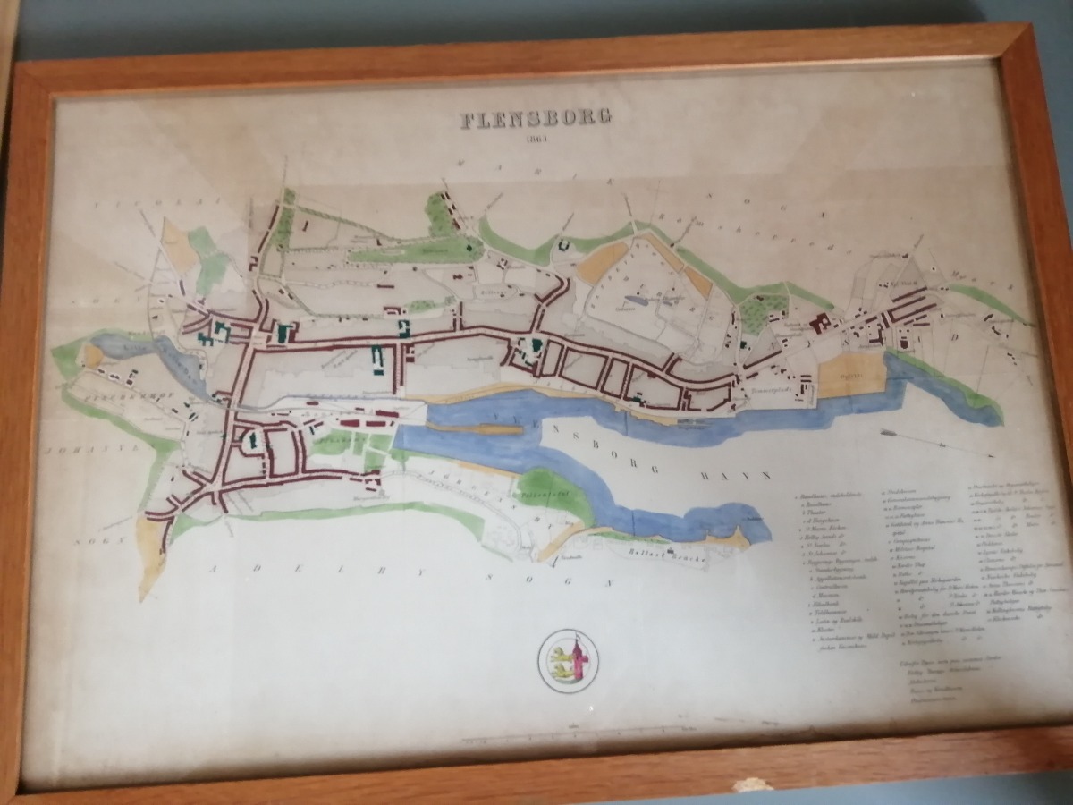 Vintage bykort over Flensborg. Fra 1863 og optegnet med farver. H. 38cm L. 54,5 cm
