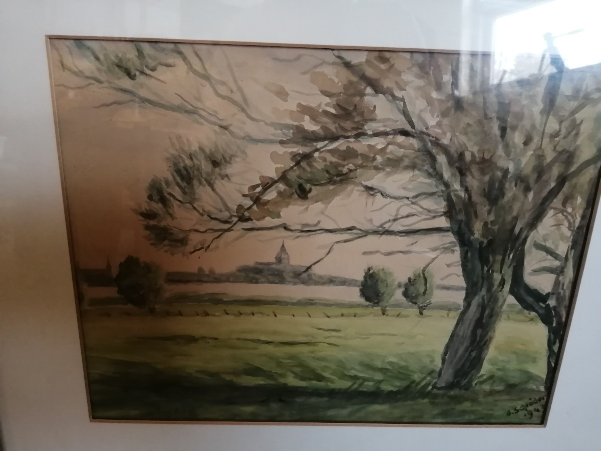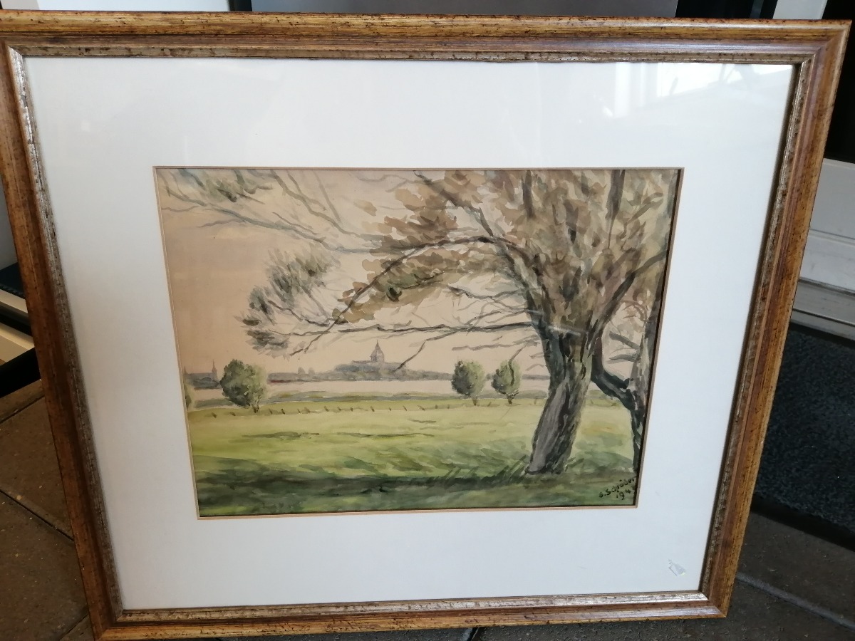 Akvarel B Schröder. Motiv med skov og by i baggrunden, 1943 i paspartu ramme. H. 49cm L. 54 cm