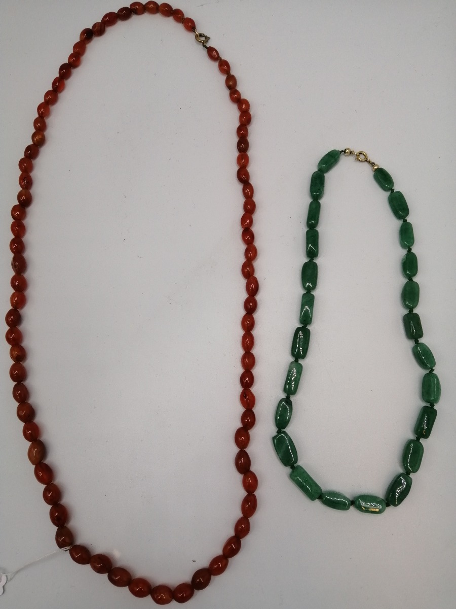 Halskæde med Karneol sten, ca 50 cm og halskæde med jade ca 50 cm. Brugt med brugsspor. Fra dødsbo