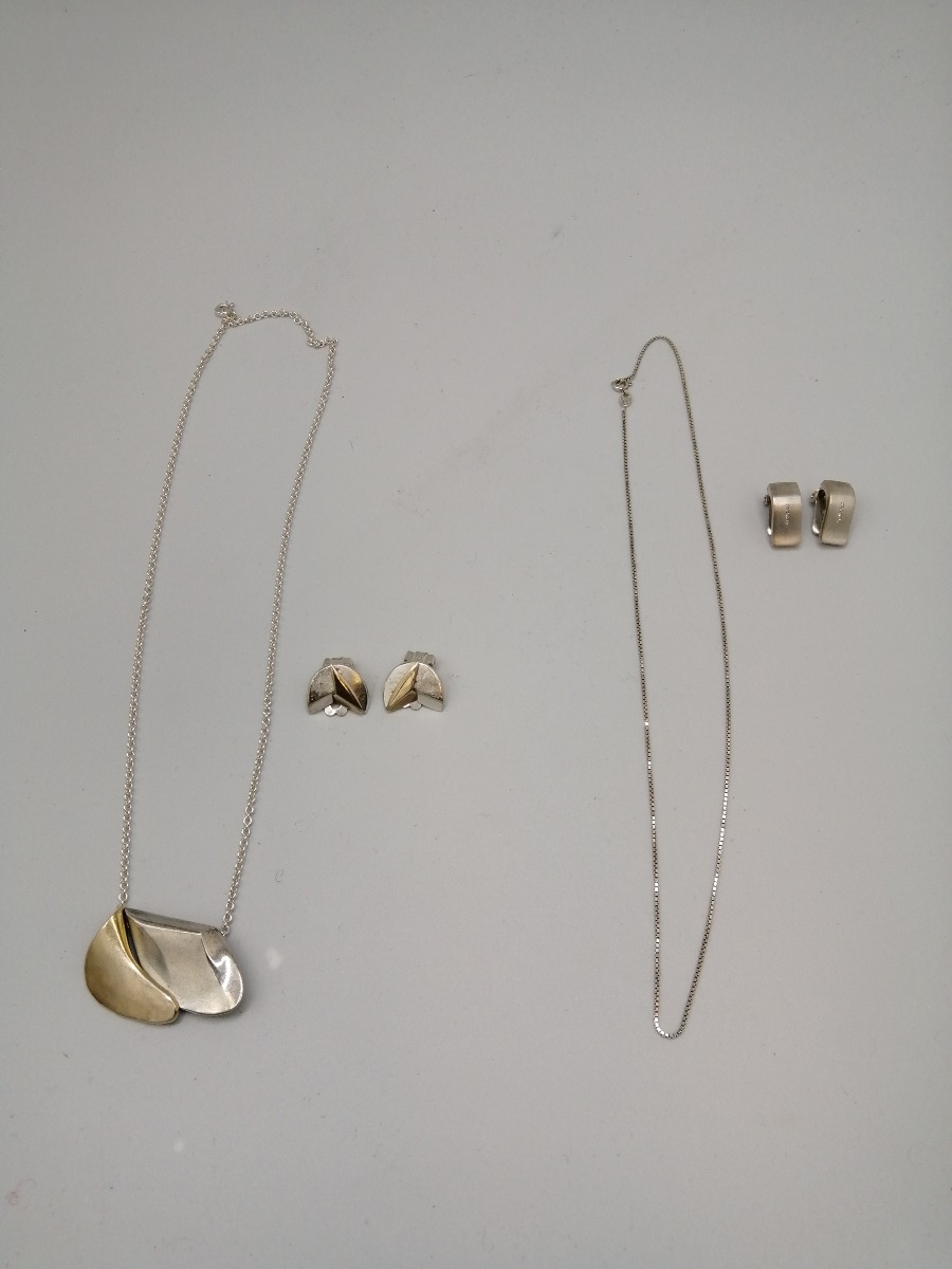 Sterling sølv. To par Ørerstik, halskæde med ved hæng. Tynd kæde. Brugt med brugsspor. Fra dødsbo