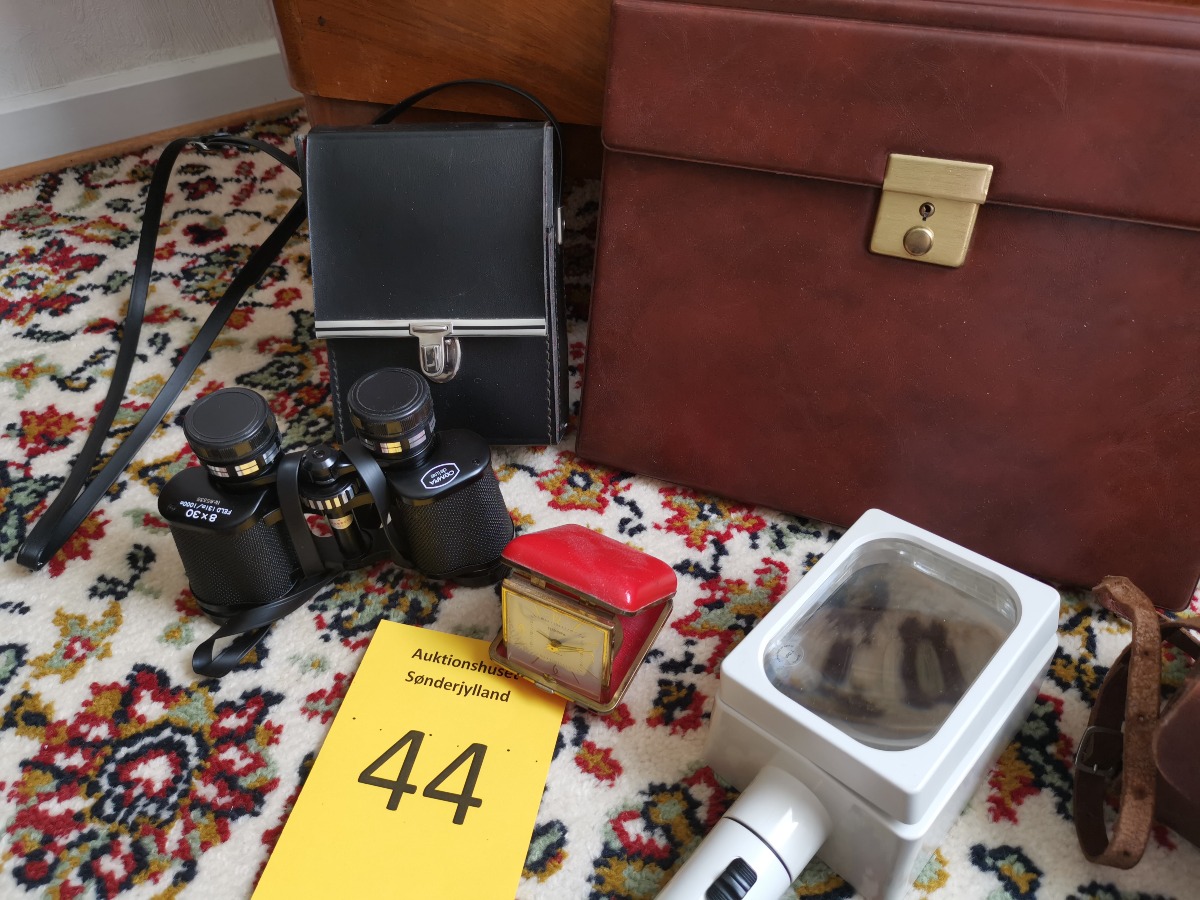 Vintage genstande - 2 stk. kikkert, 2 stk. kamera, vækkeur, lup og arkivmappe. Brugt. Fra dødsbo.