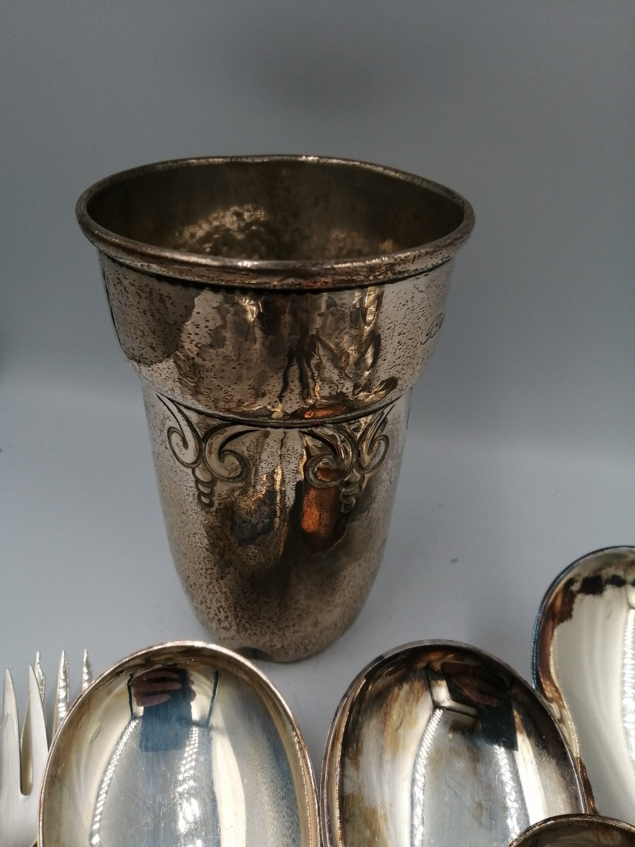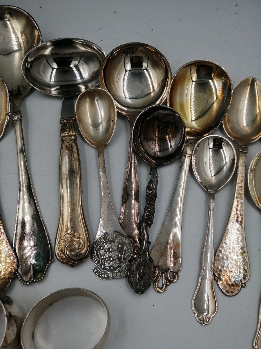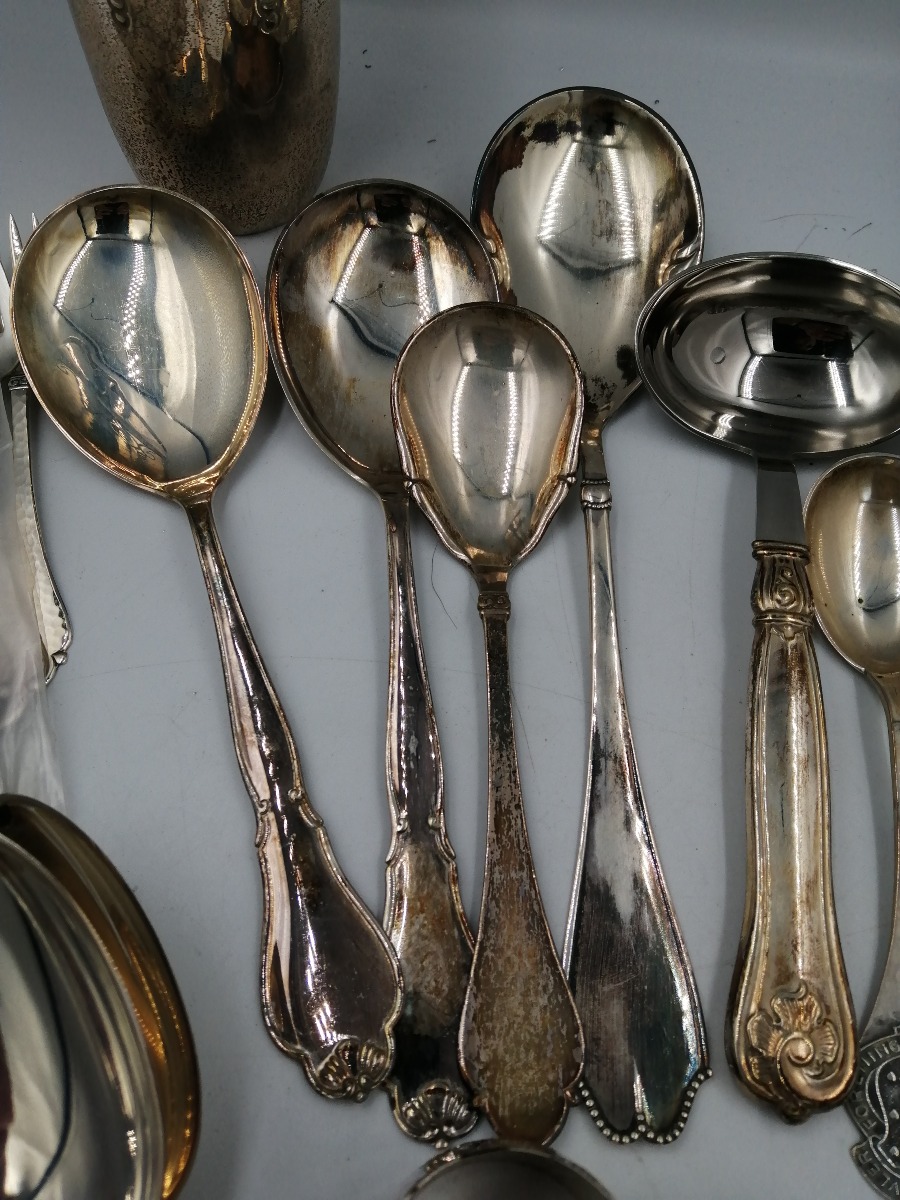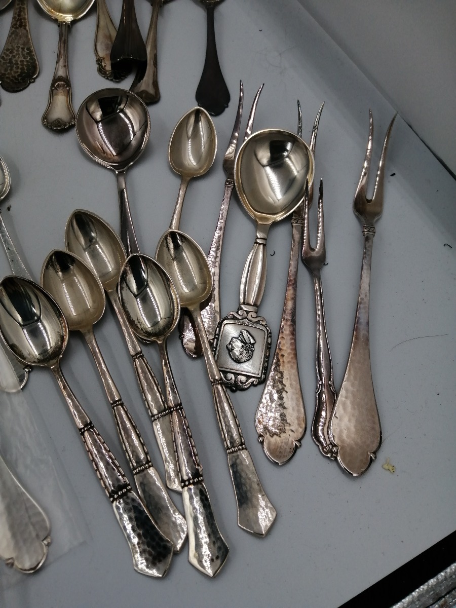 3 tårnet sølvbestik - rigtig mange og gamle dele. Vægt af sølv ca. 1,7 kg. Skafterne på kagespade og sovseske er rustfrit stål. Brugt.