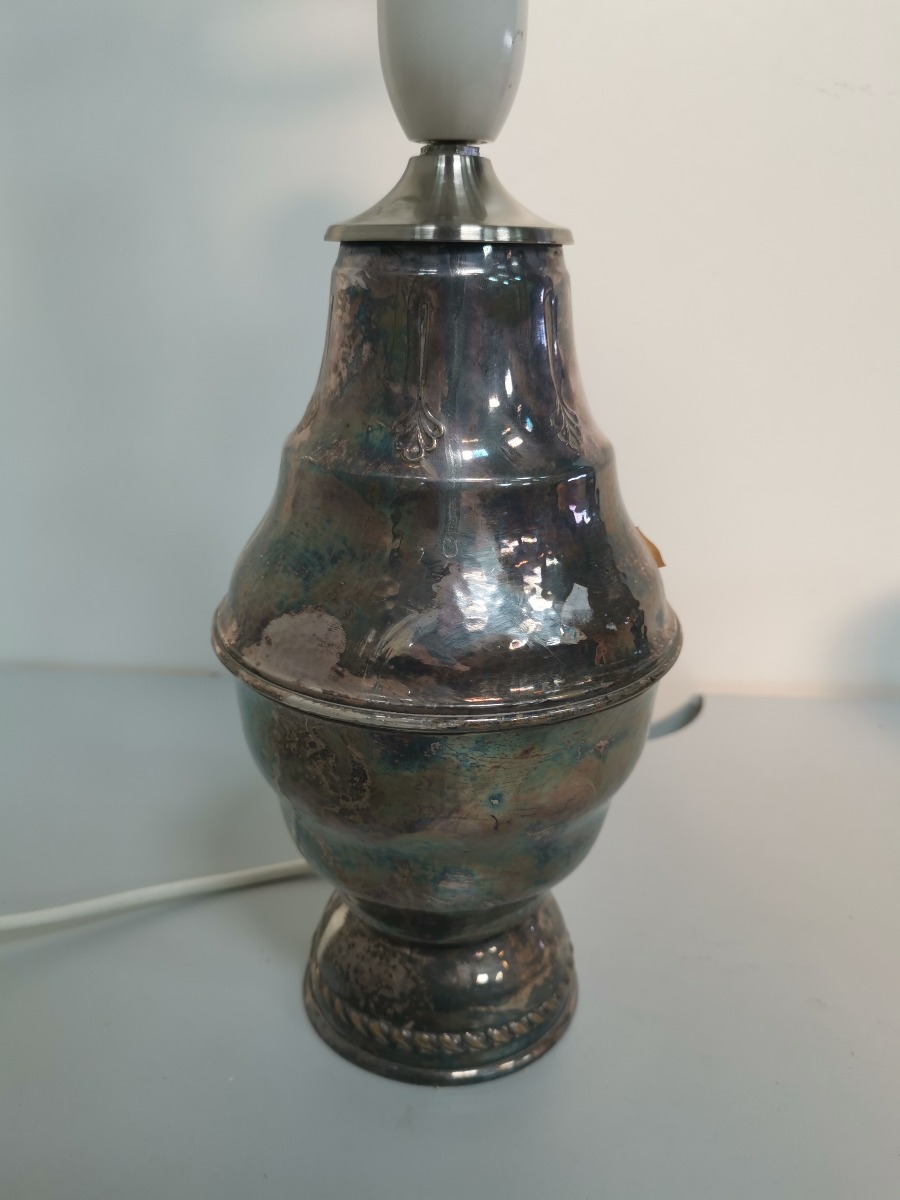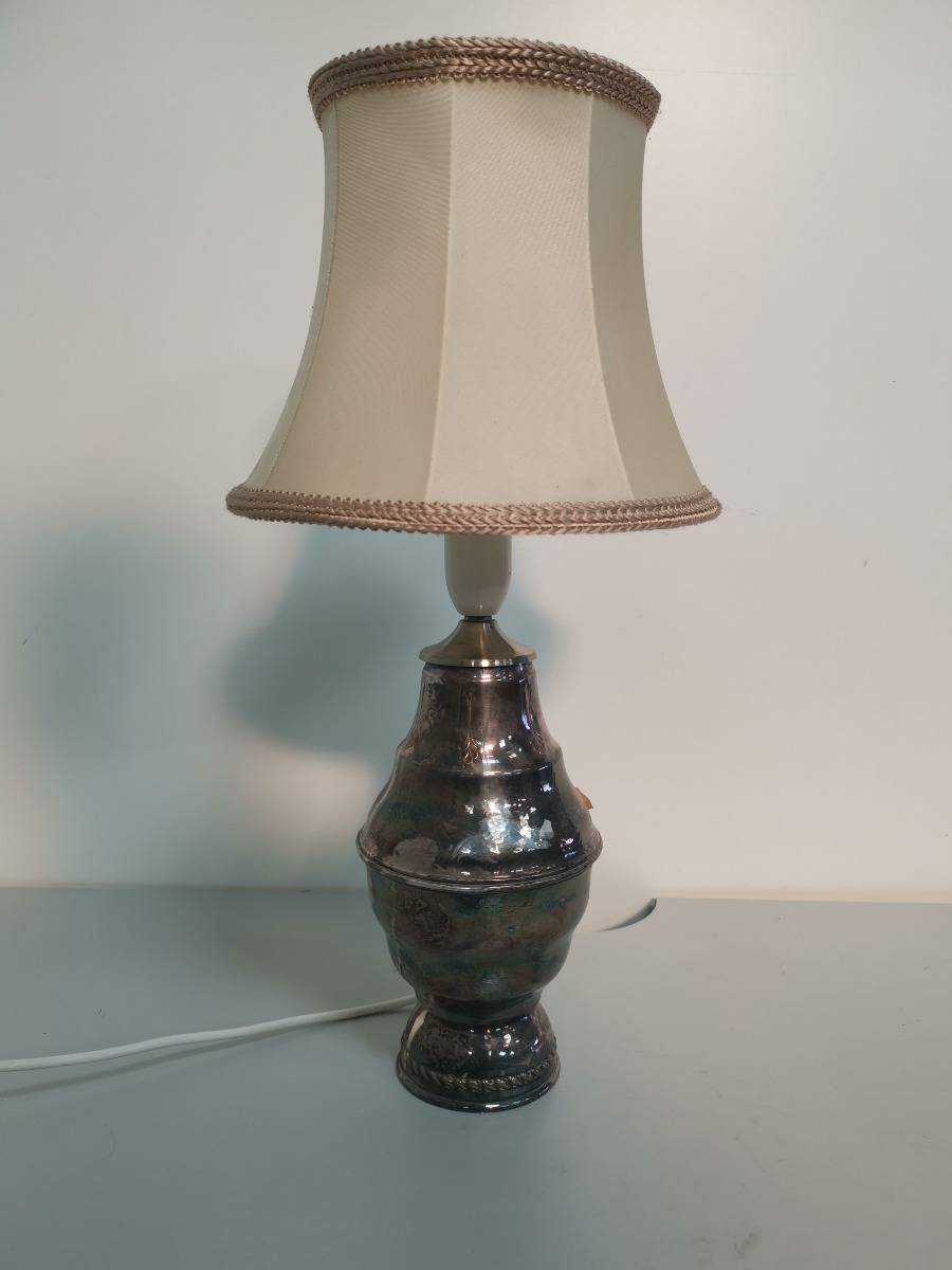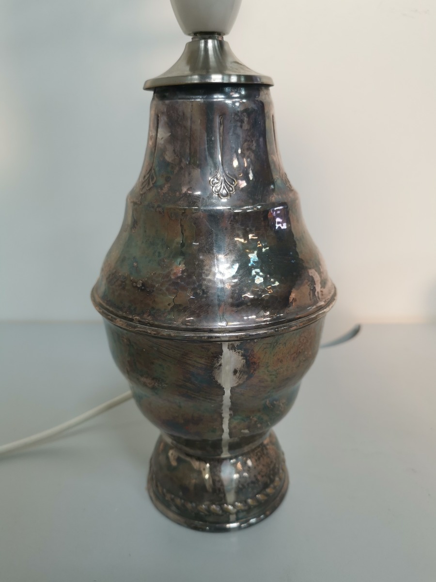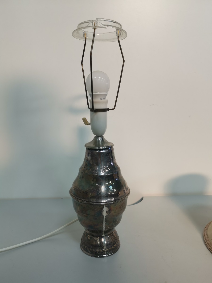 Bordlampe af sølvplet med hamret overflade og drevne dekorationer. H. 48 cm. Skærmholder med defekt.