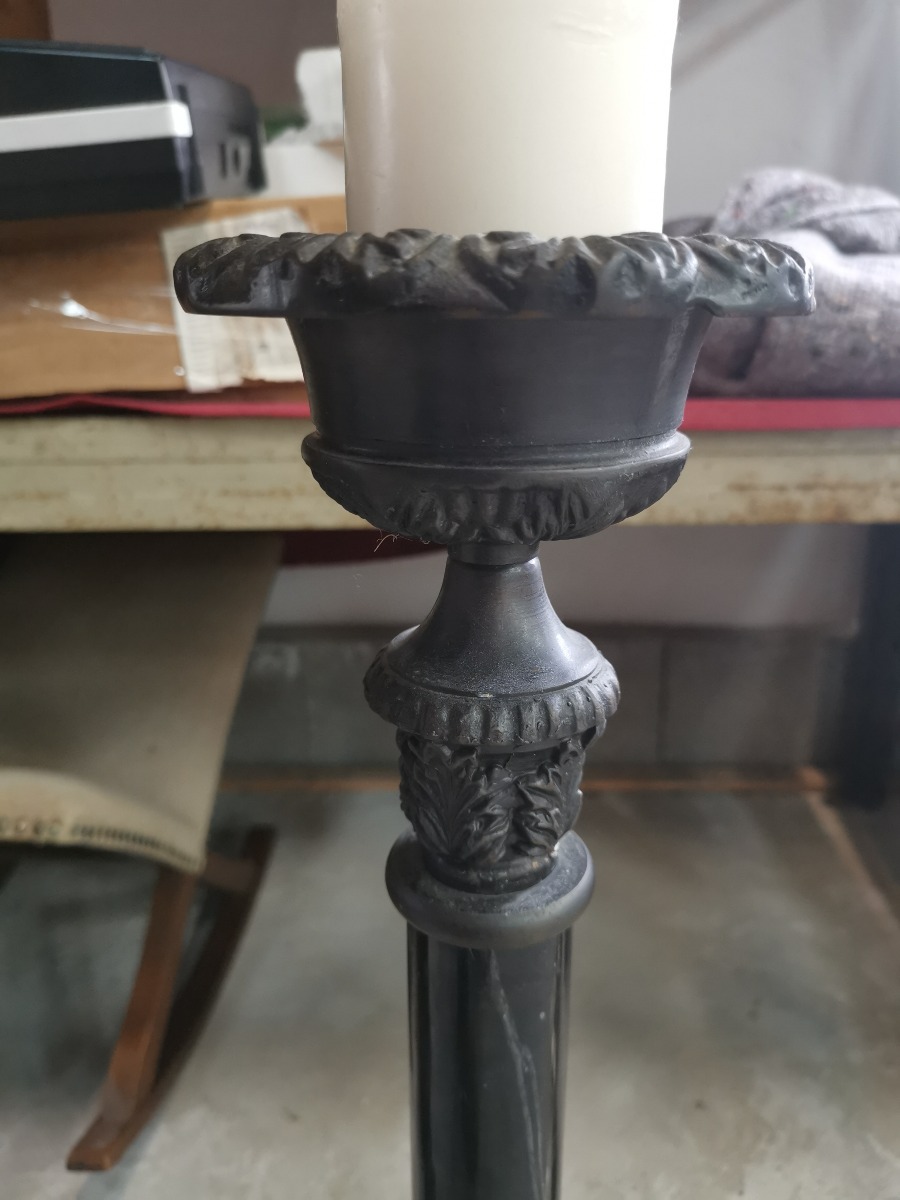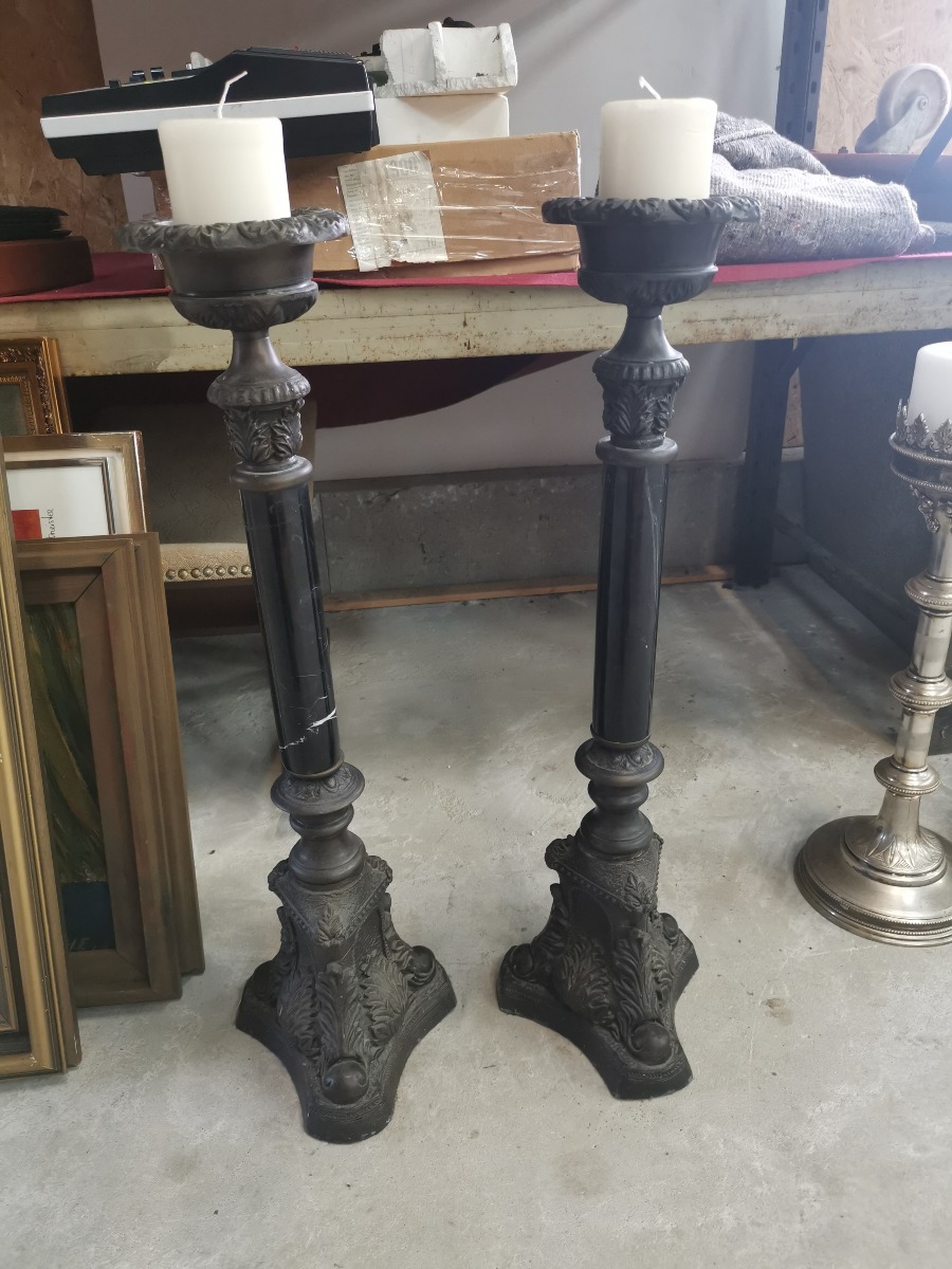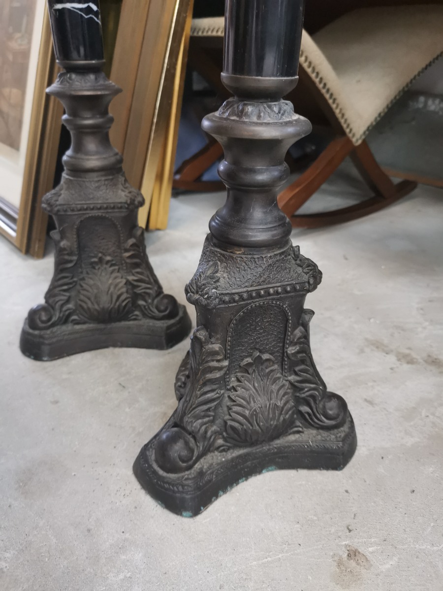 Par gulvstager af sortlakeret metal og stamme af sort marmor. Prydet med ornamentering. H. 67 cm.