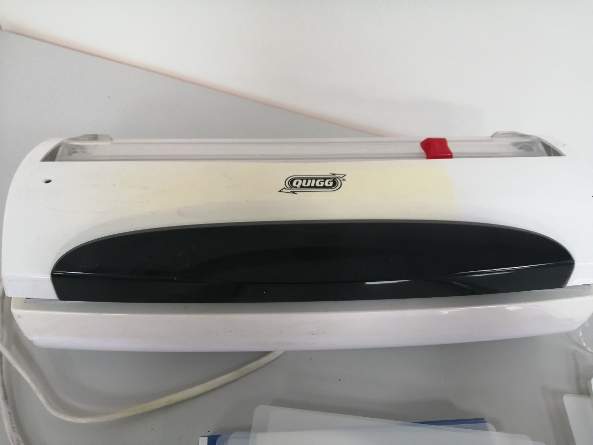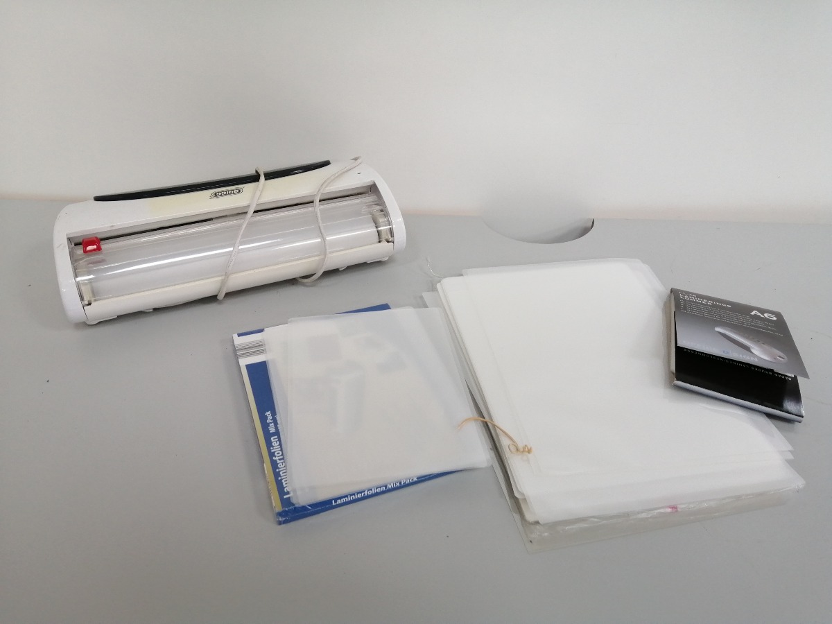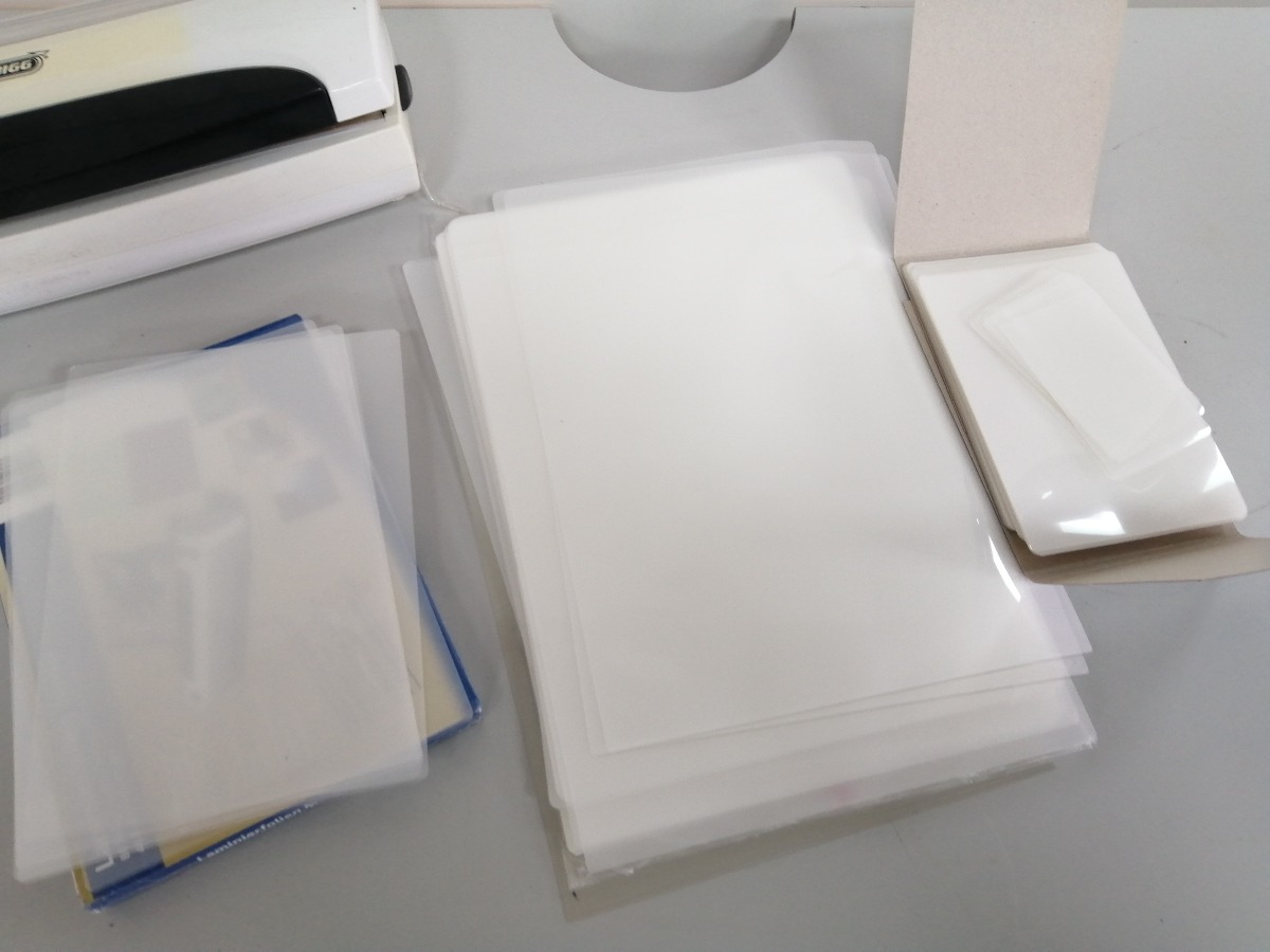 Lamineringsmaskine fra Quigg og diverse lamineringslommer dertil.