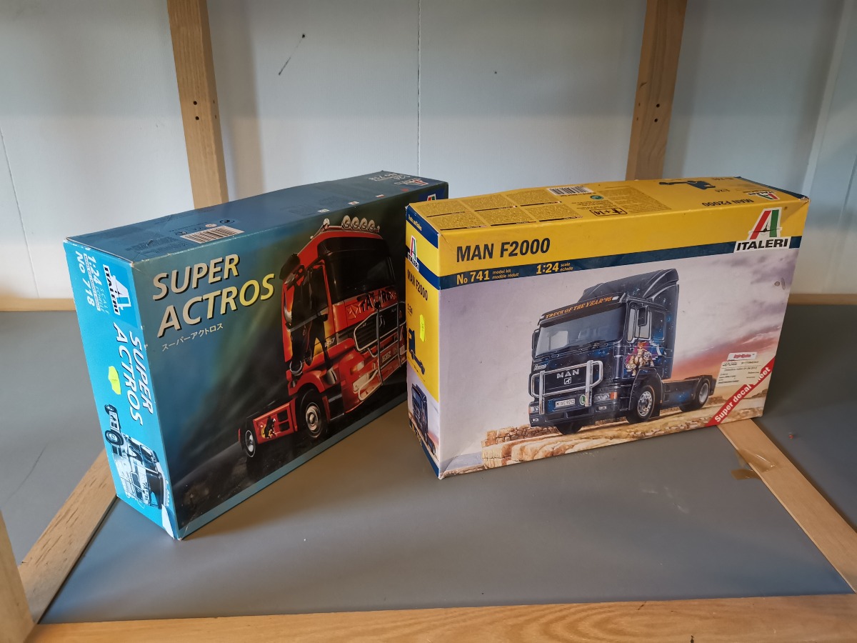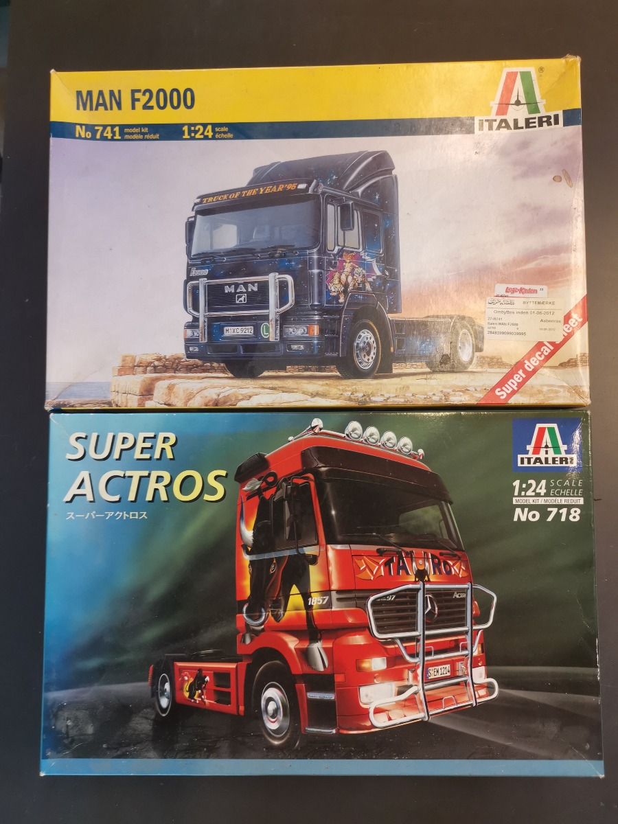 Italeri Plastbyggesæt af lastbiler Skala 1:24. Model af MAN F2000 og Mercedes Super Actros. Vi garanterer ikke for eventuelle mangler.