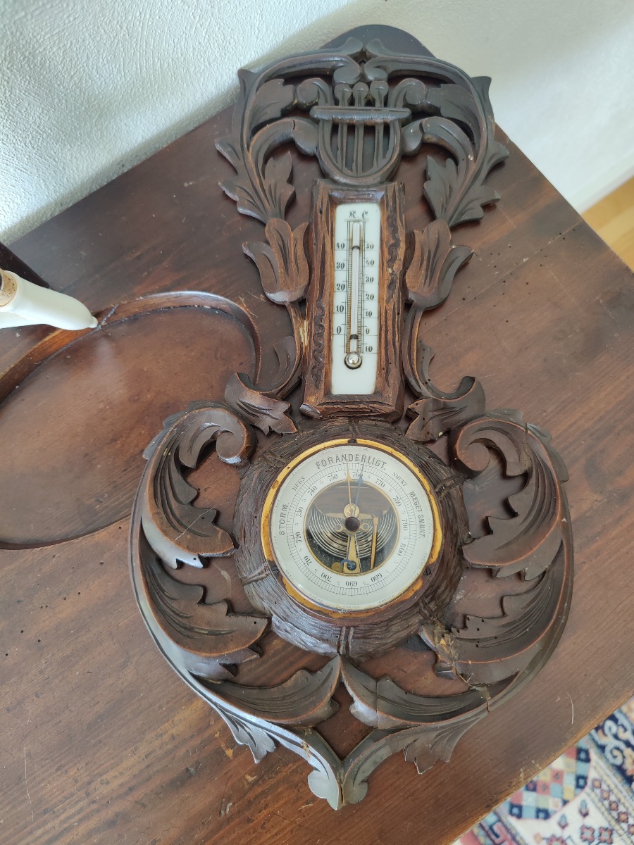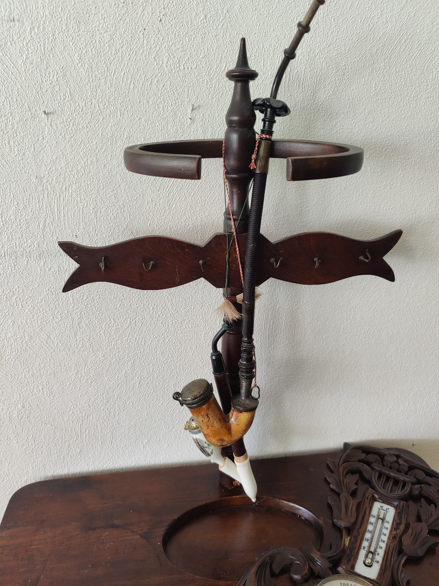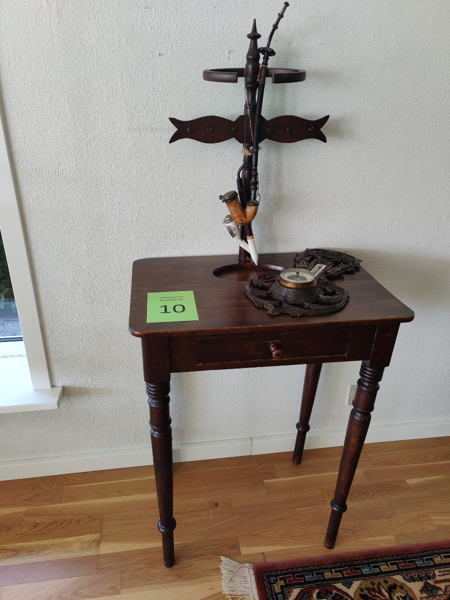 Tobaksbord med piber og barometer. Tobaksbordet måler 42 d x 66 b x 78 h. Total med piber holder 135 cm. Bordet har en skuffe og der medfølger 2 piber samt et barometer i træ der måler 47 h.