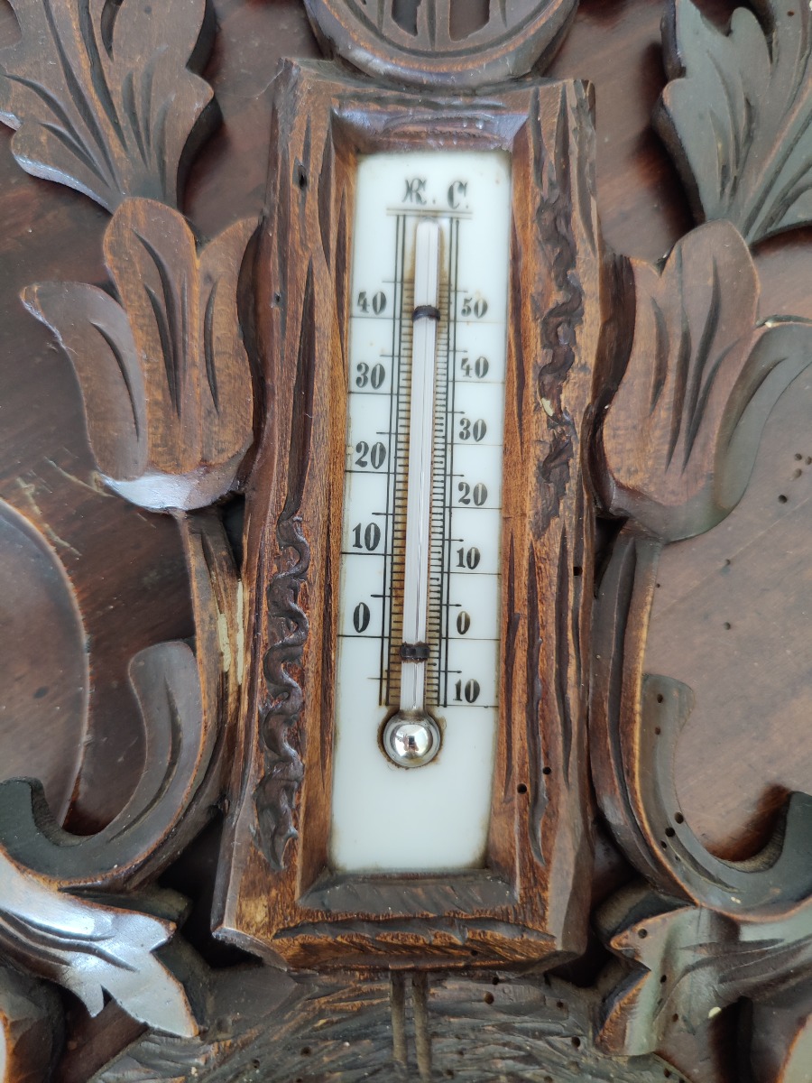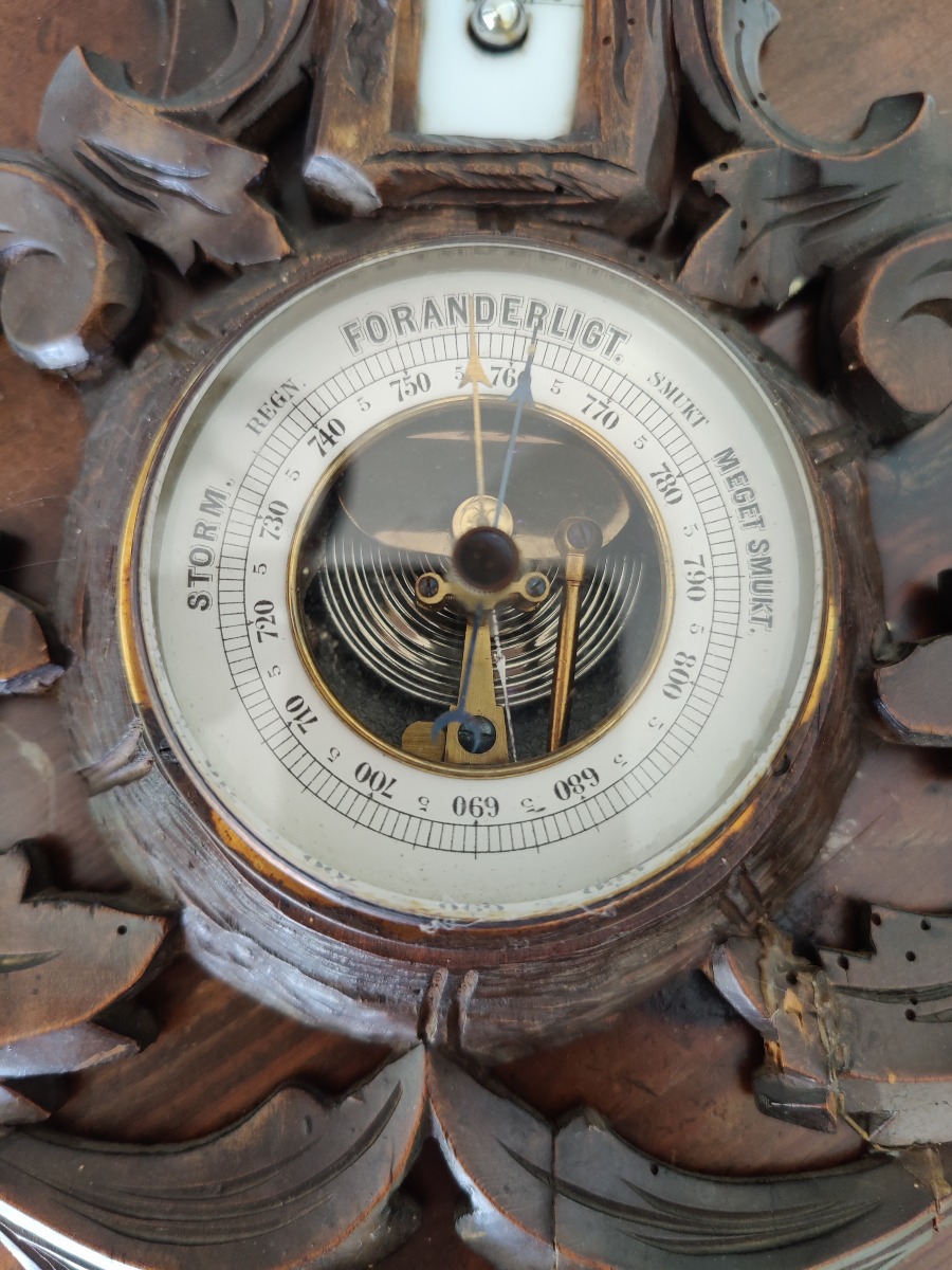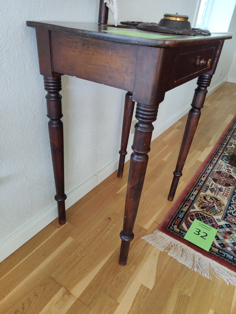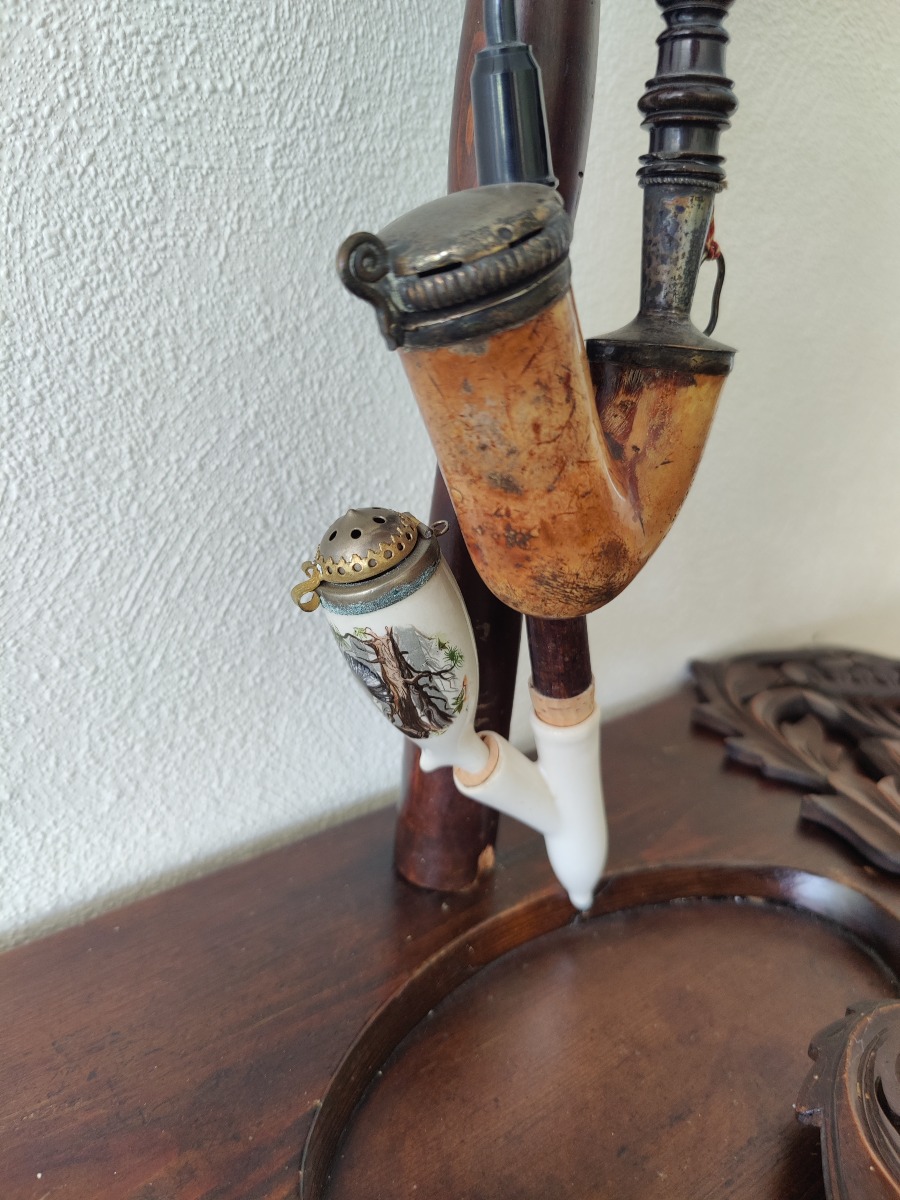 Tobaksbord med piber og barometer. Tobaksbordet måler 42 d x 66 b x 78 h. Total med piber holder 135 cm. Bordet har en skuffe og der medfølger 2 piber samt et barometer i træ der måler 47 h.