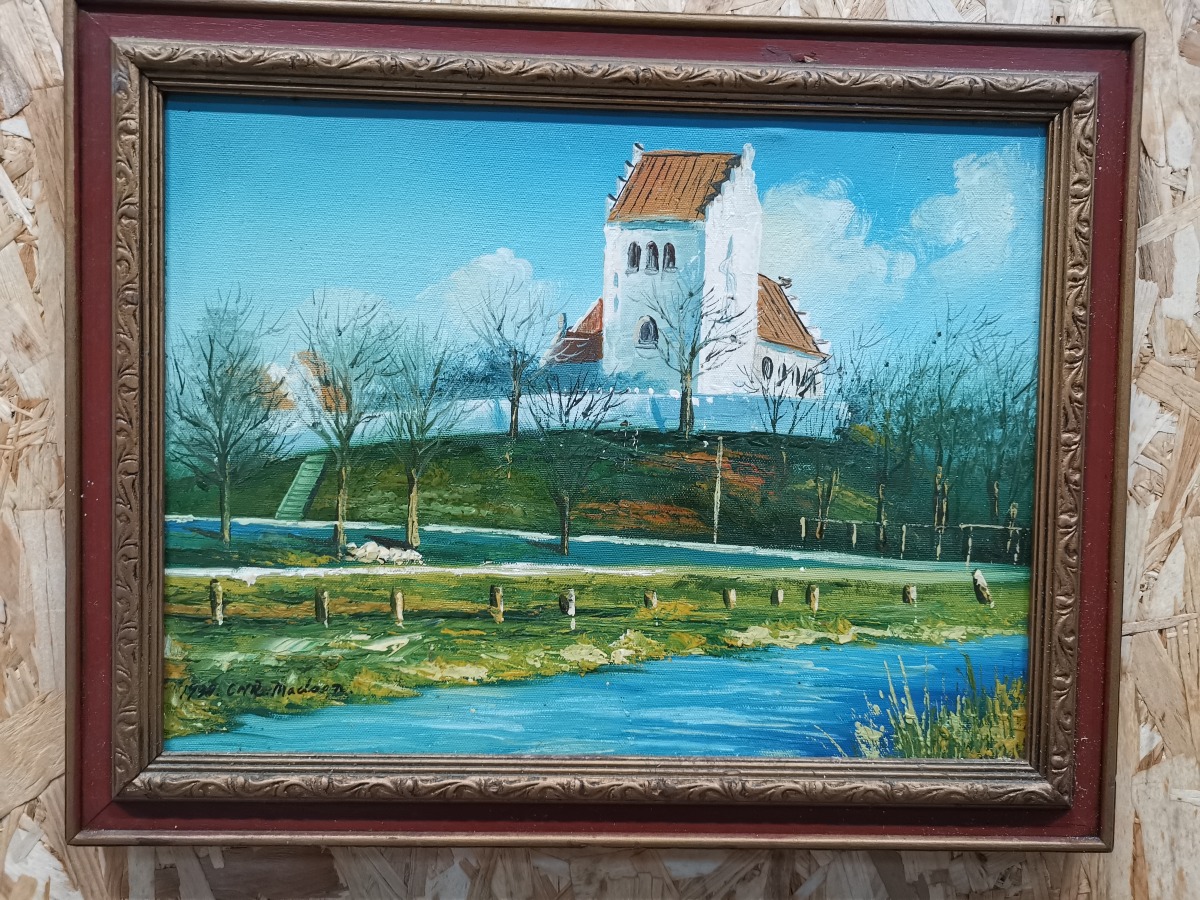 Ubk. kunstner. Olie på lærred. Motiv af landsbykirke. 39 x 49 cm.