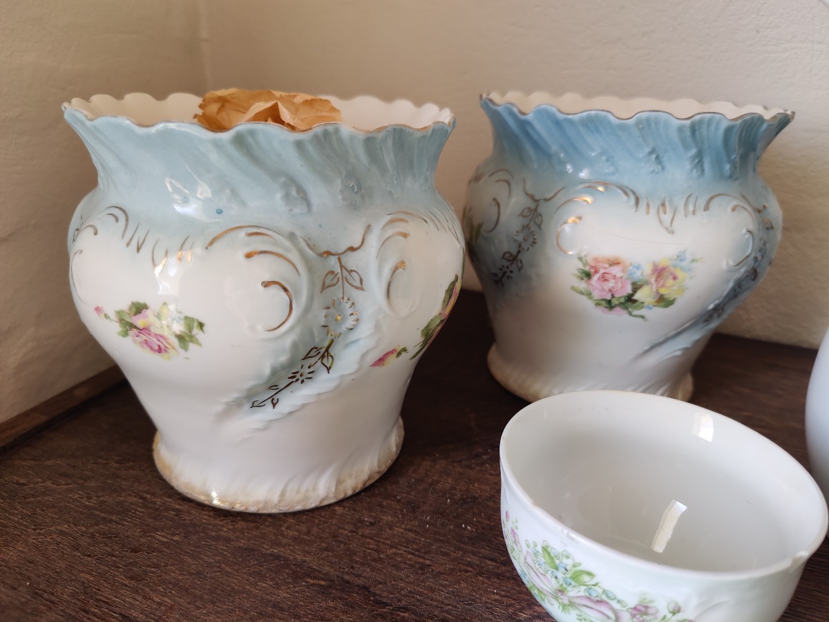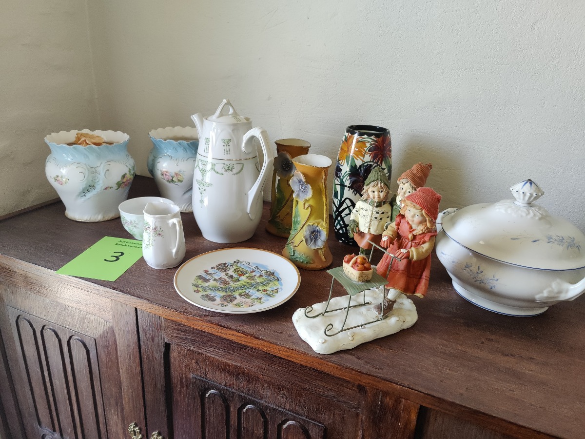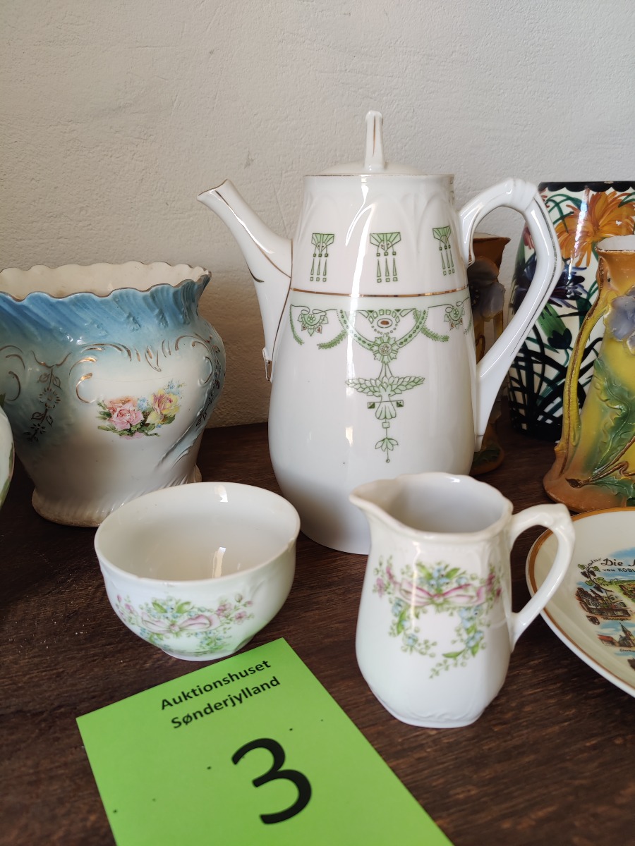 Vintage porcelæn. Urtepotter 2 stk, kaffekande og fløde/sukker skåle, 3 vaser, hvor en en fra Schmberg, dog med skår, og terrin,