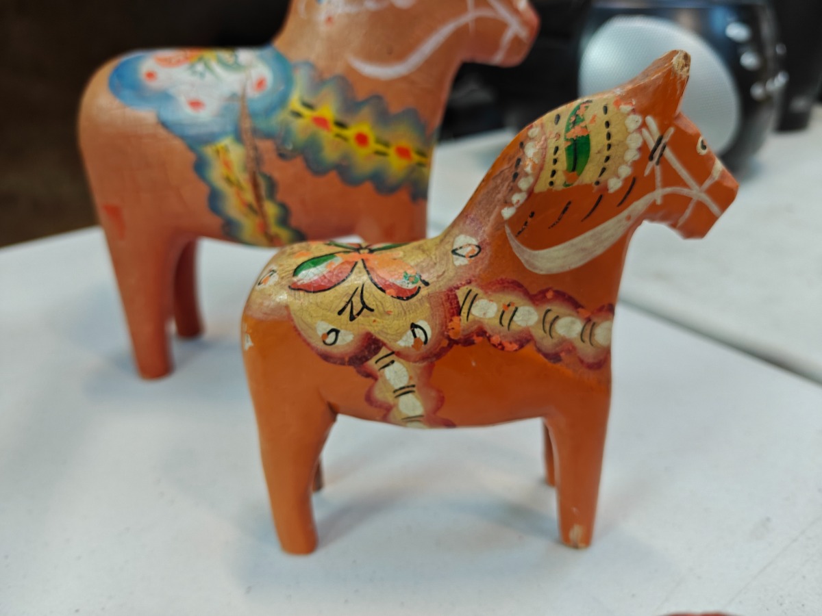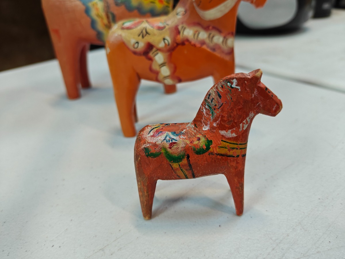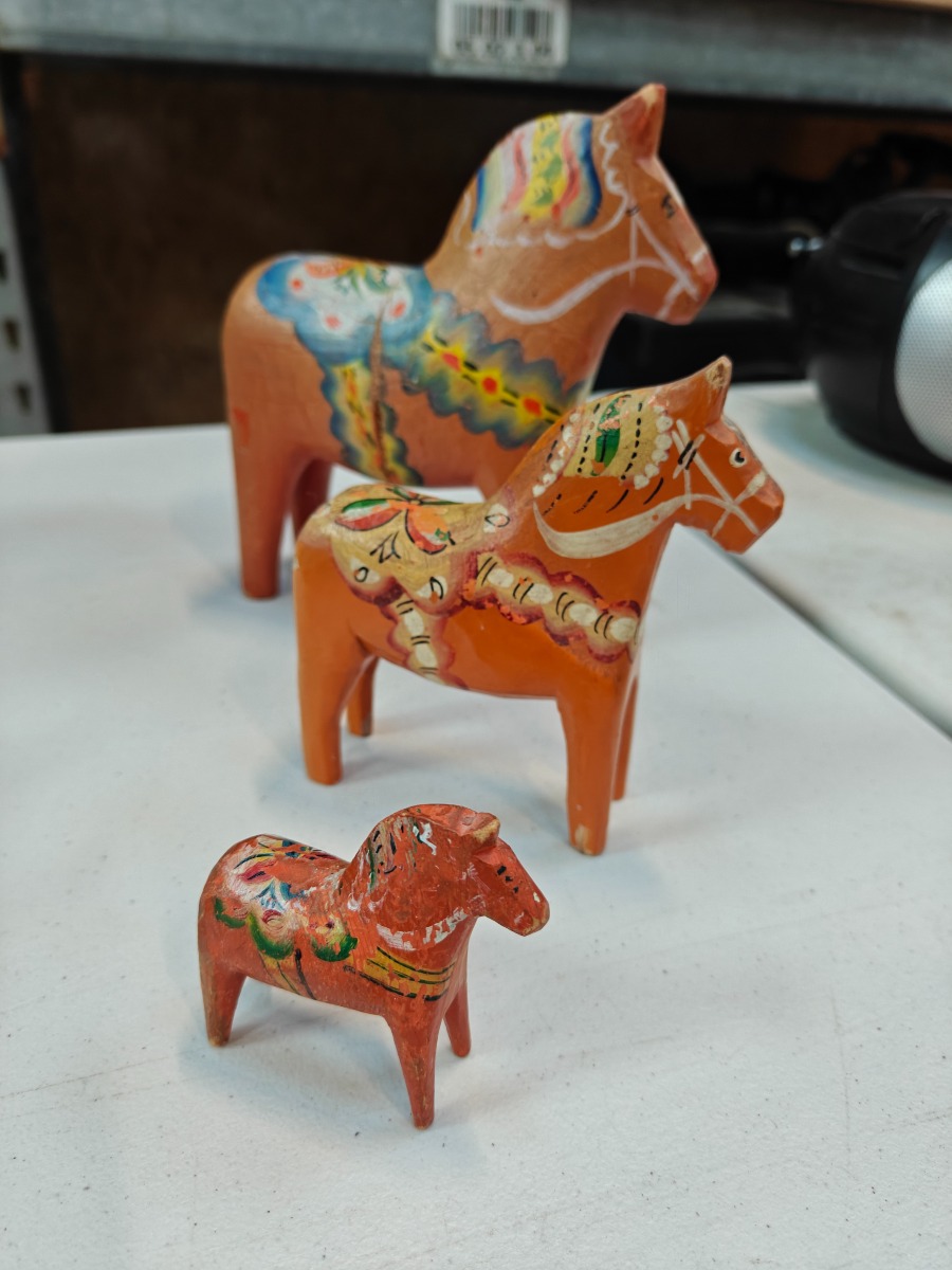 3 Dalarheste. Fremstår med alders relateret patina. H. for største 18 cm.