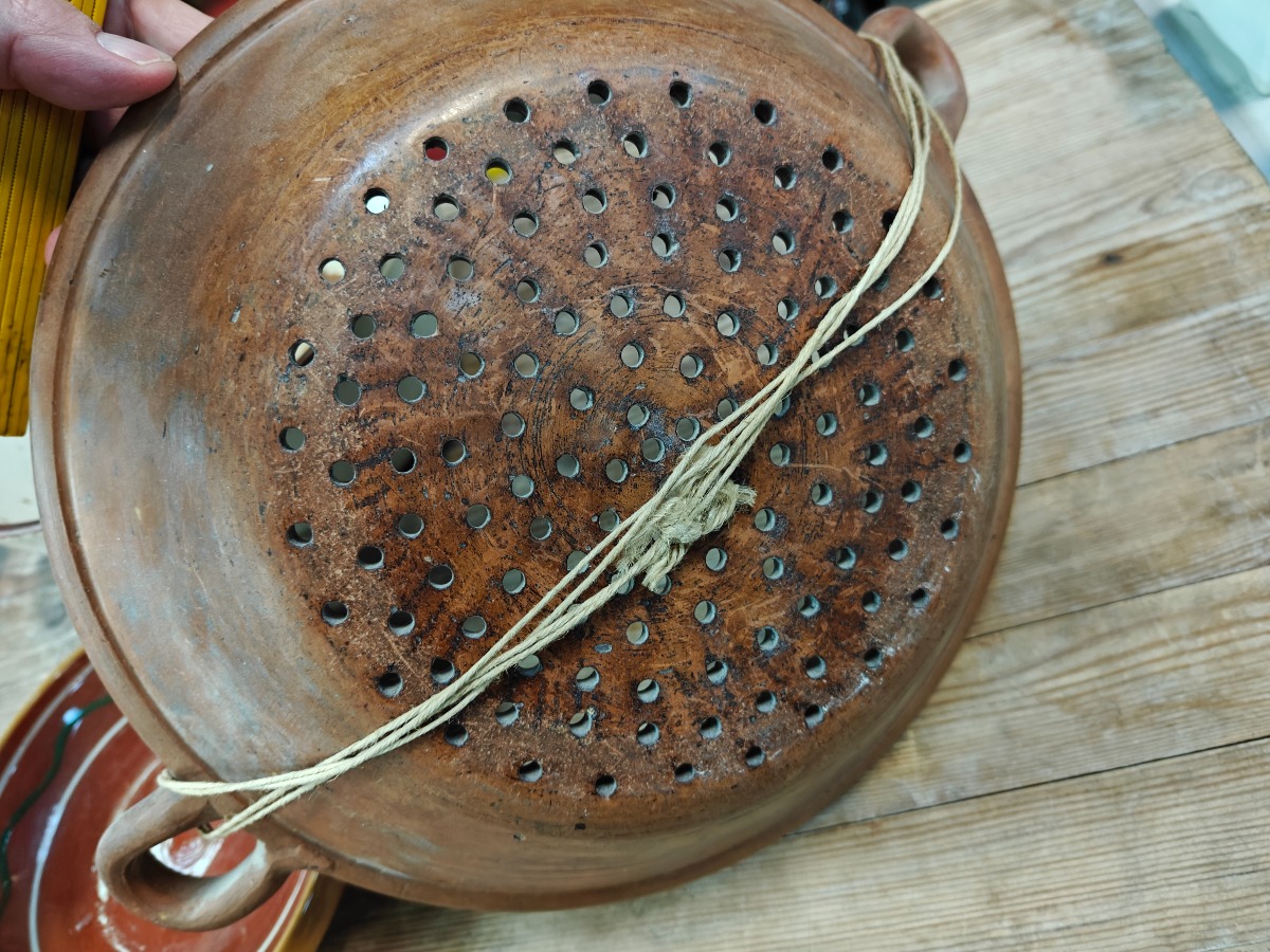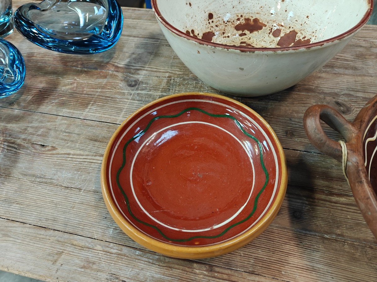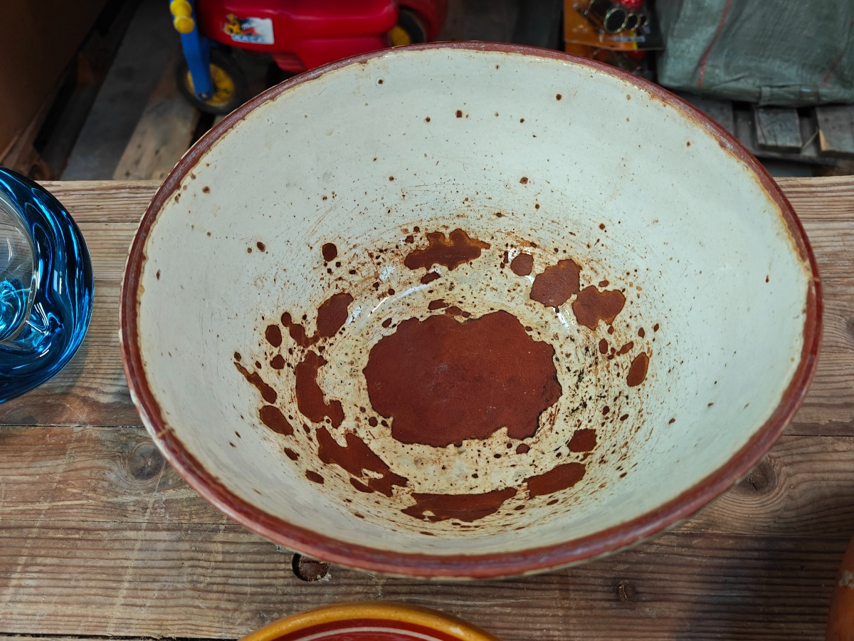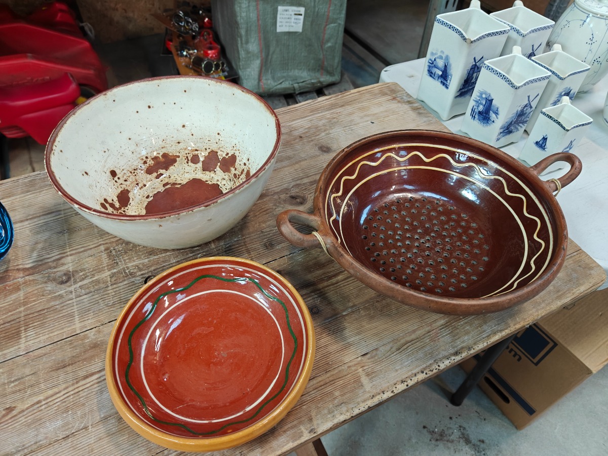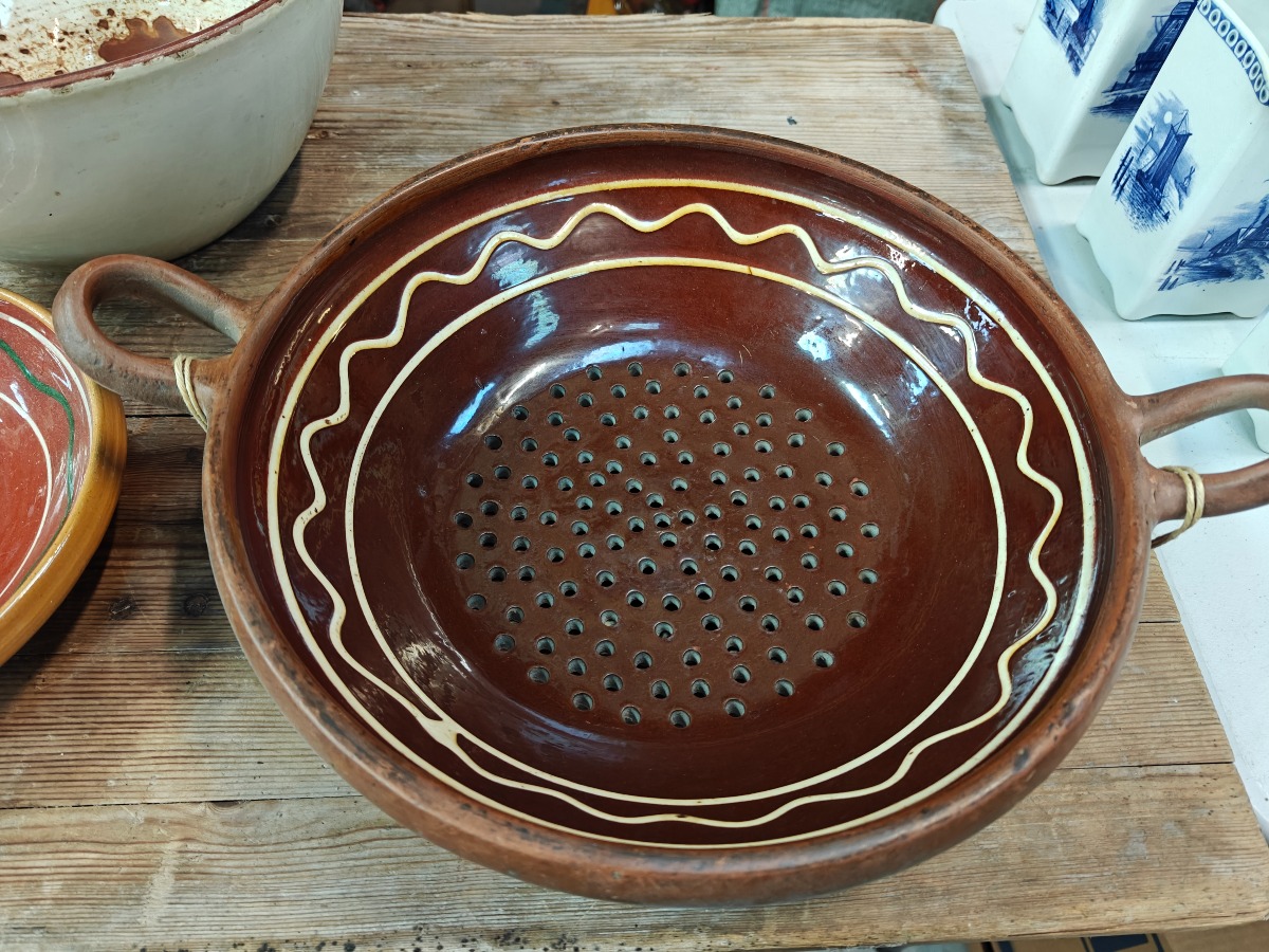 3 dele lertøj. Knabstrup skål med kraftigt slid. Dørslag og fad. Ø. for dørslag. 30 cm.