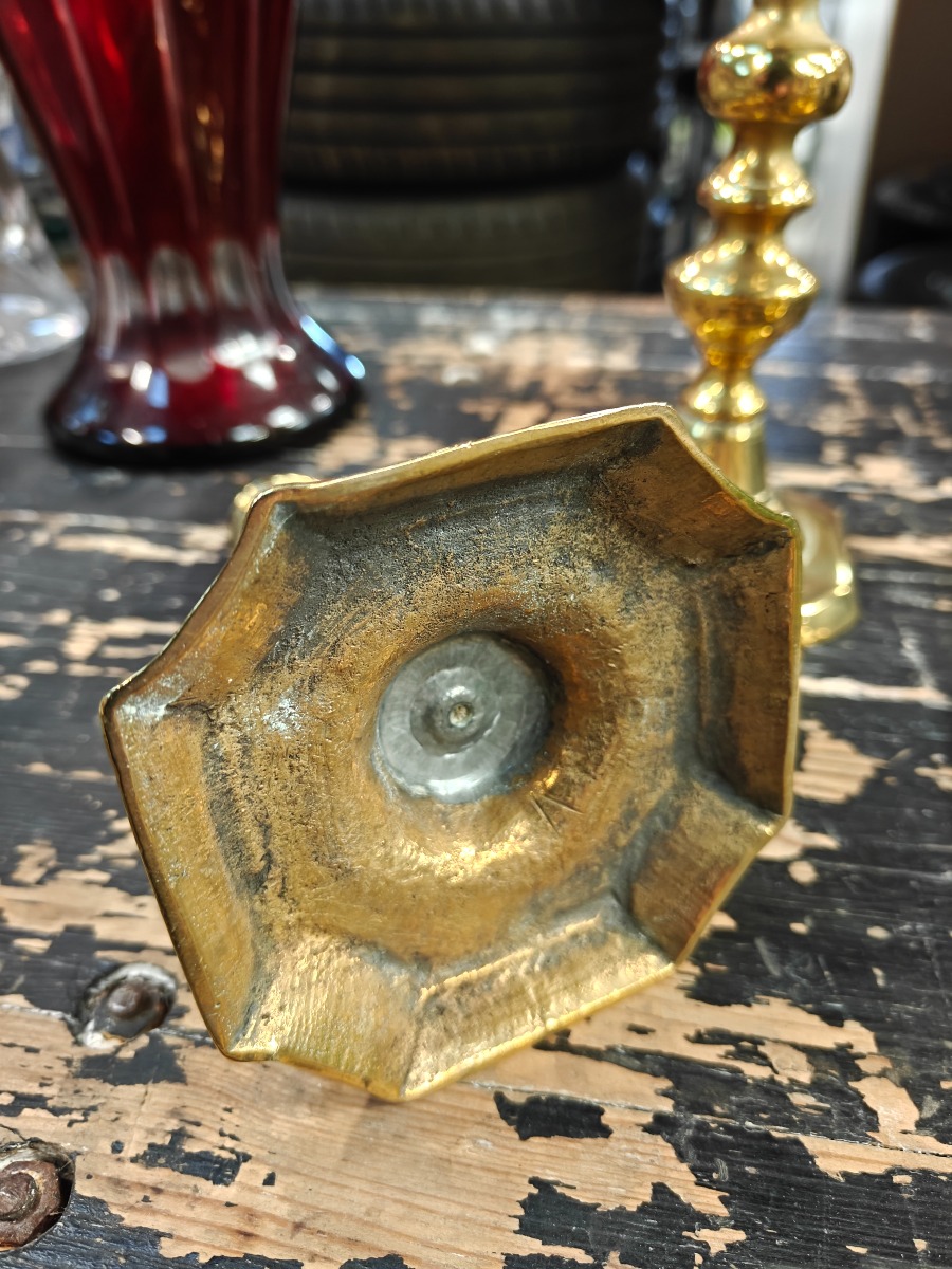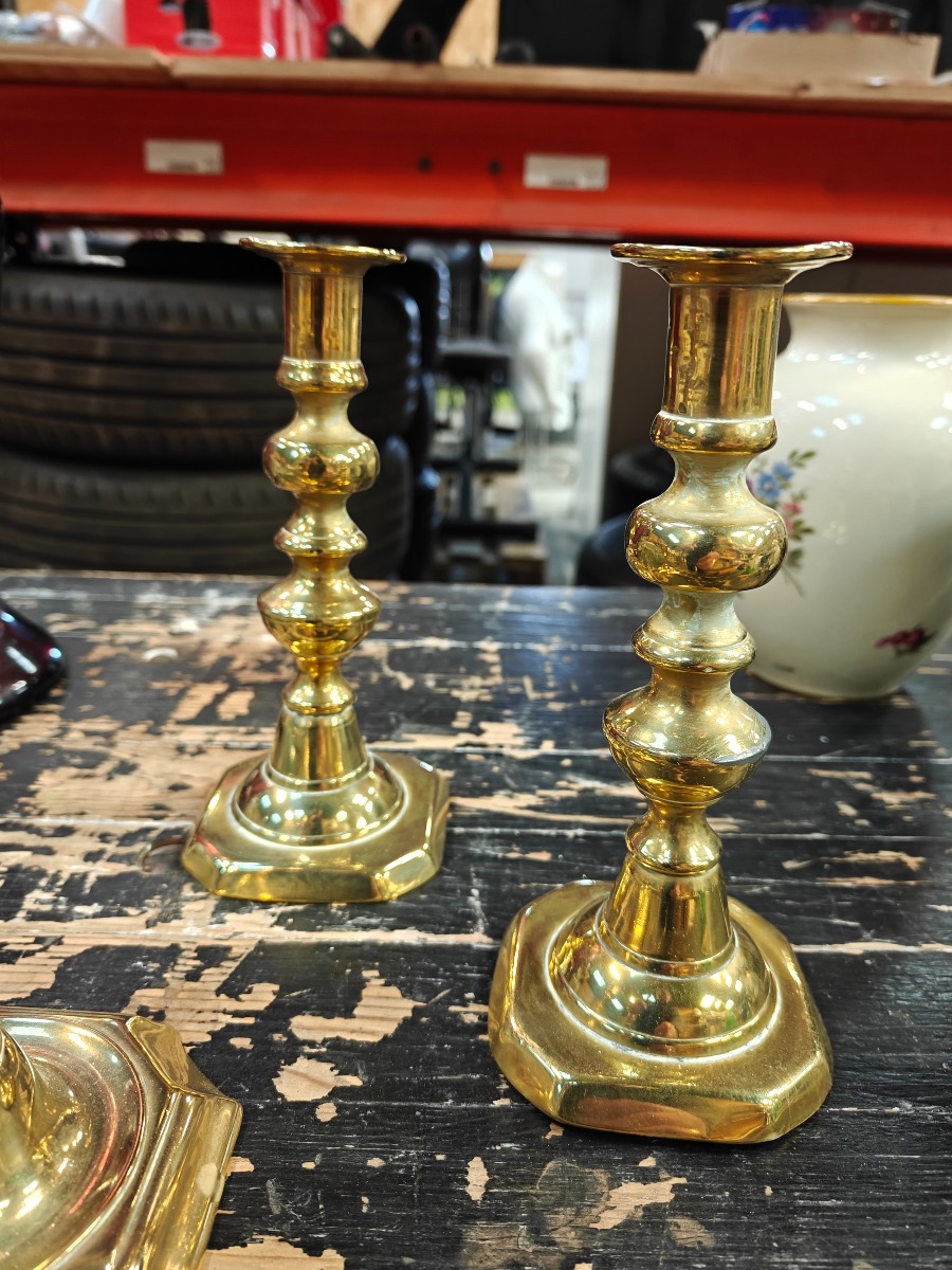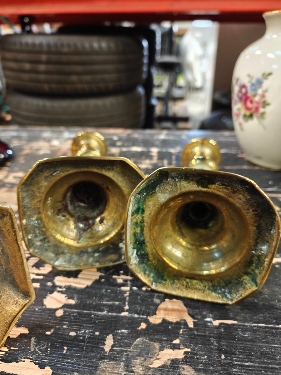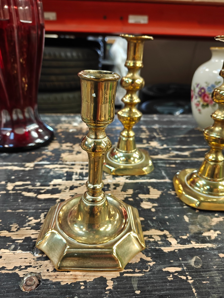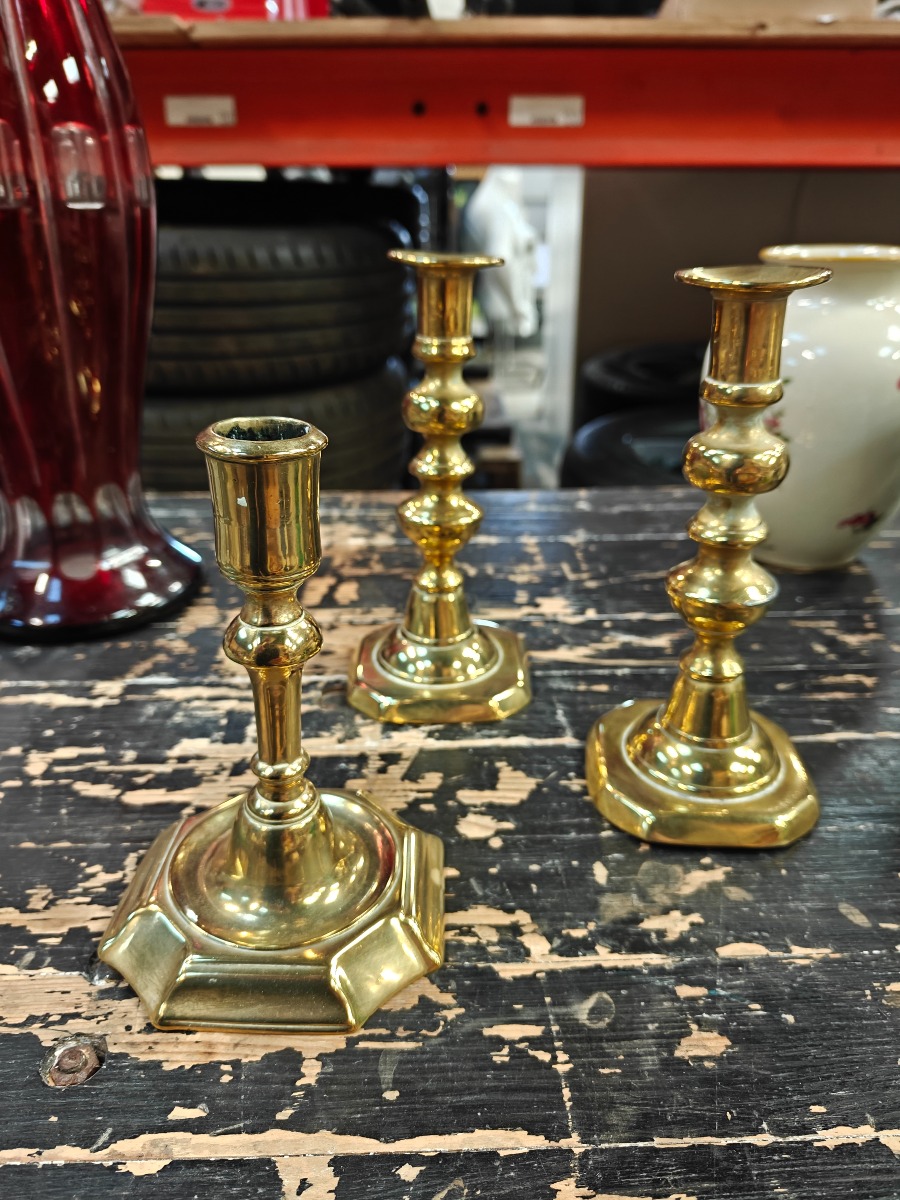 3 messingstager. 1 barok-form samt 2 engelske stager. H. for engelske: 18 cm. Aldersrelateret slid.