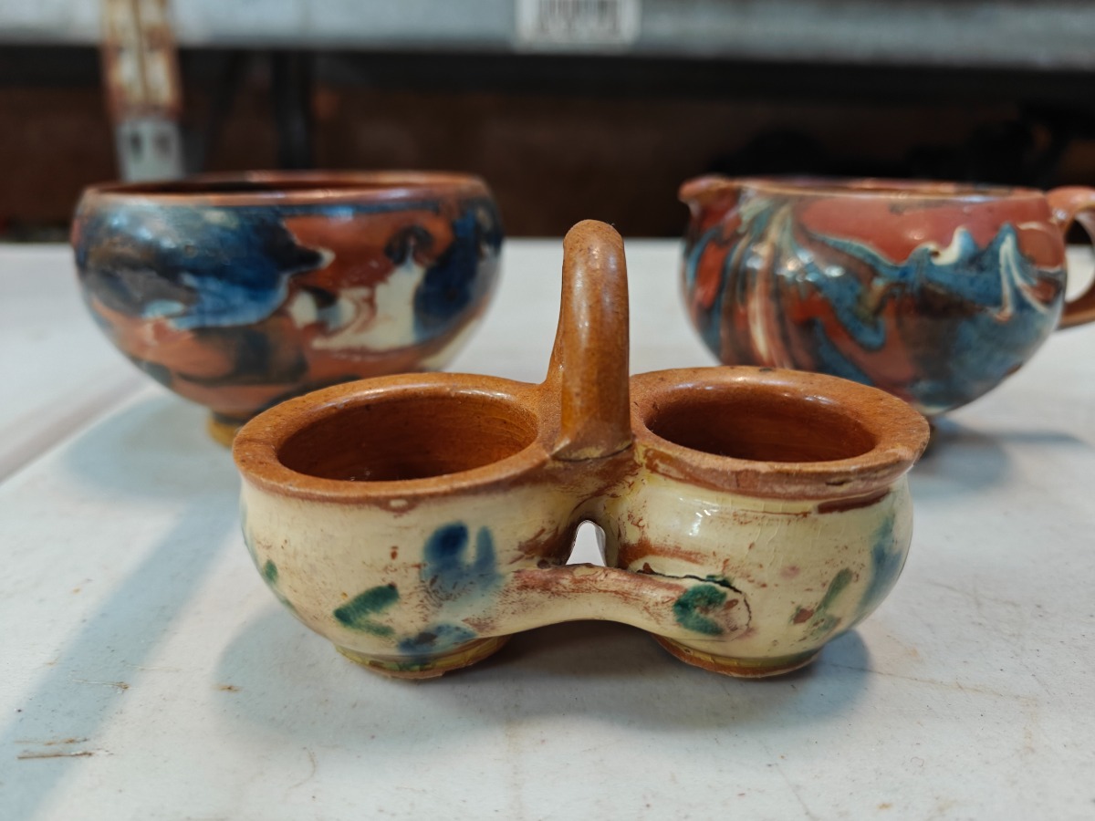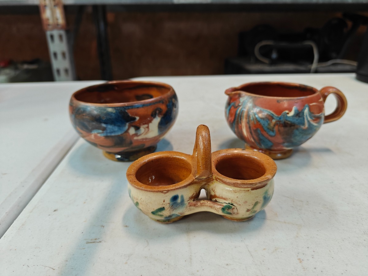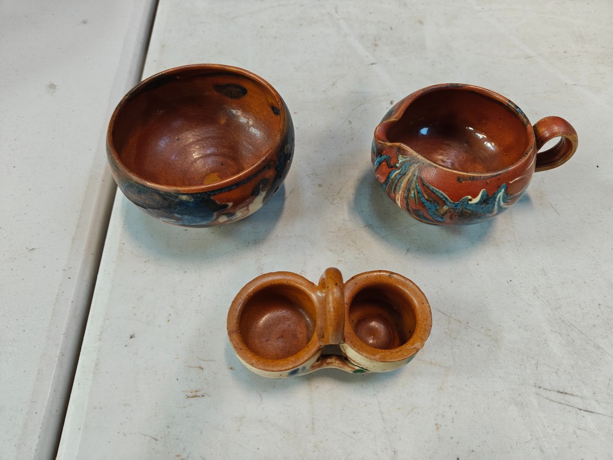 3 små dele lertøj. Sukker/lødesæt samt lille 2-delt skål.