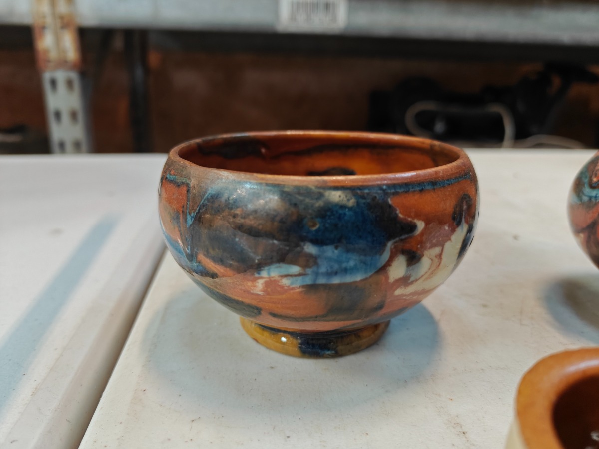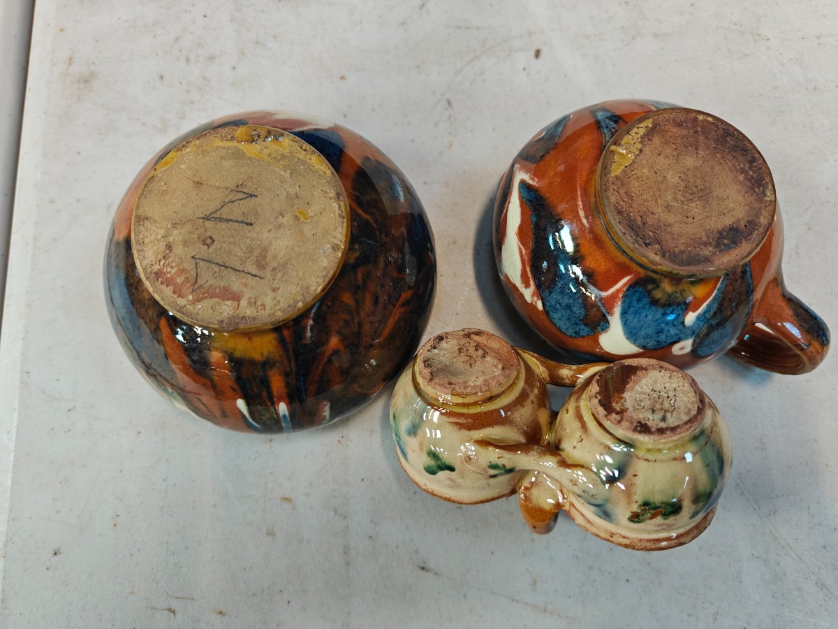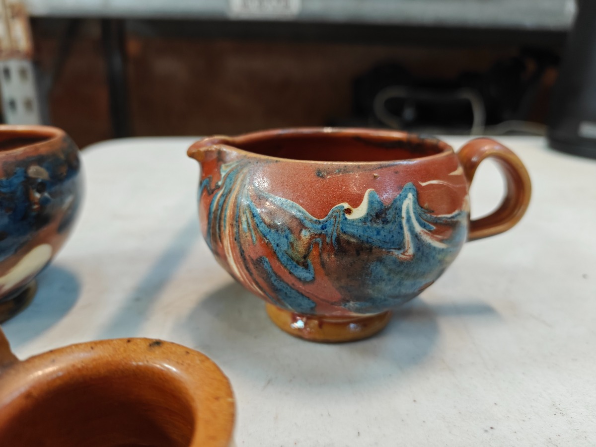 3 små dele lertøj. Sukker/lødesæt samt lille 2-delt skål.