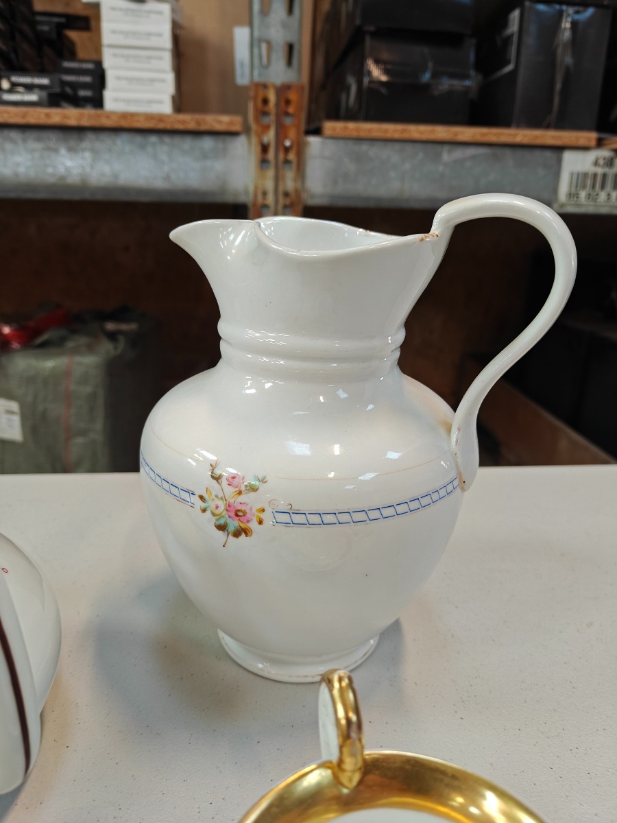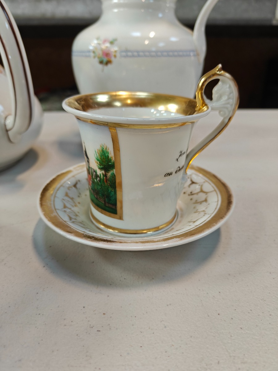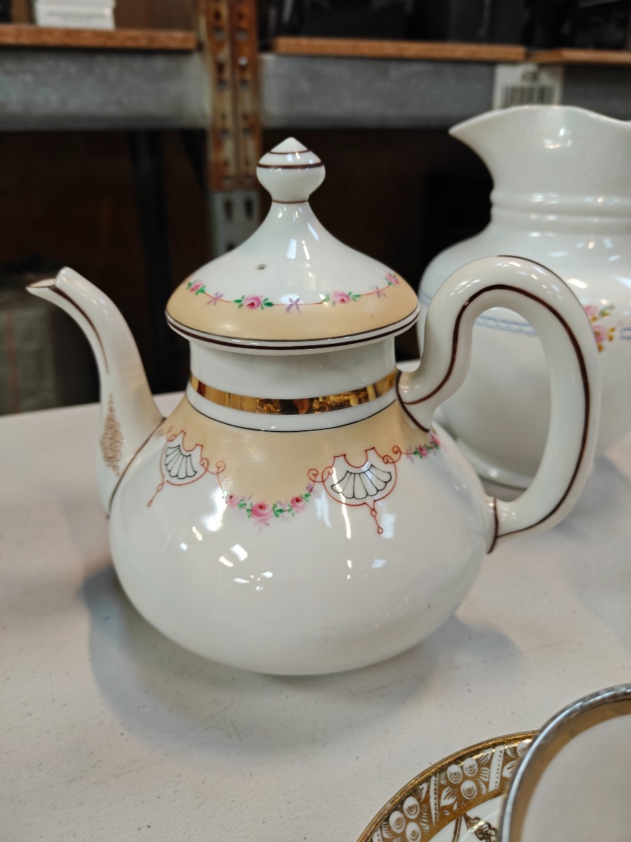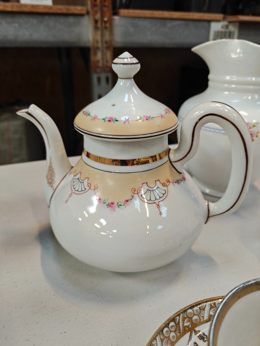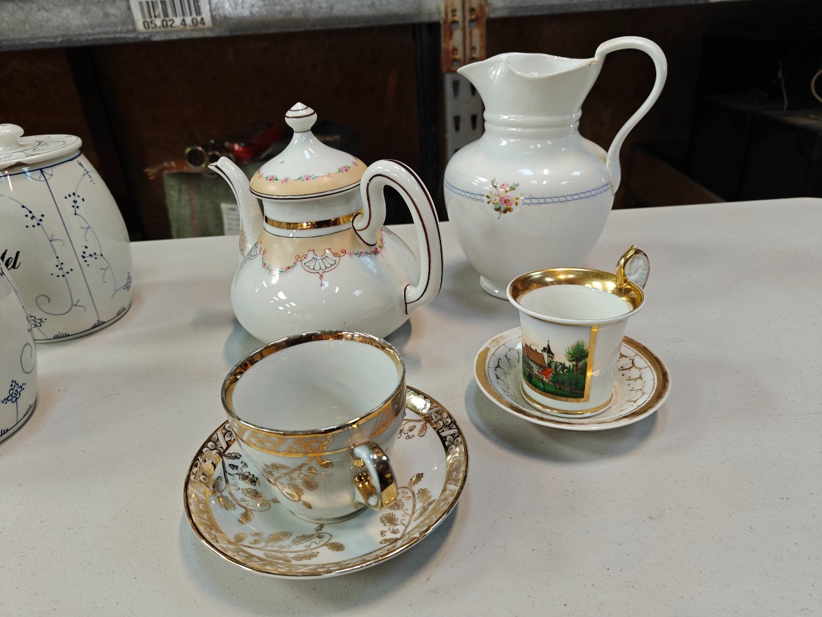 4 dele porcelæn. Stor kande, Måske C.T. Altwasser, Tekande samt 2 prydkopper. Alle dele med aldersrelaterede brugsspor.