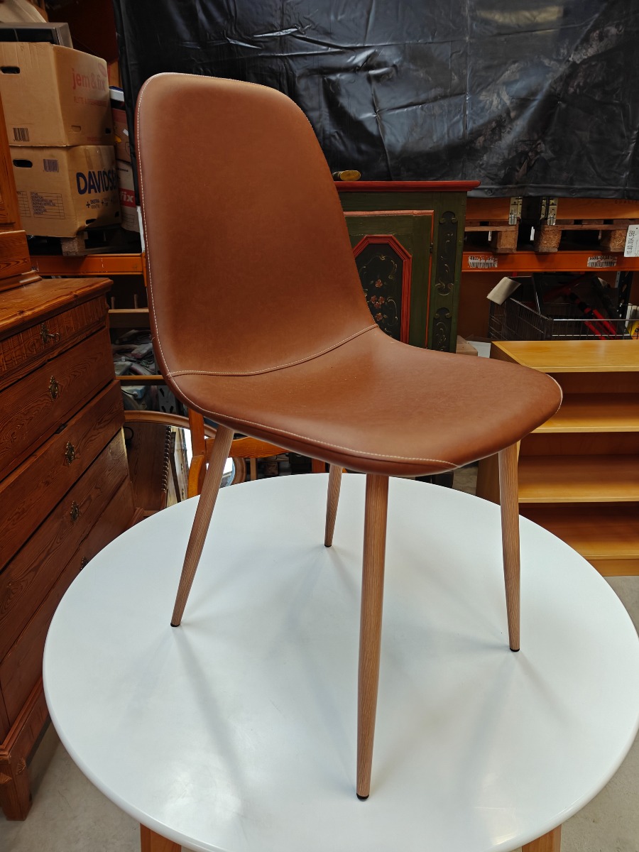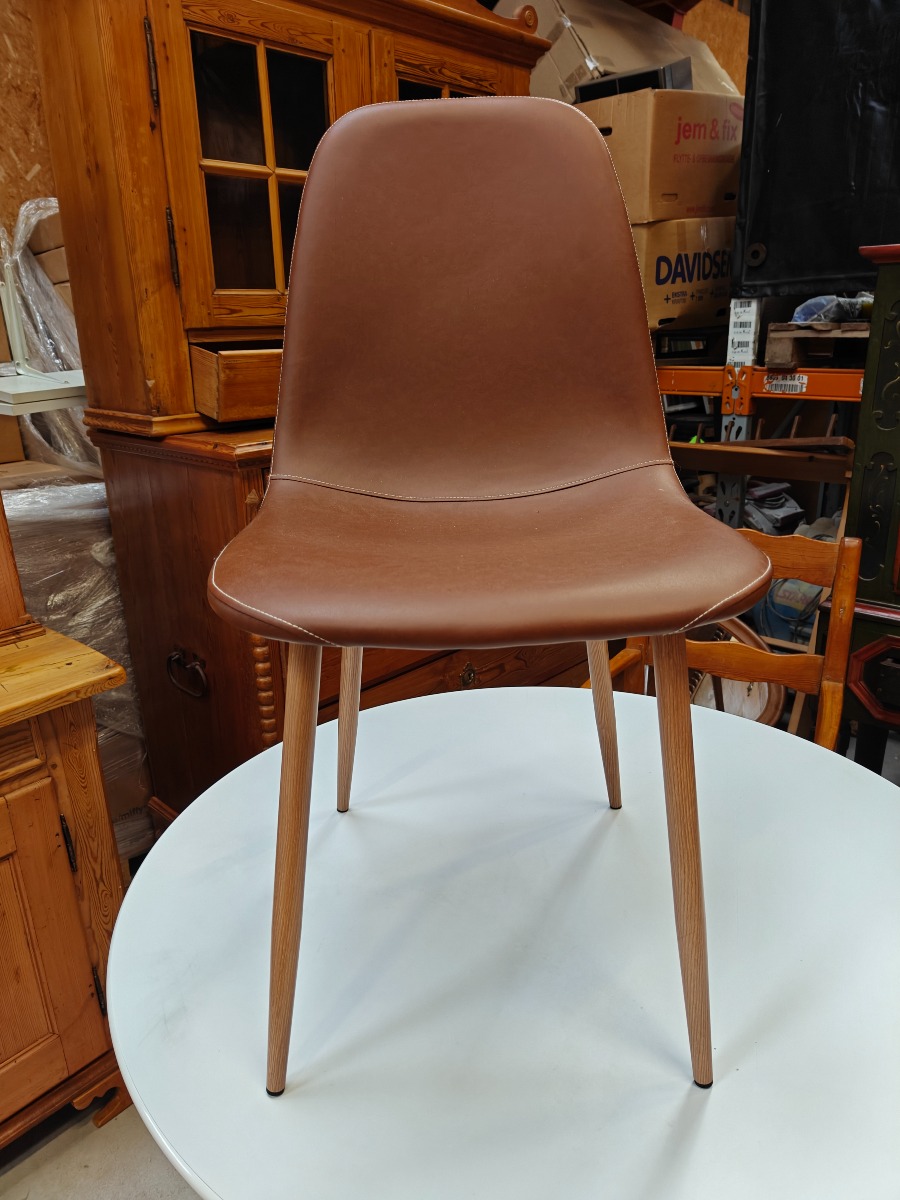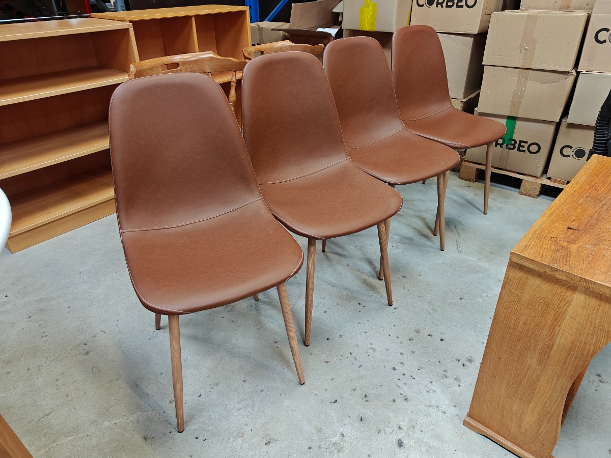 4 spisestuestole med brun kunstlæder. Ben af bøg.
