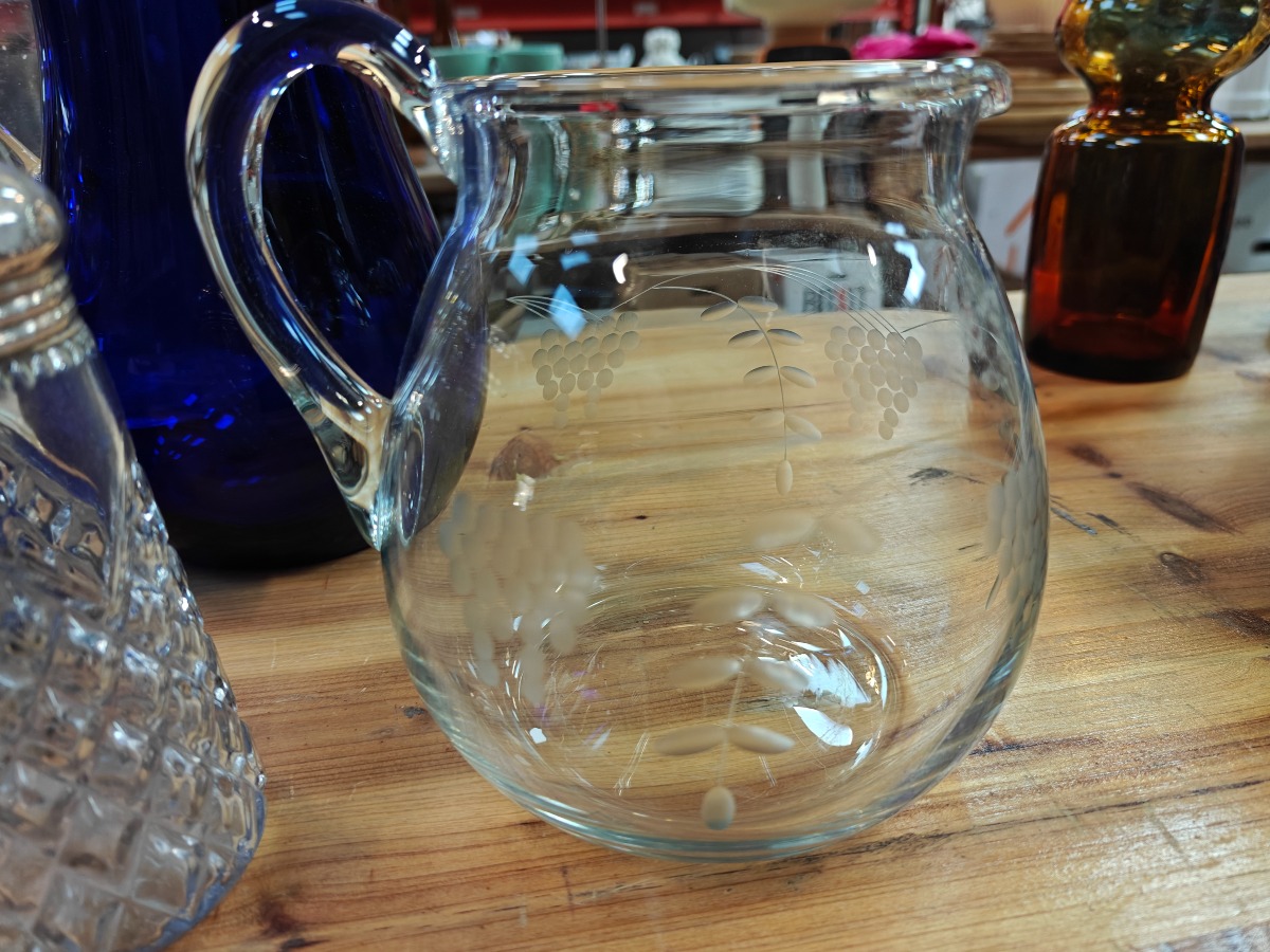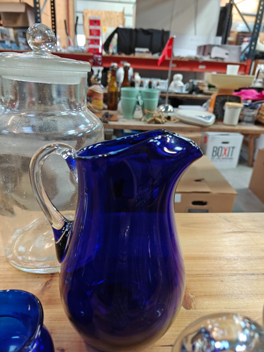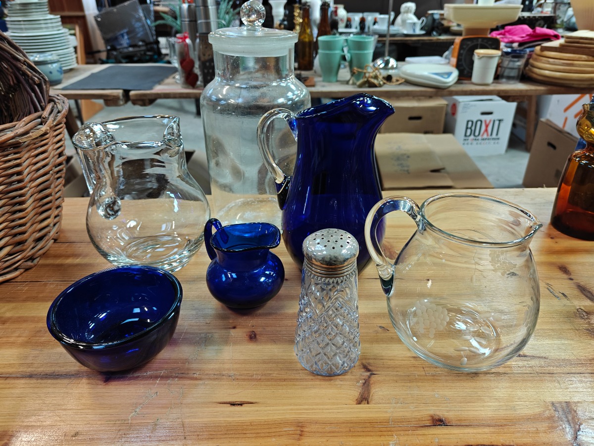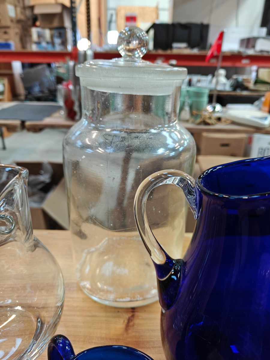 7 dele brugsglas. 4 kander, 2 blå, lille skål, sukkerstrø og stort opbevaringsglas. H- for sidstnævnte 25 cm.