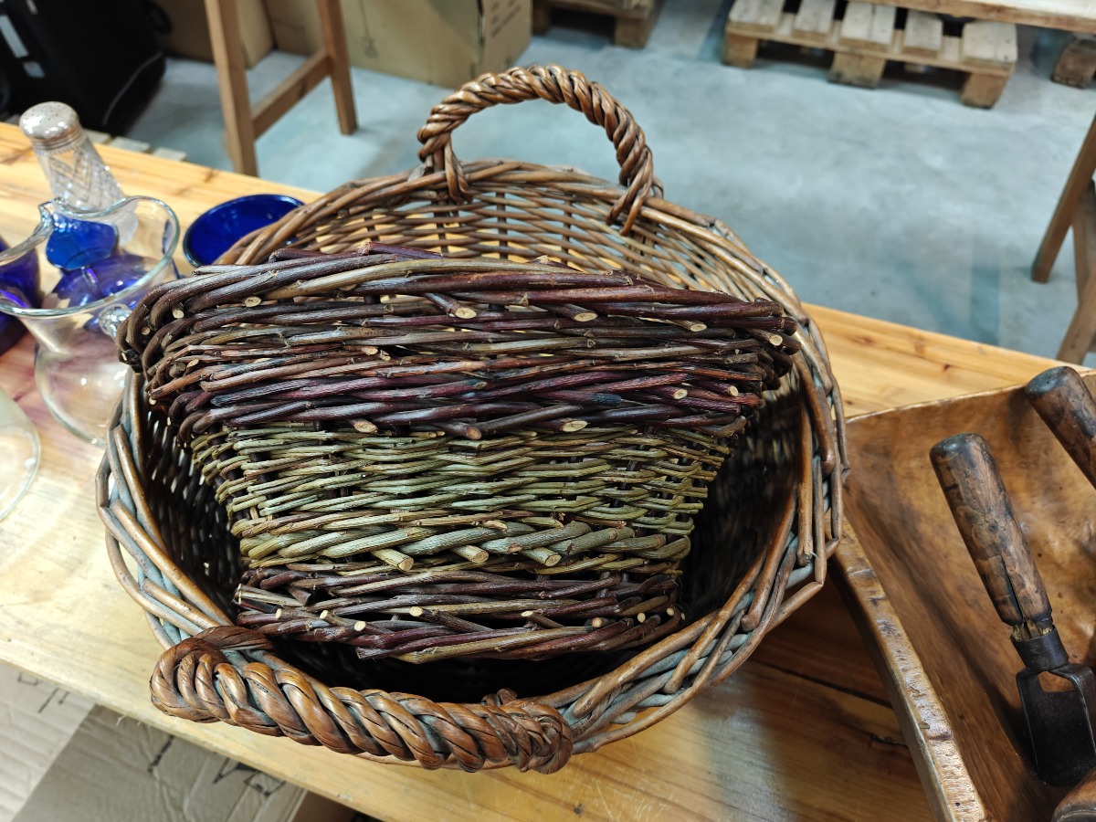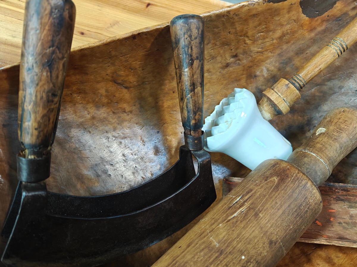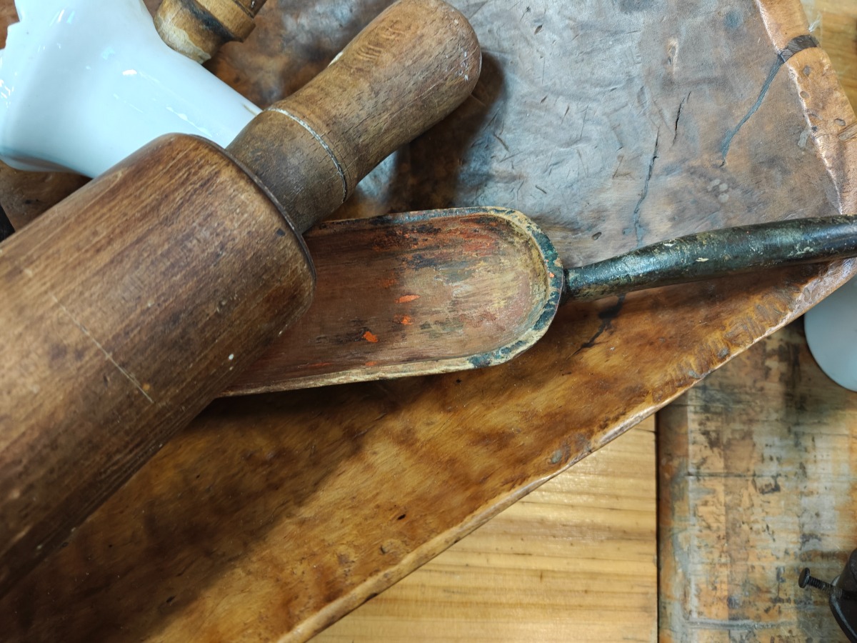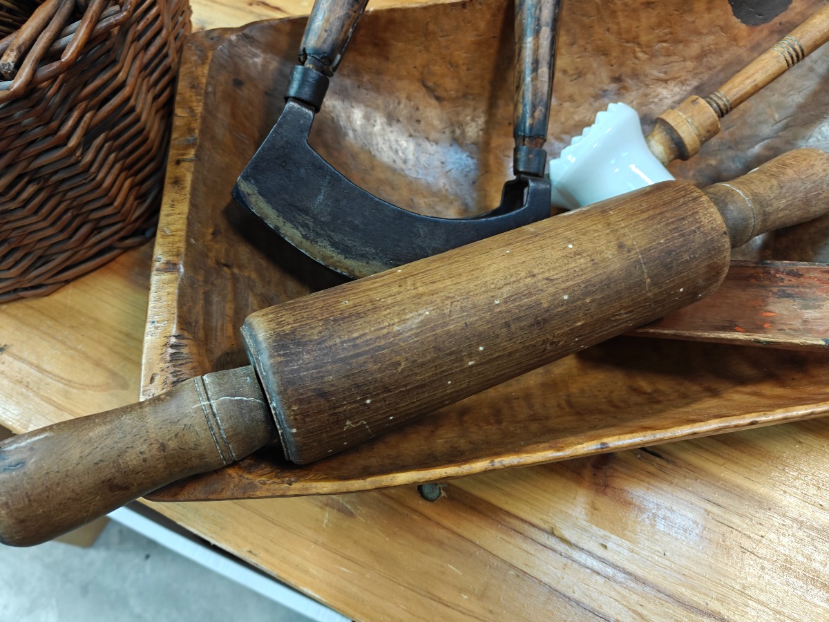 Ældre køkkengrej samt kurve. Sulefad med rep. kagerulle, hakkejern, ske og kødhammer samt 2 kurve af pil. L. for sulekar 45 cm.