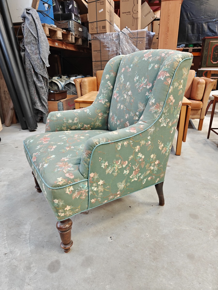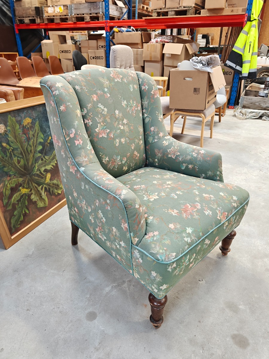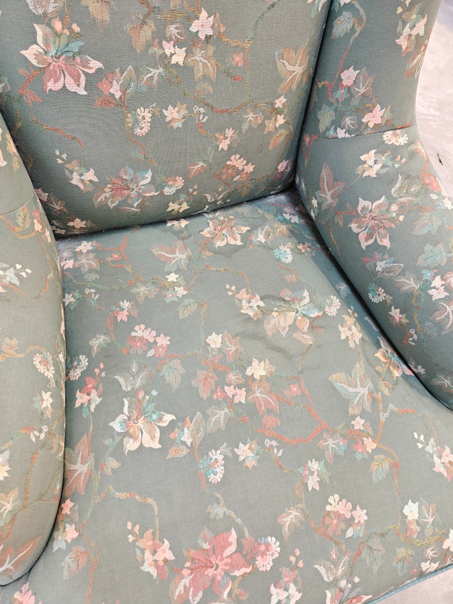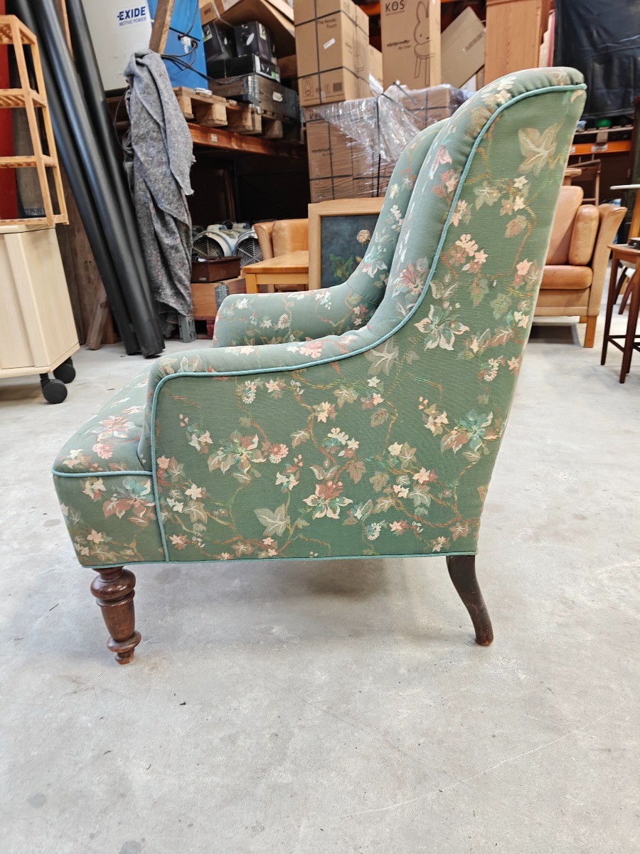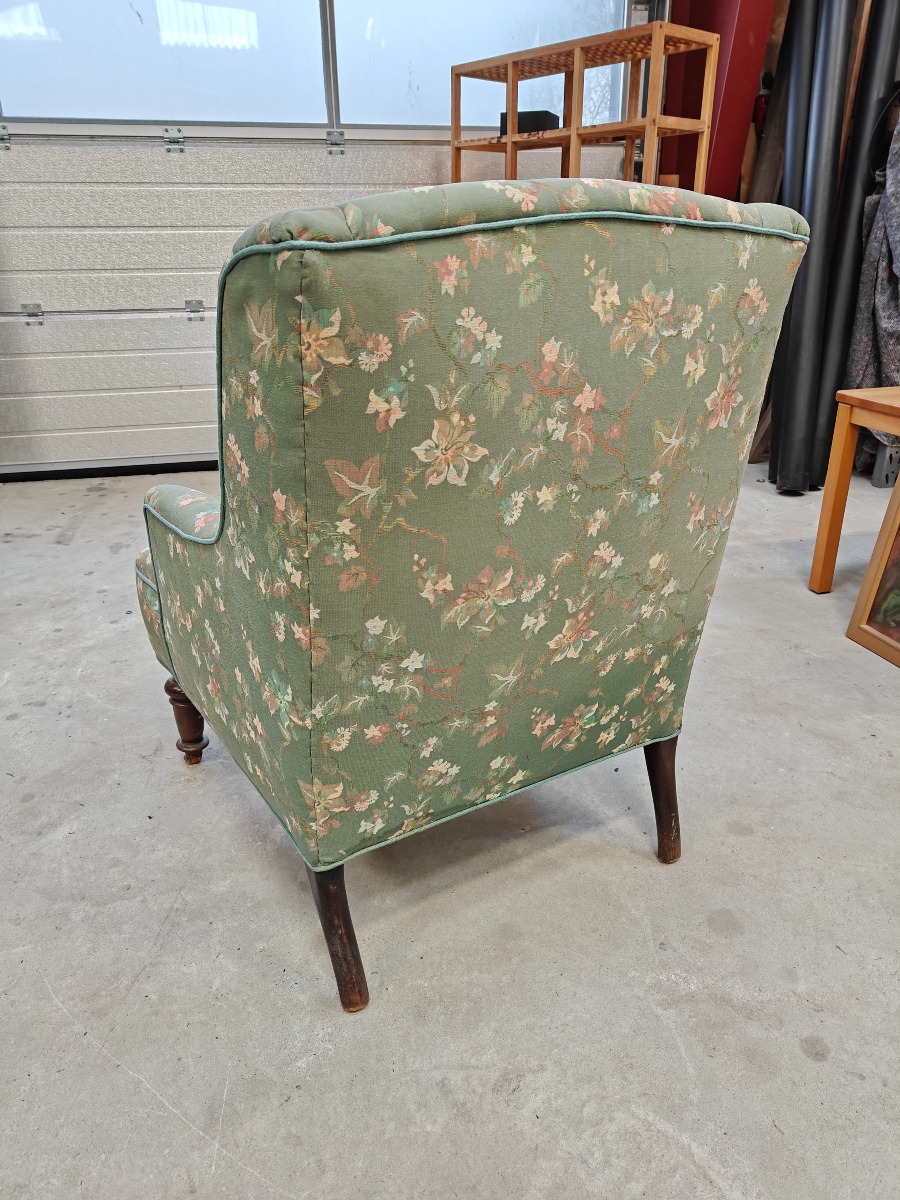 Hvilestol med grøn brokade, på mørkbejdsede ben. Brokade med enkelte skjolder.
