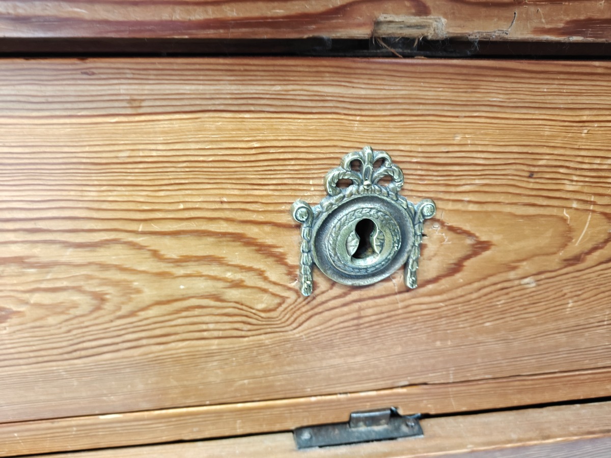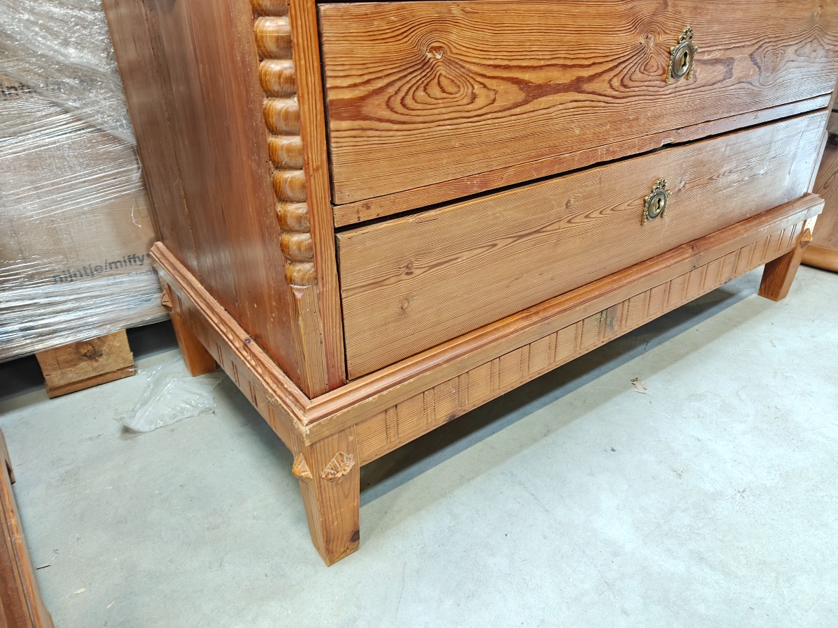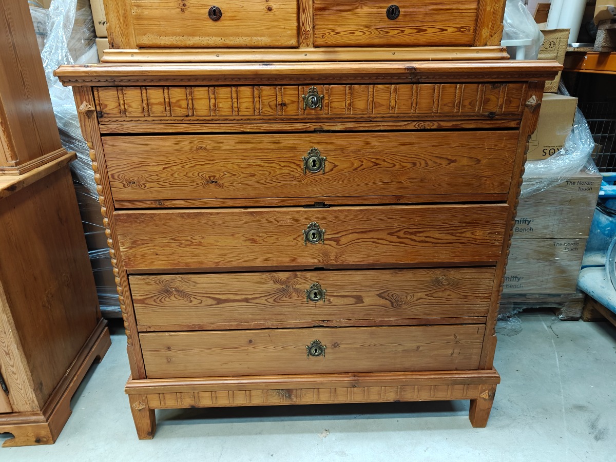 Louis XVI dragkiste af fyr. 5 skuffer i front. Aldersbe3tinget  slid og patina. H. 120, B. 122, D. 58 cm.