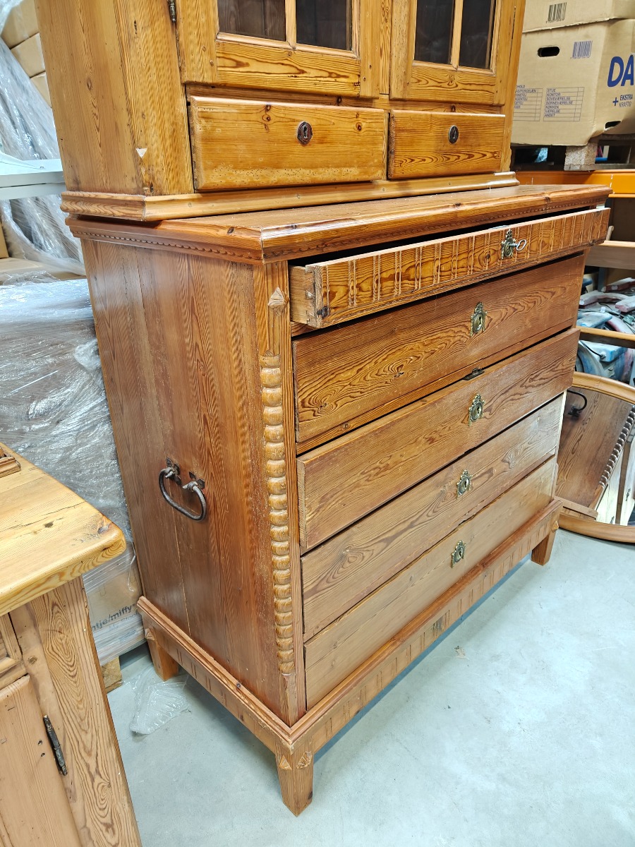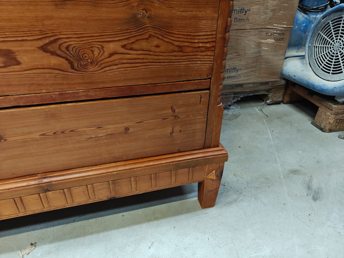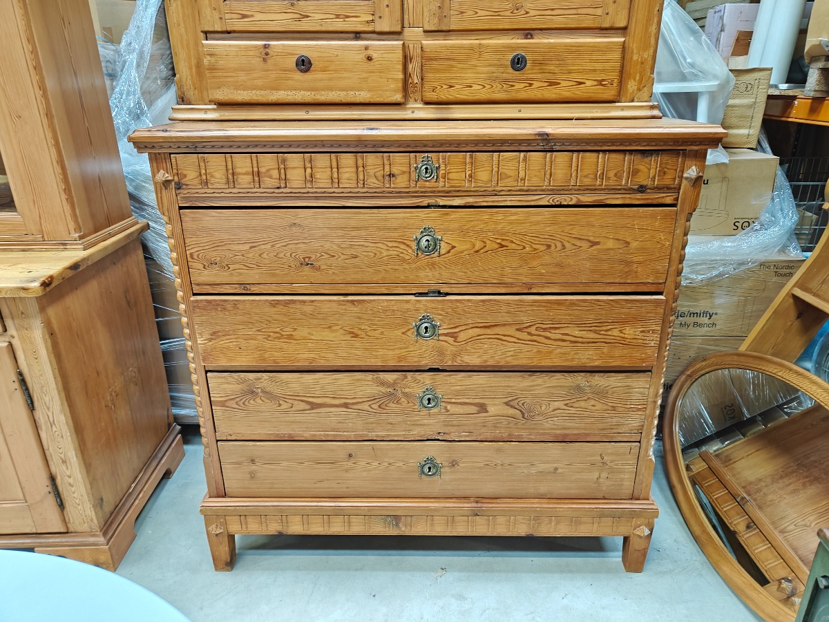 Louis XVI dragkiste af fyr. 5 skuffer i front. Aldersbe3tinget  slid og patina. H. 120, B. 122, D. 58 cm.
