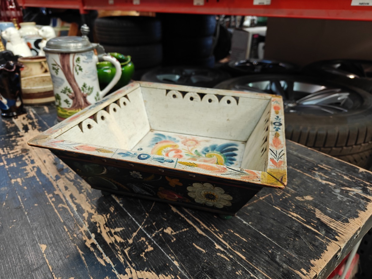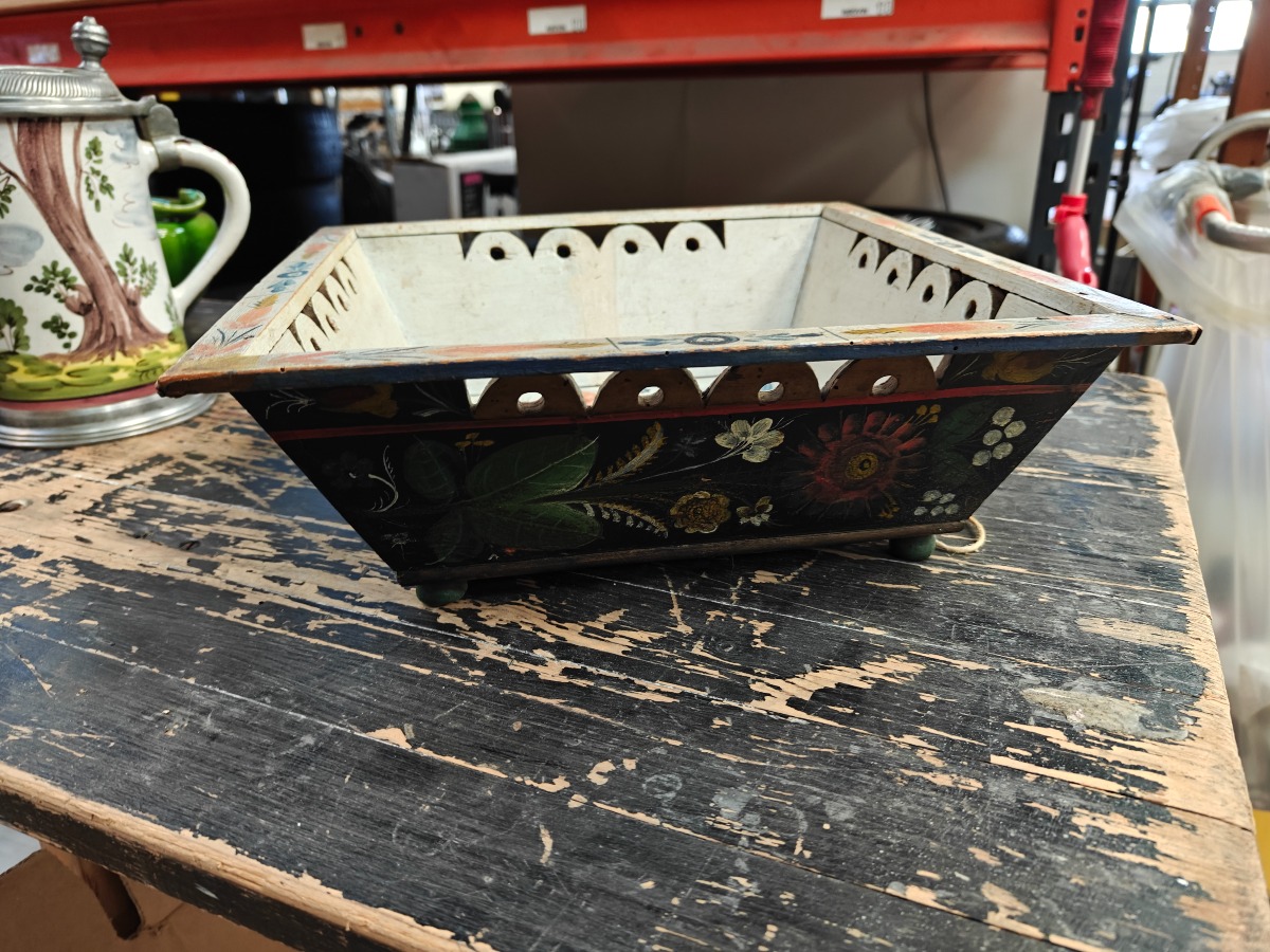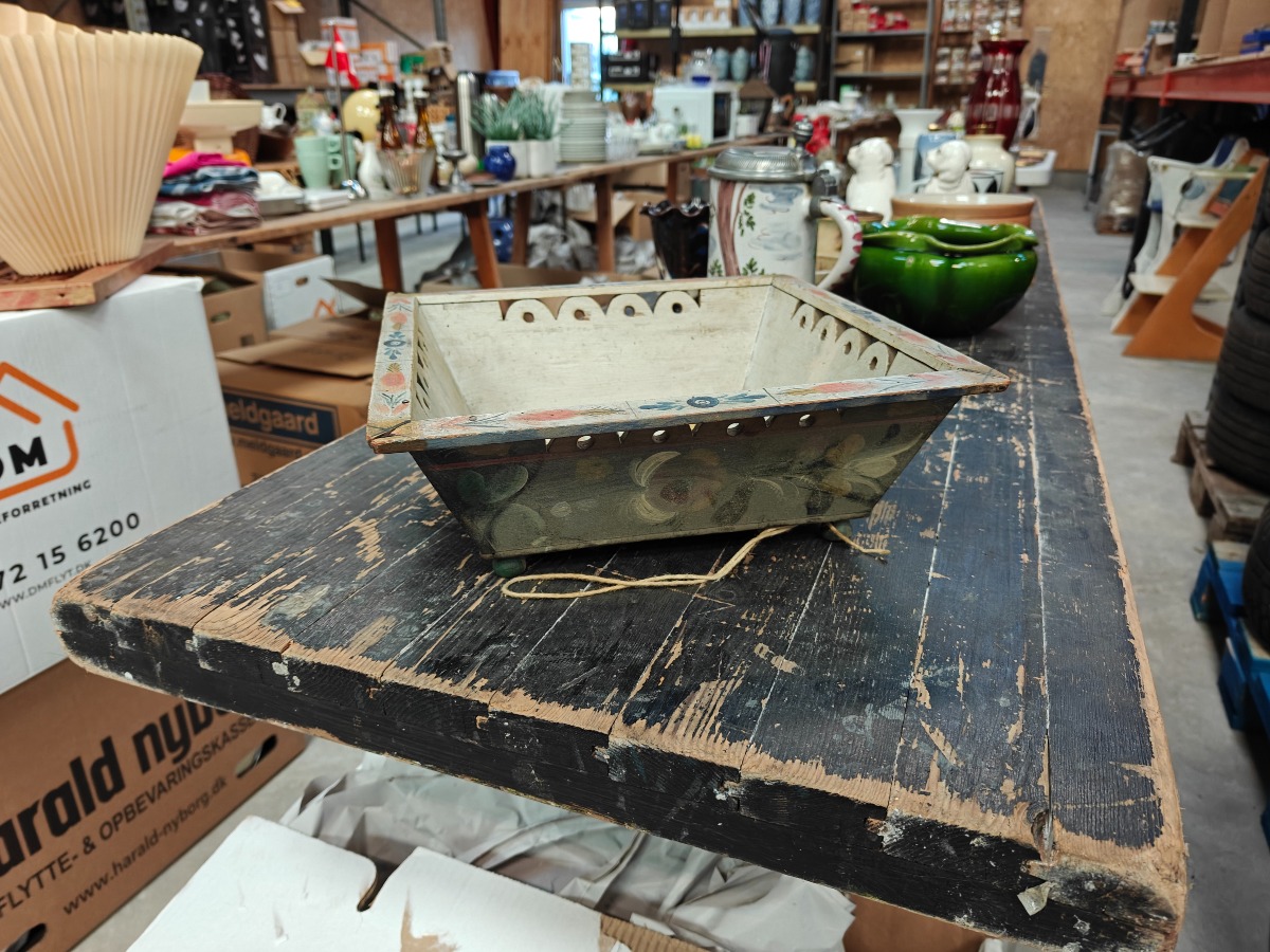 Norsk almuemalet kurv af fyr. Gennembrudte kanter. Rigt dekoreret. H. 10, B. x D. 30 x 30 cm.