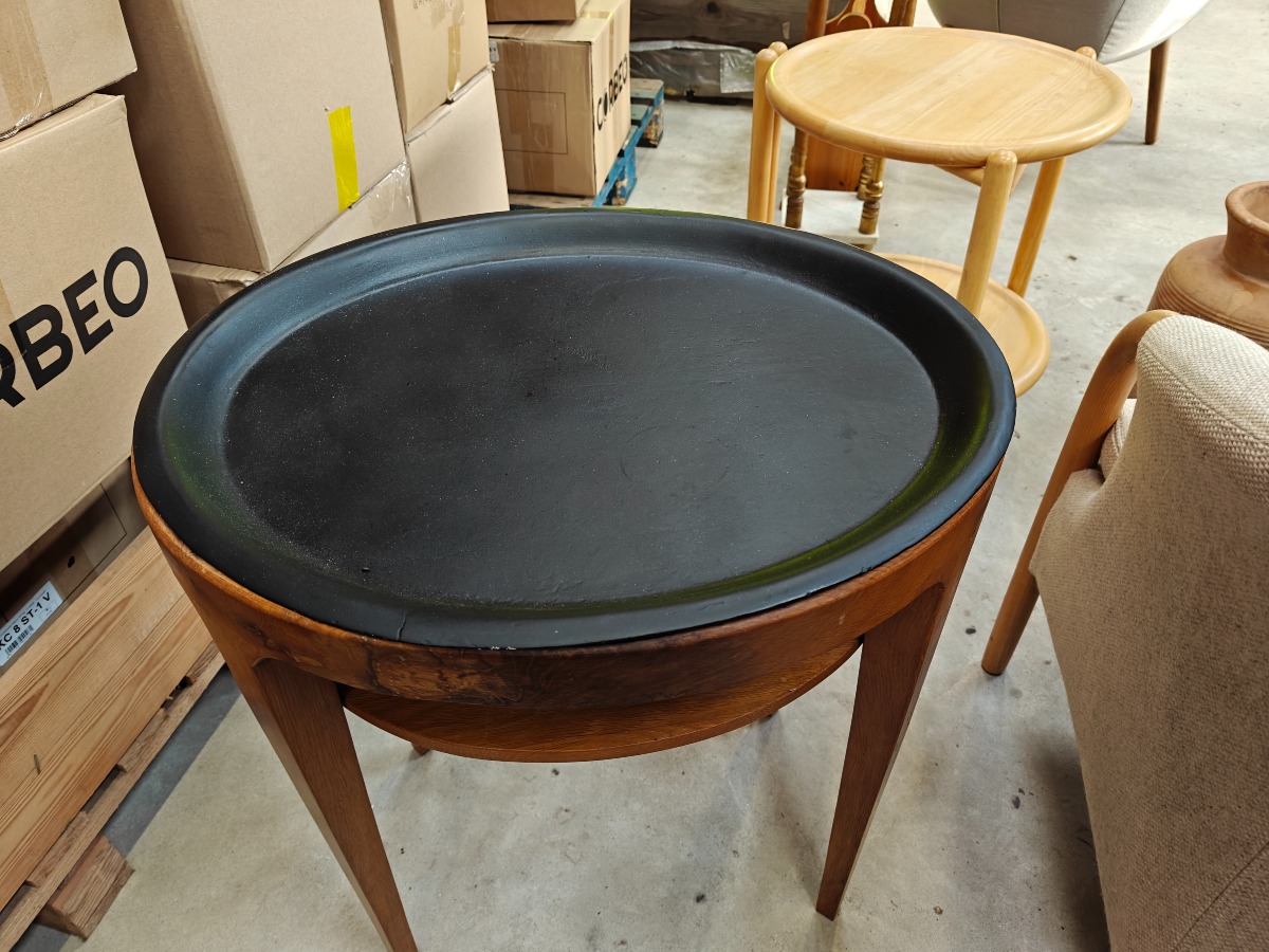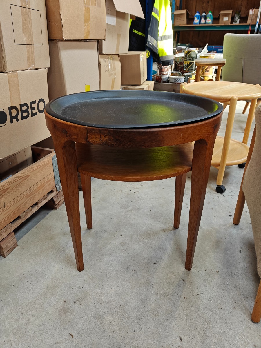 Ovalt bakkebord af eg. Metalbakke øverst med senere sort lakering. H: 65, B. 56, D. 47 cm.